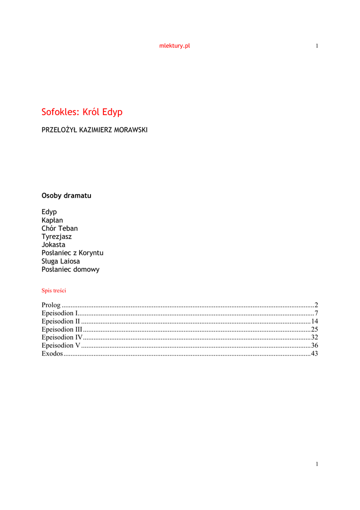 mlektury.pl 1 Sofokles: Król Edyp PRZEŁOśYŁ KAZIMIERZ MORAWSKI Osoby dramatu Edyp Kapłan Chór Teban Tyrezjasz Jokasta Posłaniec z Koryntu Sługa Laiosa Posłaniec domowy Spis treści Prolog ...............................................................................................................................................2 Epeisodion I......................................................................................................................................7 Epeisodion II ..................................................................................................................................14 Epeisodion III.................................................................................................................................25 Epeisodion IV.................................................................................................................................32 Epeisodion V ..................................................................................................................................36 Exodos............................................................................................................................................43 1 mlektury.pl 2 Prolog Edyp O dzieci, Kadma starego potomstwo, Czegoście na tych rozsiedli się progach, Trzymając w ręku te wiązki błagalne? CzemuŜ nad miastem dym wonnych kadzideł Wznosi się razem z modlitwą i jękiem? Ja, Edyp, sławą cieszący się ludzi. – Rzeknij więc, starcze, boś ty powołany Za innych mówić, co was tu zebrało, Strach czy cierpienie? Wyjaw to męŜowi, Co chce wam ulŜyć; bo byłby bez serca, Gdyby ten widok mu serca nie wzruszył. Kapłan O Panie, który ziemicą tą władasz, Widzisz, jak garnie się wsze pokolenie Do twych ołtarzy; jedni to pisklęta Długiego lotu nie zdolne, a drugich Wiek juŜ pogarbił; ja słuŜę Zeusowi, A tamci innym bogom; równe tłumy Siadły gdzie indziej, gdzie chramy Pallady, I tam, gdzie ołtarz Ismena popielny, Bo miasto – sam widzisz – odmęty Złego zalały i lud bodaj głowę Wznosi wśród klęski i krwawej poŜogi, Mrąc w ziemi kłosach i ziemi owocach, Mrąc w stadach bydła i niewiast porodach, Płonnych od kiedy bóg ogniem zionący ZacięŜył srogą nad miastem zarazą, By grody Kadma pustoszyć, a jękiem Czarne Hadesu wzbogacić ostępy. Choć więc my ciebie nie równamy bogom Ani te dzieci, siedliśmy w tych progach, Bo ciebie pierwszym mienimy wśród ludzi, Wśród ciosów Ŝycia i wśród nieba gromów. Tyś bo przybywszy, gród stary Kadmosa Od strasznych ofiar dla Sfinksa wyzwolił, Nic od nas wprzódy się nie wywiedziawszy Nie pouczony; nie! z ramienia bogów Dałeś nam Ŝycia ochłodę i ulgę. A więc ku tobie, któryś nam najdroŜszym, Ślemy, Edypie, tę prośbę błagalną, Byś nas ratował, czy z bogów porady Znajdując leki, czy z ludzi natchnienia. Bo przecieŜ widzę, jako doświadczonych 2 mlektury.pl 3 Rady najlepszym poprawy zadatkiem. NuŜe więc, męŜom ty przoduj, skrzep miasto, NuŜe, rozwaŜnie działaj, bo ta ziemia Zbawcą cię mienia za dawną gotowość. Niechbyśmy rządów twych tak nie pomnieli, IŜ po naprawie upadek nas zgrąŜył; Ale stanowczo wznieś gród ten ku szczęściu; Z ptakiem tu dobrej nastałeś ty wróŜby I dziś dorównaj tej szczęsnej przeszłości. Bo jeśli nadal zachowasz ster rządów, Piękniej ci męŜom przewodzić niŜ próŜni. Ni gród, ni okręt nic przecie nie waŜy, Jeśli nie stanie męŜa dla ich straŜy. Edyp O biedna dziatwo! Nazbyt ja świadomy Próśb waszych celu; wiem, Ŝe wszystkie domy Gnębi choroba, lecz wśród zła powodzi Najgorsza nędza w mą osobę godzi. Bo was jedynie własne brzemię dręczy, Gdy moja dusza za mnie, za was jęczy, Za miasto całe; ze snu się nie budzę Na wasze głosy; wiedzcie, Ŝe łzy ronię I częstym troski błąkaniem się trudzę, By co obmyśleć ku ludu obronie. I uczyniłem, co dobrem się zdało, Syna Menojka, a Ŝony mej brata Do Apollina pityjskich wyroczni Posłałem, aby Kreon się wywiedział, Co czyniąc, mówiąc, zbawiłbym to miasto. A obmierzając dzień jego odejścia, JuŜ spokój tracę, bo nad miarę czasu Zwykłą nie widać go w domu z powrotem. Lecz skoro wróci – to byłbym przewrotnym, Gdybym za głosem nie postąpił boga. Kapłan Mówisz nam z duszy, a właśnie zwiastują Okrzyki ludzi Kreona przybycie... Edyp O Apollinie! Niechby on ze słowem Tak zbawczym przyszedł, jak wygląd ma jasny. Kapłan Dobrą nowinę ja wróŜę, bo czyŜby Inaczej wieńczył swą głowę wawrzynem? Edyp Wnet się dowiemy, juŜ słyszeć nas moŜe. – O ksiąŜę, krewny mi synu Menojka, 3 mlektury.pl 4 JakieŜ przynosisz nam wieści od bóstwa! Kreon Dobre, bo mniemam, Ŝe i cięŜkie sprawy Z dobrym obrotem szczęsnymi się stają. Edyp JakieŜ jest słowo? Bo z tej oto mowy Strachu bym nie mógł wysnuć ni otuchy. Kreon Czy chcesz, bym mówił od razu przed ludźmi Lub wszedł do domu; na wszystko ja gotów. Edyp Mów tu, wszem wobec; bo tamtych katusze Bardziej mnie dręczą niŜ strach o mą duszę. Kreon Niech więc wypowiem, co Bóg mi obwieścił. – Febus rozkazał stanowczo, abyśmy Ziemi zakałę, co w kraju się gnieździ, WyŜęli i nie znosili jej dłuŜej. Edyp Jakim obrzędem? GdzieŜ skryta ta zmora? Kreon Wypędzić trzeba lub mord innym mordem Okupić, krew ta ściąga na nas burze. Edyp JakiegoŜ męŜa klęskę Bóg oznacza? Kreon Rządził, o królu, niegdyś nad tą ziemią Laios, zanim tyś ujął ster rządu. Edyp Wiem to z posłuchu, bom męŜa nie zaznał. Kreon Tych więc, co jego zabili, rozkazał Bóg nam ukrajać i pomścić stanowczo. Edyp Ale gdzieŜ oni? GdzieŜ znajdą się ślady Dawnej i wiekiem omszałej juŜ zbrodni? Kreon W tej, mówił, ziemi; śledźmy, a schwytamy. Ujdzie bezkarnie to, co człek zaniecha. Edyp Czy w wnętrzu domu, czy teŜ gdzie na polu, Czy na obczyźnie Laiosa zabito? Kreon Wyszedł on z kraju pielgrzymem i