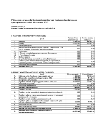 Półroczne sprawozdanie ubezpieczeniowego funduszu kapitałowego sporządzone na dzień 30 czerwca 2013 Noble Fund Africa Nordea Polska Towarzystwo Ubezpieczeń na Życie S.A. Noble Fund Africa I. WARTOŚĆ AKTYWÓW NETTO FUNDUSZU (w zł) I. 1. 2. 3. 4. 4.1. 4.2. II. 1. 2. 3. III. Aktywa Lokaty Środki pieniężne Aktywa za zezwoleniem organu nadzoru, zgodnie z art. 154 ust. 9 ustawy o działalności ubezpieczeniowej Należności Z tytułu transakcji zawartych na rynku finansowym Pozostałe należności Zobowiązania Z tytułu transakcji zawartych na rynku finansowym Zobowiązania wobec ubezpieczających,ubezpieczonych, uposażonych lub uprawnionych z umów ubezpieczenia Pozostałe zobowiązania Aktywa netto (I-II) II. ZMIANY WARTOŚCI AKTYWÓW NETTO FUNDUSZU (w zł) A. Aktywa netto funduszu na początek okresu B. Stan netto z działalności operacyjnej (I-II) I. Zwiększenia funduszu 1. Tytułem składek zwiększających wartość funduszu Pozostałe przychody 2. 3. Pozostałe zwiększenia II. Zmniejszenia funduszu 1. Tytułem wykupu 2. 3. 4. 5. 6. 7. C. D. Tytułem wypłat pozostałych świadczeń ubezpieczeniowych Tytułem opłat za ryzyko ubezpieczeniowe oraz innych opłat potrącanych z funduszu Tytułem zwrotu składek ubezpieczeniowych Tytułem opłat za zarządzanie funduszem oraz innych opłat tytułem administrowania funduszem Pozostałe koszty Pozostałe zmniejszenia Wynik netto z działalności inwestycyjnej Aktywa netto funduszu na koniec okresu sprawozdawczego Koniec okresu poprzedniego 48 221,42 48 221,42 0,00 Koniec okresu bieżącego 66 482,32 66 482,32 0,00 0,00 0,00 0,00 0,00 0,00 0,00 0,00 0,00 0,00 0,00 0,00 0,00 0,00 0,00 0,00 48 221,42 0,00 66 482,32 Okres poprzedni 11 229,67 39 981,85 43 412,78 20 210,00 0,00 23 202,78 3 430,93 2 512,41 Okres bieżący 77 384,20 5 140,81 86 660,17 29 853,20 0,00 56 806,97 81 519,36 1 625,69 0,00 0,00 0,00 0,00 0,00 0,00 522,69 1 069,18 0,00 395,83 -2 990,10 0,00 78 824,49 -16 042,69 48 221,42 66 482,32 III. LICZBA I WARTOŚĆ JEDNOSTEK ROZRACHUNKOWYCH Pozycja 1. Liczba jednostek rozrachunkowych: liczba jednostek rozrachunkowych na początek okresu 1.1 sprawozdawczego liczba jednostek rozrachunkowych na koniec okresu 1.2 sprawozdawczego 2. Wartość jednostki rozrachunkowej: wartość jednostki rozrachunkowej na początek okresu 2.1 sprawozdawczego minimalna wartość jednostki rozrachunkowej w okresie 2.2 sprawozdawczym maksymalna wartość jednostki rozrachunkowej w okresie 2.3 sprawozdawczym wartość jednostki rozliczeniowej na koniec okresu 2.4 sprawozdawczego Okres poprzedni Okres bieżący 151,1192 1 013,6783 640,9014 1 074,0278 74,31 76,34 74,31 60,55 84,21 78,26 75,24 61,90 IV. ZESTAWIENIE AKTYWÓW NETTO FUNDUSZU - półroczne Udział w aktywach netto funduszu (w %) 2 3 66 482,32 100,00% Wartość bilansowa (w zł) 1 I. Lokaty (suma 1-12) 1. Papiery wartościowe emitowane, poręczone lub gwarantowane przez Skarb Państwa lub organizacje międzynarodowe, których członkiem jest Rzeczpospolita Polska 2. 3. 4. 5. 6. 7. 8. 9. 10. 11. 12. Obligacje emitowane lub poręczone przez jednostki samorządu terytorialnego lub związki jednostek samorządu terytorialnego Inne dłużne papiery wartościowe o stałej stopie dochodu Akcje Udziały Jednostki uczestnictwa i certyfikaty inwestycyjne w funduszach inwestycyjnych Instrumenty pochodne, o ile służą zmniejszeniu ryzyka związanego z innymi aktywami stanowiącymi pokrycie rezerw techniczno-ubezpieczeniowych Inne papiery wartościowe o zmiennej kwocie dochodu Pożyczki Nieruchomości Depozyty bankowe Pozostałe lokaty II. Aktywa za zezwoleniem organu nadzoru, zgodnie z art. 154 ust. 9 ustawy o działalności ubezpieczeniowej III. IV. V. VI. 1 2 3 Środki pieniężne Należności Zobowiązania Aktywa netto (w tym) krajowe zagraniczne - kraje UE zagraniczne - kraje poza UE 0,00 0,00% 0,00 0,00% 0,00 0,00 0,00 0,00% 0,00% 0,00% 66 482,32 100,00% 0,00 0,00% 0,00 0,00 0,00 0,00 0,00 0,00% 0,00% 0,00% 0,00% 0,00% 0,00 0,00% 0,00 0,00 0,00 66 482,32 66 482,32 0,00 0,00 0,00% 0,00% 0,00% 100,00% 100,00% 0,00% 0,00%