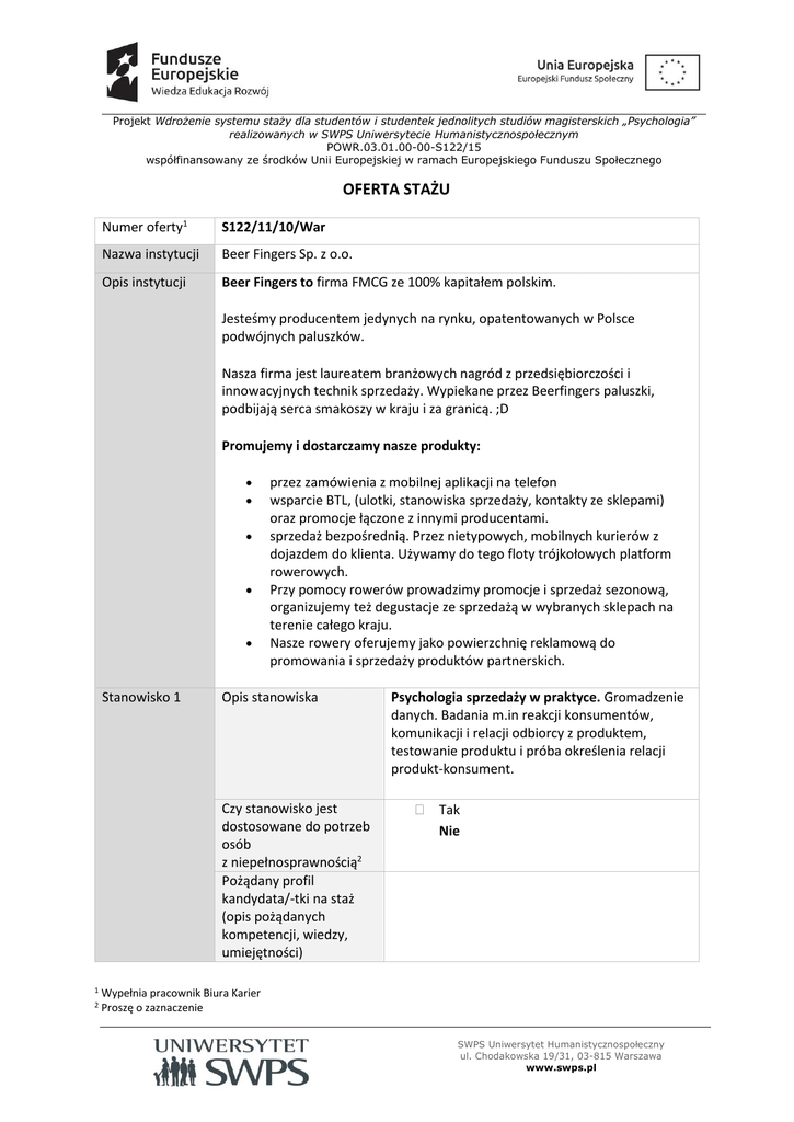 Projekt Wdrożenie systemu staży dla studentów i studentek jednolitych studiów magisterskich „Psychologia” realizowanych w SWPS Uniwersytecie Humanistycznospołecznym POWR.03.01.00-00-S122/15 współfinansowany ze środków Unii Europejskiej w ramach Europejskiego Funduszu Społecznego OFERTA STAŻU Numer oferty1 S122/11/10/War Nazwa instytucji Beer Fingers Sp. z o.o. Opis instytucji Beer Fingers to firma FMCG ze 100% kapitałem polskim. Jesteśmy producentem jedynych na rynku, opatentowanych w Polsce podwójnych paluszków. Nasza firma jest laureatem branżowych nagród z przedsiębiorczości i innowacyjnych technik sprzedaży. Wypiekane przez Beerfingers paluszki, podbijają serca smakoszy w kraju i za granicą. ;D Promujemy i dostarczamy nasze produkty: Stanowisko 1 przez zamówienia z mobilnej aplikacji na telefon wsparcie BTL, (ulotki, stanowiska sprzedaży, kontakty ze sklepami) oraz promocje łączone z innymi producentami. sprzedaż bezpośrednią. Przez nietypowych, mobilnych kurierów z dojazdem do klienta. Używamy do tego floty trójkołowych platform rowerowych. Przy pomocy rowerów prowadzimy promocje i sprzedaż sezonową, organizujemy też degustacje ze sprzedażą w wybranych sklepach na terenie całego kraju. Nasze rowery oferujemy jako powierzchnię reklamową do promowania i sprzedaży produktów partnerskich. Opis stanowiska Czy stanowisko jest dostosowane do potrzeb osób z niepełnosprawnością2 Pożądany profil kandydata/-tki na staż (opis pożądanych kompetencji, wiedzy, umiejętności) 1 2 Psychologia sprzedaży w praktyce. Gromadzenie danych. Badania m.in reakcji konsumentów, komunikacji i relacji odbiorcy z produktem, testowanie produktu i próba określenia relacji produkt-konsument. Tak Nie Wypełnia pracownik Biura Karier Proszę o zaznaczenie SWPS Uniwersytet Humanistycznospołeczny ul. Chodakowska 19/31, 03-815 Warszawa www.swps.pl Projekt Wdrożenie systemu staży dla studentów i studentek jednolitych studiów magisterskich „Psychologia” realizowanych w SWPS Uniwersytecie Humanistycznospołecznym POWR.03.01.00-00-S122/15 współfinansowany ze środków Unii Europejskiej w ramach Europejskiego Funduszu Społecznego CV oraz formularz zgłoszeniowy prosimy wysłać na adres: [email protected] W tytule wiadomości wpisując numer oferty S122/11/10/War W dokumentach prosimy zawrzeć następującą klauzulę: Zgadzam się na przetwarzanie moich danych osobowych dla potrzeb procesu rekrutacji, zgodnie z Ustawą z dn. 29.08.97 r. o Ochronie Danych Osobowych (Dz. U. nr 133 poz. 883). Uprzejmie informujemy, że skontaktujemy się tylko z wybranymi osobami. PROGRAM STAŻU Liczba godzin stażu w miesiącu: 120 Szczegółowy program stażu (w tym rozwijane kompetencje, zadania stażowe) PSYCHOLOGIA SPRZEDAŻY W PRAKTYCE Praca biurowa przy następujących zadaniach: gromadzenie danych. Badania m.in reakcji konsumentów, komunikacji i relacji odbiorcy z produktem, testowanie produktu i próba określenia relacji produkt-konsument. Staż będzie realizowany zgodnie z bieżącym zapotrzebowaniem firmy Beer Fingers na w/w działania Miejsce odbywania stażu ul. Bartoszka 2 lok. 42 Warszawa (Mokotów). Godziny pracy 8.00 - 14.00 lub 10.00 – 16.00 SWPS Uniwersytet Humanistycznospołeczny ul. Chodakowska 19/31, 03-815 Warszawa www.swps.pl