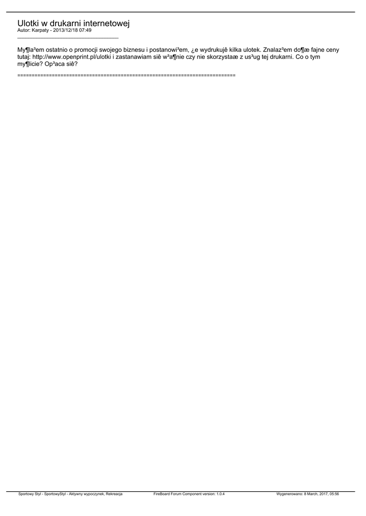 Ulotki w drukarni internetowej Autor: Karpaty - 2013/12/18 07:49 _____________________________________ My¶la³em ostatnio o promocji swojego biznesu i postanowi³em, ¿e wydrukujê kilka ulotek. Znalaz³em do¶æ fajne ceny tutaj: http://www.openprint.pl/ulotki i zastanawiam siê w³a¶nie czy nie skorzystaæ z us³ug tej drukarni. Co o tym my¶licie? Op³aca siê? ============================================================================ Sportowy Styl - SportowyStyl - Aktywny wypoczynek, Rekreacja FireBoard Forum Component version: 1.0.4 Wygenerowano: 8 March, 2017, 05:56