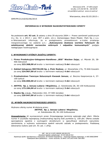 Wierzawice 874, 37-300 Leżajsk tel./fax. (17) 242 00 78, 242 60 94 [email protected], www.sm-park.pl Wierzawice, dnia 02.03.2015 r. SMP/PP/21210/02/06/2015 INFORMACJA O WYBORZE NAJKORZYSTNIEJSZEJ OFERTY Na podstawie art. 92 ust. 2 ustawy z dnia 29 stycznia 2004 r.- Prawo zamówień publicznych (t.j. Dz. U. z 2013 r. poz. 907 z późn. zm.); Zamawiający Stare Miasto -Park Sp. z o.o. w Wierzawicach informuje, że w postępowaniu prowadzonym w trybie przetargu nieograniczonego na zadanie p.n.: „Sukcesywna dostawa worków foliowych do selektywnej zbiórki surowców wtórnych i odpadów komunalnych” podjęto następujące rozstrzygnięcia: I. WYKONAWCY KTÓRZY ZŁOŻYLI OFERTY: 1. Firma Produkcyjno-Usługowo-Handlowa „BIG” Wacław Zając, ul. Młynek 20, 38406 Odrzykoń za cenę 223.368,00 zł brutto i z terminem realizacji 5 dni roboczych 2. Zakład Usługowy RECYKLON Sp. j. Piotr Radosz, ul. Słowiańska 17A, 75-846 Koszalin za cenę 224.967,00 zł brutto i z terminem realizacji 4 dni roboczych 3. Przetwórstwo Tworzyw Sztucznych Kwasek Janusz, ul. Boczna Kasprowicza 4, 37100 Łańcut za cenę 246.000,00 zł brutto i z terminem realizacji 3 dni roboczych 4. ARTFOL Sp. j. Janusz Lubera i Wspólnicy, ul. Sokołowska 28, 36-100 Kolbuszowa za cenę 173.184,00 zł brutto i z terminem realizacji 3 dni roboczych 5. Sipeko Sp. z o.o., Makowisko 162, 37-500 Jarosław za cenę 220 047,00 zł brutto i z terminem realizacji 3 dni roboczych II. WYBÓR NAJKORZYSTNIEJSZEJ OFERTY: Wybrano ofertę numer 4 złożoną przez: ARTFOL Sp. j. Janusz Lubera i Wspólnicy, ul. Sokołowska 28, 36-100 Kolbuszowa Uzasadnienie: W wyznaczonym przez Zmawiającego terminie wpłynęło pięć ofert. Oferta numer 4 uzyskała największą (maksymalną) łączną ilość punktów tj. 100 pkt. Oferta została sporządzona zgodnie z wymogami określonymi w specyfikacji istotnych warunków zamówienia, a wybrany wykonawca spełnił warunki udziału w postepowaniu. Podstawą dokonania wyboru jest art. 91 ust. 1 uPzp. NIP 816 16 14 875, REGON 180 054 074 Wysokość kapitału zakładowego: 30 253 000,00 PLN Rejestracja Spółki: Sąd Rejonowy w Rzeszowie, XII Wydział Gospodarczy – Krajowego Rejestru Sądowego, nr KRS 0000238948 Podkarpacki Bank Spółdzielczy – numer rachunku: 02 8642 1142 2019 9700 7285 0001 III. STRESZCZENIE OCENY I PORÓWNANIE ZŁOŻONYCH OFERT: L.P 1 2 3 4 Numer oferty Nazwa i adres Wykonawcy 1 Firma ProdukcyjnoUsługowo-Handlowa „BIG” Wacław Zając, ul. Młynek 20, 38-406 Odrzykoń 3 4 5 Przetwórstwo Tworzyw Sztucznych Kwasek Janusz, ul. Boczna Kasprowicza 4, 37100 Łańcut ARTFOL Sp. j. Janusz Lubera i Wspólnicy, ul. Sokołowska 28, 36100 Kolbuszowa Sipeko Sp. z o.o., Makowisko 162, 37500 Jarosław Cena oferty oraz termin dostawy Liczba punktów w kryterium „cena” – 95 pkt „termin dostawy” - 5 pkt 223.368,0 0 zł brutto 73,66 5 dni robocze 0 246.000,0 0 zł brutto 66,88 3 dni robocze 5 173.184,0 0 zł brutto 95 3 dni robocze 5 220.047,0 0 zł brutto 74,77 3 dni robocze 5 Razem Lokata 73,66 III 71,88 IV 100 I 79,77 II Strona 2 z 2