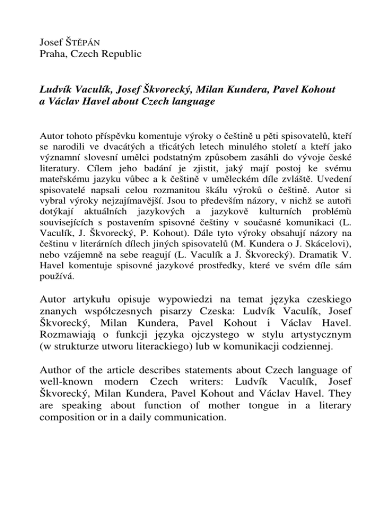 Josef ŠTĚPÁN Praha, Czech Republic Ludvík Vaculík, Josef Škvorecký, Milan Kundera, Pavel Kohout a Václav Havel about Czech language Autor tohoto příspěvku komentuje výroky o češtině u pěti spisovatelů, kteří se narodili ve dvacátých a třicátých letech minulého století a kteří jako významní slovesní umělci podstatným způsobem zasáhli do vývoje české literatury. Cílem jeho badání je zjistit, jaký mají postoj ke svému mateřskému jazyku vůbec a k češtině v uměleckém díle zvláště. Uvedení spisovatelé napsali celou rozmanitou škálu výroků o češtině. Autor si vybral výroky nejzajímavější. Jsou to především názory, v nichž se autoři dotýkají aktuálních jazykových a jazykově kulturních problémù souvisejících s postavením spisovné češtiny v současné komunikaci (L. Vaculík, J. Škvorecký, P. Kohout). Dále tyto výroky obsahují názory na češtinu v literárních dílech jiných spisovatelů (M. Kundera o J. Skácelovi), nebo vzájemně na sebe reagují (L. Vaculík a J. Škvorecký). Dramatik V. Havel komentuje spisovné jazykové prostředky, které ve svém díle sám používá. Autor artykułu opisuje wypowiedzi na temat języka czeskiego znanych współczesnych pisarzy Czeska: Ludvík Vaculík, Josef Škvorecký, Milan Kundera, Pavel Kohout i Václav Havel. Rozmawiają o funkcji języka ojczystego w stylu artystycznym (w strukturze utworu literackiego) lub w komunikacji codziennej. Author of the article describes statements about Czech language of well-known modern Czech writers: Ludvík Vaculík, Josef Škvorecký, Milan Kundera, Pavel Kohout and Václav Havel. They are speaking about function of mother tongue in a literary composition or in a daily communication.