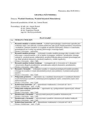 Warszawa, dnia 30.09.2016 r. GRAFIKA INŻYNIERSKA Dotyczy: Wydział Chemiczny, Wydział Inżynierii Materiałowej Kierownik przedmiotu: dr hab. inż. Antoni Rożeń Prowadzący: dr hab. inż. Antoni Rożeń dr inż. Janusz Oleniak dr inż. Eugeniusz Paszek mgr inż. Jan Krzysztoforski Lp. TEMATY ĆWICZEŃ 1 2 3 4 5 6 7 8 9 10 PLAN ZAJĘĆ Rysunek modelu w sześciu rzutach - wykład wprowadzający (omówienie sposobu prowadzenia zajęć i ich zaliczeń, rysunek techniczny jako język międzynarodowy inżynierów i techników, podział rysunków ze względu na sposób rzutowania, różnice w rzutowaniu prostokątnym na 6 rzutni wg metody pierwszego i trzeciego kąta). Ocena z ćwiczenia – zaliczenie. Rysunek modelu prostego - wykonanie rysunku modelu prostego jako rysunku wykonawczego z zastosowaniem, o ile to będzie wymagane, widoków i przekrojów różnego rodzaju tj.: przekrój prosty, półprzekrój, przekrój kilkoma płaszczyznami przecinającymi się, kład, przekrój miejscowy, przekrój cząstkowy, widok cząstkowy. Ocena z ćwiczenia – max. 5 pkt. Rysunek modelu średnio trudnego - wymagania jak w ćwiczeniu nr 2, skracanie i przerwanie długich przedmiotów, powiększanie małych elementów przedmiotów. Ocena z ćwiczenia – max. 6 pkt. Rysunek z formatki - wykonanie rysunku w rzutach prostokątnych modelu przedstawionego na rysunku w rzucie aksonometrycznym oraz podstawy wymiarowania przedmiotów. Ocena z ćwiczenia – max. 8 pkt. Połączenia gwintowe - zapoznanie się z zasadami stosowanymi w rysunkach złożeniowych (numeracja rysunków, numeracja poszczególnych części, oznaczenia części znormalizowanych). Ocena z ćwiczenia – max. 8 pkt. Kolokwium kontrolne „A” – sprawdzenie wiadomości z ćwiczeń od 1 do 4. Ocena z kolokwium – max. 15 pkt. Połączenia rozłączne pasowane - zapoznanie się z połączeniami wpustowymi, tolerancjami i pasowaniami. Ocena z ćwiczenia – max. 5 pkt. Detalowanie z formatki - odczytywanie prostych rysunków złożeniowych. Ocena z ćwiczenia – max. 5 pkt. Detalowanie z formatki - odczytywanie rysunków złożeniowych średnio trudnych. Ocena z ćwiczenia – max. 5 pkt. Kolokwium kontrolne „B” - Sprawdzenie wiadomości z ćwiczeń od 1 do 9. Ocena z kolokwium – max. 15 pkt. Lp. TEMATY ĆWICZEŃ (ciąg dalszy) 11 12 13 14 15 Wprowadzenie do programu AutoCAD Krótka charakterystyka oprogramowania typu CAD do wykonywania rysunków. Interfejs graficzny programu AutoCAD. Przestrzeń robocza. Szablony rysunkowe. Tworzenie i edycja prostych obiektów rysunkowych i tekstowych. Typy współrzędnych rysunkowych. Pomoce i narzędzia rysunkowe. Ocena z ćwiczenia – zaliczenie. Rysowanie precyzyjne i zaawansowane metody edycji. Tryby lokalizacji. Filtry współrzędnych. Funkcja śledzenia. Przenoszenie, kopiowanie obracanie i dopasowywanie obiektów. Tworzenie szyku. Ucinanie, wydłużanie, kreskowanie, fazowanie i zaokrąglanie obiektów. Ocena z ćwiczenia – zaliczenie. Warstwy rysunkowe i wymiarowanie. Rysunek modelu prostego. Tworzenie i zastosowanie warstw rysunkowych. Wymiarowanie obiektów. Wykonanie rysunku modelu prostego w rzutowaniu prostokątnym z wymiarowaniem. Wydruk rysunku. Ocena z ćwiczenia – max. 12 pkt. Rysunek modelu trudnego. Wykonanie rysunku modelu trudnego w rzutowaniu prostokątnym z wymiarowaniem. Wydruk rysunku. Ocena z ćwiczenia – max. 16 pkt.. Zaliczenie przedmiotu