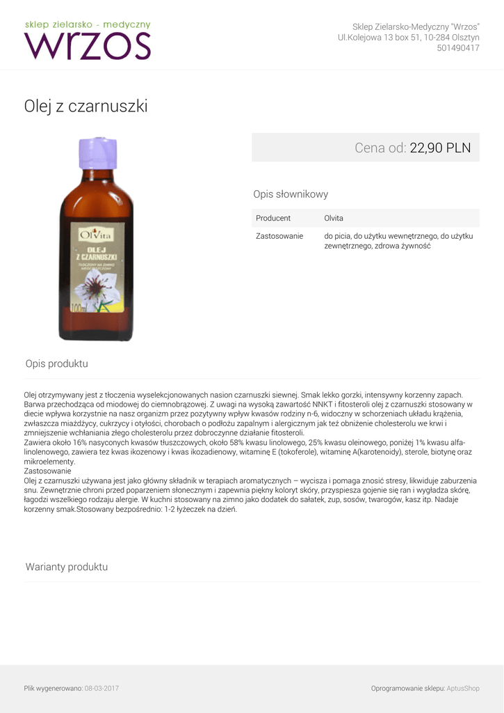 Sklep Zielarsko-Medyczny "Wrzos" Ul.Kolejowa 13 box 51, 10-284 Olsztyn 501490417 Olej z czarnuszki Cena od: 22,90 PLN Opis słownikowy Producent Olvita Zastosowanie do picia, do użytku wewnętrznego, do użytku zewnętrznego, zdrowa żywność Opis produktu Olej otrzymywany jest z tłoczenia wyselekcjonowanych nasion czarnuszki siewnej. Smak lekko gorzki, intensywny korzenny zapach. Barwa przechodząca od miodowej do ciemnobrązowej. Z uwagi na wysoką zawartość NNKT i fitosteroli olej z czarnuszki stosowany w diecie wpływa korzystnie na nasz organizm przez pozytywny wpływ kwasów rodziny n-6, widoczny w schorzeniach układu krążenia, zwłaszcza miażdżycy, cukrzycy i otyłości, chorobach o podłożu zapalnym i alergicznym jak też obniżenie cholesterolu we krwi i zmniejszenie wchłaniania złego cholesterolu przez dobroczynne działanie fitosteroli. Zawiera około 16% nasyconych kwasów tłuszczowych, około 58% kwasu linolowego, 25% kwasu oleinowego, poniżej 1% kwasu alfalinolenowego, zawiera tez kwas ikozenowy i kwas ikozadienowy, witaminę E (tokoferole), witaminę A(karotenoidy), sterole, biotynę oraz mikroelementy. Zastosowanie Olej z czarnuszki używana jest jako główny składnik w terapiach aromatycznych – wycisza i pomaga znosić stresy, likwiduje zaburzenia snu. Zewnętrznie chroni przed poparzeniem słonecznym i zapewnia piękny koloryt skóry, przyspiesza gojenie się ran i wygładza skórę, łagodzi wszelkiego rodzaju alergie. W kuchni stosowany na zimno jako dodatek do sałatek, zup, sosów, twarogów, kasz itp. Nadaje korzenny smak.Stosowany bezpośrednio: 1-2 łyżeczek na dzień. Warianty produktu Plik wygenerowano: 08-03-2017 Oprogramowanie sklepu: AptusShop Sklep Zielarsko-Medyczny "Wrzos" Ul.Kolejowa 13 box 51, 10-284 Olsztyn 501490417 Plik wygenerowano: 08-03-2017 Powered by TCPDF (www.tcpdf.org) Olej z czarnuszki 100 ml 22,90 PLN Olej z czarnuszki 250 ml 46,90 PLN Olej z czarnuszki 500 ml 79,90 PLN Oprogramowanie sklepu: AptusShop