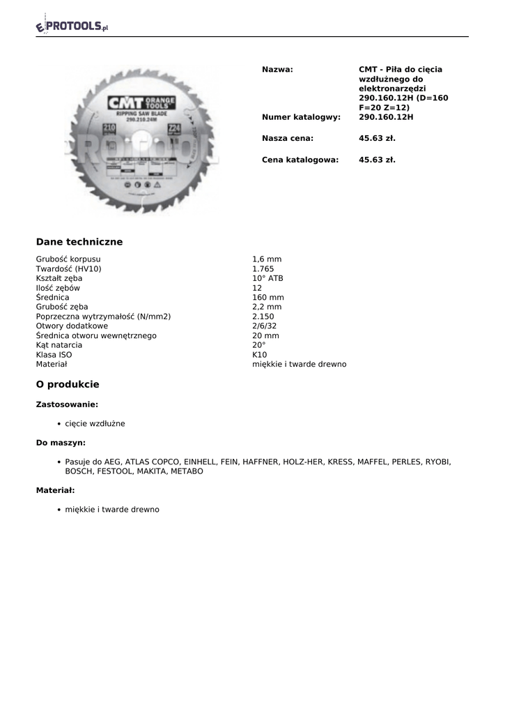 Nazwa: Numer katalogwy: CMT - Piła do cięcia wzdłużnego do elektronarzędzi 290.160.12H (D=160 F=20 Z=12) 290.160.12H Nasza cena: 45.63 zł. Cena katalogowa: 45.63 zł. Dane techniczne Grubość korpusu Twardość (HV10) Kształt zęba Ilość zębów Średnica Grubość zęba Poprzeczna wytrzymałość (N/mm2) Otwory dodatkowe Średnica otworu wewnętrznego Kąt natarcia Klasa ISO Materiał 1,6 mm 1.765 10° ATB 12 160 mm 2,2 mm 2.150 2/6/32 20 mm 20° K10 miękkie i twarde drewno O produkcie Zastosowanie: cięcie wzdłużne Do maszyn: Pasuje do AEG, ATLAS COPCO, EINHELL, FEIN, HAFFNER, HOLZ-HER, KRESS, MAFFEL, PERLES, RYOBI, BOSCH, FESTOOL, MAKITA, METABO Materiał: miękkie i twarde drewno Powered by TCPDF (www.tcpdf.org)