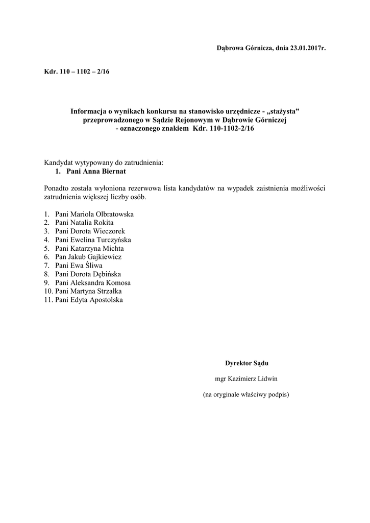 Dąbrowa Górnicza, dnia 23.01.2017r. Kdr. 110 – 1102 – 2/16 Informacja o wynikach konkursu na stanowisko urzędnicze - „stażysta” przeprowadzonego w Sądzie Rejonowym w Dąbrowie Górniczej - oznaczonego znakiem Kdr. 110-1102-2/16 Kandydat wytypowany do zatrudnienia: 1. Pani Anna Biernat Ponadto została wyłoniona rezerwowa lista kandydatów na wypadek zaistnienia możliwości zatrudnienia większej liczby osób. 1. Pani Mariola Olbratowska 2. Pani Natalia Rokita 3. Pani Dorota Wieczorek 4. Pani Ewelina Turczyńska 5. Pani Katarzyna Michta 6. Pan Jakub Gajkiewicz 7. Pani Ewa Śliwa 8. Pani Dorota Dębińska 9. Pani Aleksandra Komosa 10. Pani Martyna Strzałka 11. Pani Edyta Apostolska Dyrektor Sądu mgr Kazimierz Lidwin (na oryginale właściwy podpis)
