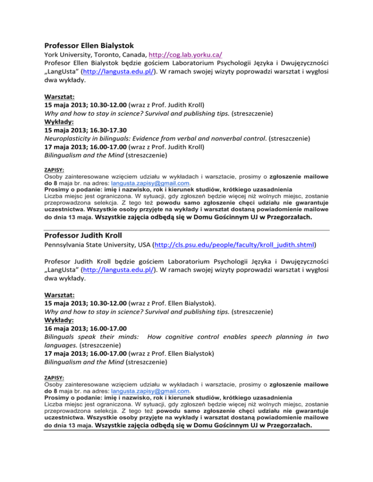 Professor Ellen Bialystok York University, Toronto, Canada, http://cog.lab.yorku.ca/ Profesor Ellen Bialystok będzie gościem Laboratorium Psychologii Języka i Dwujęzyczności „LangUsta” (http://langusta.edu.pl/). W ramach swojej wizyty poprowadzi warsztat i wygłosi dwa wykłady. Warsztat: 15 maja 2013; 10.30-‐12.00 (wraz z Prof. Judith Kroll) Why and how to stay in science? Survival and publishing tips. (streszczenie) Wykłady: 15 maja 2013; 16.30-‐17.30 Neuroplasticity in bilinguals: Evidence from verbal and nonverbal control. (streszczenie) 17 maja 2013; 16.00-‐17.00 (wraz z Prof. Judith Kroll) Bilingualism and the Mind (streszczenie) ZAPISY: Osoby zainteresowane wzięciem udziału w wykładach i warsztacie, prosimy o zgłoszenie mailowe do 8 maja br. na adres: [email protected]. Prosimy o podanie: imię i nazwisko, rok i kierunek studiów, krótkiego uzasadnienia Liczba miejsc jest ograniczona. W sytuacji, gdy zgłoszeń będzie więcej niż wolnych miejsc, zostanie przeprowadzona selekcja. Z tego też powodu samo zgłoszenie chęci udziału nie gwarantuje uczestnictwa. Wszystkie osoby przyjęte na wykłady i warsztat dostaną powiadomienie mailowe do dnia 13 maja. Wszystkie zajęcia odbędą się w Domu Gościnnym UJ w Przegorzałach. Professor Judith Kroll Pennsylvania State University, USA (http://cls.psu.edu/people/faculty/kroll_judith.shtml) Profesor Judith Kroll będzie gościem Laboratorium Psychologii Języka i Dwujęzyczności „LangUsta” (http://langusta.edu.pl/). W ramach swojej wizyty poprowadzi warsztat i wygłosi dwa wykłady. Warsztat: 15 maja 2013; 10.30-‐12.00 (wraz z Prof. Ellen Bialystok). Why and how to stay in science? Survival and publishing tips. (streszczenie) Wykłady: 16 maja 2013; 16.00-‐17.00 Bilinguals speak their minds: How cognitive control enables speech planning in two languages. (streszczenie) 17 maja 2013; 16.00-‐17.00 (wraz z Prof. Ellen Bialystok) Bilingualism and the Mind (streszczenie) ZAPISY: Osoby zainteresowane wzięciem udziału w wykładach i warsztacie, prosimy o zgłoszenie mailowe do 8 maja br. na adres: [email protected]. Prosimy o podanie: imię i nazwisko, rok i kierunek studiów, krótkiego uzasadnienia Liczba miejsc jest ograniczona. W sytuacji, gdy zgłoszeń będzie więcej niż wolnych miejsc, zostanie przeprowadzona selekcja. Z tego też powodu samo zgłoszenie chęci udziału nie gwarantuje uczestnictwa. Wszystkie osoby przyjęte na wykłady i warsztat dostaną powiadomienie mailowe do dnia 13 maja. Wszystkie zajęcia odbędą się w Domu Gościnnym UJ w Przegorzałach. Why and how to stay in science? Survival and publishing tips Judith F. Kroll1, Ellen Bialystok2 1 The Pennsylvania State University, 2 York University It is a challenging time to be an academic. There are increasing pressures to conduct excellent research and publish (a lot and quickly), to secure external grant funding for your research, to entertain your students in class so they are interested in what you are teaching (rather than Facebook or Twitter), to collaborate globally, and to be a good colleague to co-‐workers locally. Is it possible to do all of this successfully and to also have a life? Is it possible to survive when there are few academic positions and intense competition? In what ways can you anticipate having to change your interests and focus over the course of your career? And is it possible to enjoy your work despite all of these worries? We will share our own experience and advice about strategies for success and then open the seminar to discussion. Participants will be invited to generate particular topics that they would like to discuss in advance. Neuroplasticity in bilinguals: Evidence from verbal and nonverbal control. Ellen Bialystok, York University A growing body of research using both behavioral and neuroimaging data points to a significant effect of bilingualism on cognitive outcomes across the lifespan. The main findings are evidence for the enhancement of executive control at all stages in the lifespan, but costs for verbal performance on such measures as vocabulary, lexical access, and grammatical judgment. However, verbal processing can also require executive control for tasks that involve conflict, selection, or inhibition, so contrary to the usual pattern these tasks should show a bilingual advantage. We will report evidence from several recent studies that demonstrate bilingual advantages on linguistic tasks that recruit executive control. These results are discussed in terms of a more general model of cognitive and linguistic processing in which bilingualism incorporates the domain-‐ general executive control system to deal with language conflict and as a consequence modifies that system for both linguistic and nonlinguistic performance. Bilinguals speak their minds: How cognitive control enables speech planning in two languages. Judith F. Kroll, Pennsylvania State University Although proficient bilinguals are able to speak fluently in each of their two languages, recent studies suggest that both languages are continually active, to the point where the unintended language is often on the tip of the speaker’s tongue. In this talk, I describe recent behavioral, ERP, and fMRI evidence on bilingual speech planning that suggests that alternatives in each language are planned but that the more dominant language is inhibited to allow the weaker language to proceed. A question of interest is how the control processes that enable fluent speech in each language may hold domain-‐general consequences for bilinguals. Bilingualism and the Mind Judith F. Kroll1, Ellen Bialystok2 1 The Pennsylvania State University, 2 York University Contemporary research on bilingualism has been framed by two major discoveries. In the realm of language processing, studies of comprehension and production show that bilinguals activate information about both languages when using one language alone. Parallel activation of the two