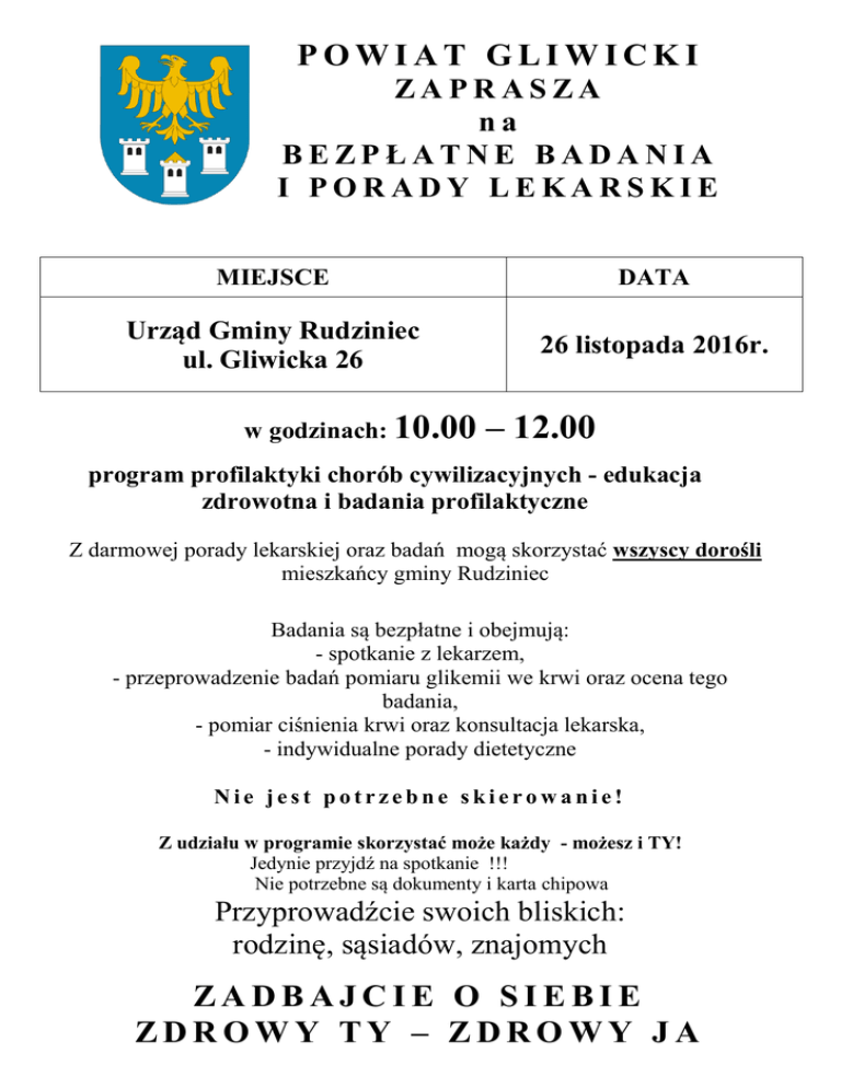 POWIAT GLIWICKI ZAPRASZA na BEZPŁATNE BADANIA I PORADY LEKARSKIE MIEJSCE DATA Urząd Gminy Rudziniec ul. Gliwicka 26 26 listopada 2016r. w godzinach: 10.00 – 12.00 program profilaktyki chorób cywilizacyjnych - edukacja zdrowotna i badania profilaktyczne Z darmowej porady lekarskiej oraz badań mogą skorzystać wszyscy dorośli mieszkańcy gminy Rudziniec Badania są bezpłatne i obejmują: - spotkanie z lekarzem, - przeprowadzenie badań pomiaru glikemii we krwi oraz ocena tego badania, - pomiar ciśnienia krwi oraz konsultacja lekarska, - indywidualne porady dietetyczne Nie jest potrzebne skierowanie! Z udziału w programie skorzystać może każdy - możesz i TY! Jedynie przyjdź na spotkanie !!! Nie potrzebne są dokumenty i karta chipowa Przyprowadźcie swoich bliskich: rodzinę, sąsiadów, znajomych ZADBAJCIE O SIEBIE ZDROWY TY – ZDROWY JA