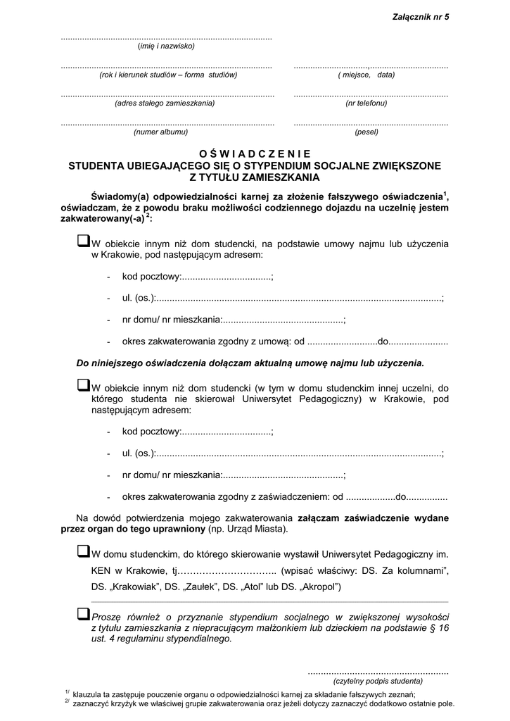 Załącznik nr 5 ......................................................................................... (imię i nazwisko) ......................................................................................... (rok i kierunek studiów – forma studiów) .......................................................................................... ...............................,................................. ( miejsce, data) ................................................................. (adres stałego zamieszkania) .......................................................................................... (nr telefonu) ................................................................. (numer albumu) (pesel) OŚWIADCZENIE STUDENTA UBIEGAJĄCEGO SIĘ O STYPENDIUM SOCJALNE ZWIĘKSZONE Z TYTUŁU ZAMIESZKANIA Świadomy(a) odpowiedzialności karnej za złożenie fałszywego oświadczenia1, oświadczam, że z powodu braku możliwości codziennego dojazdu na uczelnię jestem zakwaterowany(-a) 2: W obiekcie innym niż dom studencki, na podstawie umowy najmu lub użyczenia w Krakowie, pod następującym adresem: - kod pocztowy:..................................; - ul. (os.):.............................................................................................................; - nr domu/ nr mieszkania:..............................................; - okres zakwaterowania zgodny z umową: od ...........................do....................... Do niniejszego oświadczenia dołączam aktualną umowę najmu lub użyczenia. W obiekcie innym niż dom studencki (w tym w domu studenckim innej uczelni, do którego studenta nie skierował Uniwersytet Pedagogiczny) w Krakowie, pod następującym adresem: - kod pocztowy:..................................; - ul. (os.):.............................................................................................................; - nr domu/ nr mieszkania:..............................................; - okres zakwaterowania zgodny z zaświadczeniem: od ...................do................ Na dowód potwierdzenia mojego zakwaterowania załączam zaświadczenie wydane przez organ do tego uprawniony (np. Urząd Miasta). W domu studenckim, do którego skierowanie wystawił Uniwersytet Pedagogiczny im. KEN w Krakowie, tj………………………….. (wpisać właściwy: DS. Za kolumnami”, DS. „Krakowiak”, DS. „Zaułek”, DS. „Atol” lub DS. „Akropol”) ______________________________________________________________________________________________________________________________________________________ Proszę również o przyznanie stypendium socjalnego w zwiększonej wysokości z tytułu zamieszkania z niepracującym małżonkiem lub dzieckiem na podstawie § 16 ust. 4 regulaminu stypendialnego. ...................................................... (czytelny podpis studenta) 1/ 2/ klauzula ta zastępuje pouczenie organu o odpowiedzialności karnej za składanie fałszywych zeznań; zaznaczyć krzyżyk we właściwej grupie zakwaterowania oraz jeżeli dotyczy zaznaczyć dodatkowo ostatnie pole.