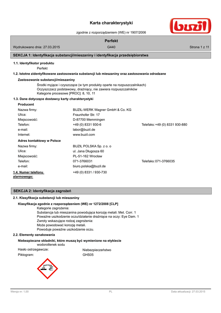 Karta charakterystyki zgodnie z rozporządzeniem (WE) nr 1907/2006 Perfekt Wydrukowano dnia: 27.03.2015 Strona 1 z 11 G440 SEKCJA 1: Identyfikacja substancji/mieszaniny i identyfikacja przedsiębiorstwa 1.1. Identyfikator produktu Perfekt 1.2. Istotne zidentyfikowane zastosowania substancji lub mieszaniny oraz zastosowania odradzane Zastosowanie substancji/mieszaniny Środki myjące i czyszczące (w tym produkty oparte na rozpuszczalnikach) Oczyszczacz podstawowy, drażniący, nie zawiera rozpuszczalników Kategorie procesowe [PROC]: 8, 10, 11 1.3. Dane dotyczące dostawcy karty charakterystyki Producent Nazwa firmy: Ulica: Miejscowość: Telefon: e-mail: BUZIL-WERK Wagner GmbH & Co. KG Fraunhofer Str. 17 D-87700 Memmingen +49 (0) 8331 930-6 [email protected] Internet: www.buzil.com Telefaks: +49 (0) 8331 930-880 Adres kontaktowy w Polsce Nazwa firmy: Ulica: BUZIL POLSKA Sp. z o. o ul. Jana Długosza 60 Miejscowość: PL-51-162 Wrocław Telefon: 071-3766031 e-mail: [email protected] 1.4. Numer telefonu alarmowego: Telefaks: 071-3766035 +49 (0) 8331 / 930-730 SEKCJA 2: Identyfikacja zagrożeń 2.1. Klasyfikacja substancji lub mieszaniny Klasyfikacja zgodnie z rozporządzeniem (WE) nr 1272/2008 [CLP] Kategorie zagrożenia: Substancja lub mieszanina powodująca korozję metali: Met. Corr. 1 Poważne uszkodzenie oczu/działanie drażniące na oczy: Eye Dam. 1 Zwroty wskazujące rodzaj zagrożenia: Może powodować korozję metali. Powoduje poważne uszkodzenie oczu. 2.2. Elementy oznakowania Niebezpieczne składniki, które muszą być wymienione na etykiecie wodorotlenek sodu Hasło ostrzegawcze: Piktogram: Wersja nr: 1,00 Niebezpieczeństwo GHS05 PL Data aktualizacji: 27.03.2015 Karta charakterystyki zgodnie z rozporządzeniem (WE) nr 1907/2006 Perfekt Wydrukowano dnia: 27.03.2015 Strona 2 z 11 G440 Zwroty wskazujące rodzaj zagrożenia H290 Może powodować korozję metali. H318 Powoduje poważne uszkodzenie oczu. Zwroty wskazujące środki ostrożności P280 Stosować rękawice ochronne/odzież ochronną/ochronę oczu/ochronę twarzy. P301+P330+P331 W PRZYPADKU POŁKNIĘCIA: wypłukać usta. NIE wywoływać wymiotów. P305+P351+P338 W PRZYPADKU DOSTANIA SIĘ DO OCZU: Ostrożnie płukać wodą przez kilka minut. Wyjąć soczewki kontaktowe, jeżeli są i można je łatwo usunąć. Nadal płukać. P310 Natychmiast skontaktować się z OŚRODKIEM ZATRUĆ/lekarzem. 2.3. Inne zagrożenia Substancje zawarte w mieszaninie nie spełniają kryteriów PBT/vPvB zgodnie z załącznikiem XIII do rozporządzenia REACH Wdychanie pyłu/mgiełki oparów lub aerozoli powoduje podrażnienia dróg oddechowych. SEKCJA 3: Skład/informacja o składnikach 3.2. Mieszaniny Składniki niebezpieczne Nr WE Nr CAS Nazwa chemiczna Ilość Nr Index Nr REACH Klasyfikacja zgodnie z rozporządzeniem (WE) nr 1272/2008 [CLP] 230-785-7 pirofosforan tetrapotasu 5 - < 10 % 7320-34-5 Eye Irrit. 2; H319 01-2119489369-18 239-854-6 1-<5% kumenosulfonianu sodu 15763-76-5 Eye Irrit. 2; H319 01-2119489411-37 1-<5% etoksylowany alkohol tłuszczowy 26183-52-8 Acute Tox. 4, Eye Irrit. 2; H302 H319 270-115-0 1-<5% alkilobenzenosulfonian sodowy 68411-30-3 Acute Tox. 4, Skin Irrit. 2, Eye Dam. 1, Aquatic Chronic 3; H302 H315 H318 H412 01-2119489428-22 Wydźwięk zdań H- i EUH: patrz sekcja 16. Oznakowanie dotyczące zawartości zgodnie z rozporządzeniem (WE) nr 648/2004 5 % - 15 % fosforany, < 5 % niejonowe środki powierzchniowo czynne, < 5 % anionowe środki powierzchniowo czynne, kompozycje zapachowe (Linalool). SEKCJA 4: Środki pierwszej pomocy 4.1. Opis środków pierwszej pomocy Wersja nr: 1,00 PL Data aktualizacji: 27.03.2015 Karta charakterystyki zgodnie z rozporządzeniem (WE) nr 1907/2006 Perfekt Wydrukowano dnia: 27.03.2015 Strona 3 z 11 G440 W przypadku wdychania Należy zadbać o należytą wentylację. W przypadku kontaktu ze skórą Zanieczyszczoną skórę natychmiast przemyć dużą ilością wody i mydłem. Zanieczyszczoną odzież zdjąć i wyprać przed ponownym użyciem. W przypadku kontaktu z oczami Należy natychmiast ostrożnie, ale gruntownie przepłukać oczy zalecanymi preparatami lub wodą. W przypadku połknięcia Natychmiast przepłukać jamę ustną i obficie popić wodę. NIE wywoływać wymiotów. 4.2. Najważniejsze ostre i opóźnione objawy oraz skutki narażenia Nie istnieją żadne informacje. 4.3. Wskazania dotyczące wszelkiej natychmiastowej pomocy lekarskiej i szczególnego postępowania z poszkodowanym Leczenie symptomatyczne. SEKCJA 5: Postępowanie w przypadku pożaru 5.1. Środki gaśnicze Odpowiednie środki gaśnicze Strumień wody Piana odporna na alkohole Dwutlenek węgla Suchy środek gaśniczy Niewłaściwe środki gaśnicze Pełny strumień wody 5.2. Szczególne zagrożenia związane z substancją lub mieszaniną Niebezpieczne produkty spalania: Dwutlenek węgla Tlenek węgla. 5.3. Informacje dla straży pożarnej Środki gaśnicze należy dostosować do otoczenia. Informacja uzupełniająca Zanieczyszczoną wodę zbierać osobno. Nie powinna się ona dostać do kanalizacji lub zbiorników wodnych. SEKCJA 6: Postępowanie w przypadku niezamierzonego uwolnienia do środowiska 6.1. Indywidualne środki ostrożności, wyposażenie ochronne i procedury w sytuacjach awaryjnych Używać osobistego wyposażenia ochronnego (patrz sekcja 8). Unikać kontaktu ze skórą, oczami i odzieżą. 6.2. Środki ostrożności w zakresie ochrony środowiska Nie odprowadzać do kanalizacji i zbiorników wodnych. Nie dopuścić do przedostania się do gruntu/gleby. 6.3. Metody i materiały zapobiegające rozprzestrzenianiu się skażenia i służące do usuwania skażenia Należy zebrać przy pomocy materiałów wiążących płyny (piasek, ziemia okrzemkowa, uniwersalny środek wiążący). Zebrany materiał traktować zgodnie z sekcją postępowanie z opadami. Wersja nr: 1,00 PL Data aktualizacji: 27.03.2015 Karta charakterystyki zgodnie z rozporządzeniem (WE) nr 1907/2006 Perfekt Wydrukowano dnia: 27.