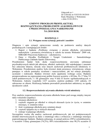 Załącznik nr 1 do Uchwały nr XXXVII-30/2010 Rady Miejskiej w Wołominie z dnia 22.04.2010 r. GMINNY PROGRAM PROFILAKTYKI, ROZWIĄZYWANIA PROBLEMÓW ALKOHOLOWYCH I PRZECIWDZIAŁANIA NARKOMANII NA 2010 ROK ROZDZIAŁ I I.1. Wstępna ocena sytuacji, potrzeb i zasobów Diagnoza i opis sytuacji opracowane zostały na podstawie analizy danych pochodzących z następujących źródeł: 1. Raport z badania „Problemy związane z piciem alkoholu, używaniem narkotyków i przemocą rówieśniczą w szkole na terenie Wołomin” 2009 rok, MIRABO Pracownia badawczo – szkoleniowa. 2. Dane z Ośrodka Profilaktyki i Terapii Uzależnień – Samodzielnego Publicznego Zakładu Opieki Zdrowotnej. Przedmiotem badań była skala rozpowszechnienia używania substancji psychoaktywnych takich jak nikotyna, alkohol, narkotyki, leki uspokajające i nasenne bez zalecenia lekarza, sterydy oraz innych zachowań problemowych młodzieży w Wołominie. Przedmiotem analizy była również skala przemocy rówieśniczej, relacje panujące w szkole pomiędzy uczniami i nauczycielami, jak też relacje pomiędzy uczniami i rodzicami. Badano również style spędzania wolnego czasu. Badania przeprowadzono na reprezentatywnej próbie losowej uczniów z 60 klas. Po 17 klas VI szkół podstawowych, I i III gimnazjów oraz 9 klas II liceów ogólnokształcących w Wołominie. Ankiety wypełniło 1227 uczniów, analizie poddano 1203 ankiety, 24 odrzucono ze zbioru. Realizację badania prowadzili przeszkoleni ankieterzy za zgodą dyrektorów szkół. I.2. Rozpowszechnienie używania alkoholu wśród młodzieży Przy analizie rozpowszechnienia używania alkoholu brano pod uwagę między innymi takie wskaźniki (aspekty): 1. inicjacje alkoholowe 2. częstość sięgania po alkohol w różnych okresach życia (w życiu, w ostatnim miesiącu, w ostatnim roku) 3. ilość wypijanego alkoholu przy ostatniej okazji 4. częstość upijania się w różnych okresach 5. rodzaje wypijanego alkoholu. Szczególnie ważne dla analizy zachowań problemowych, jak też podejmowanych działań interwencyjnych są dane z ostatniego roku a zwłaszcza z ostatniego miesiąca poprzedzającego badanie. Badania pokazują, że ponad połowa (58%) szóstoklasistów, ¾ uczniów I klasy gimnazjum (74,2%), 88% trzecioklasistów oraz 98,3% uczniów II 1 klas liceów ogólnokształcących przynajmniej raz w życiu piło alkohol. Wraz z wiekiem rośnie odsetek osób mających za sobą inicjację alkoholową. Warto zwrócić uwagę na wyraźne skoki w poszczególnych rocznikach. Widoczne jest również to, że z wiekiem rosną odsetki osób pijących sporadycznie (1-2 razy) i okazjonalnie (3-9 razy) alkohol w ostatnim miesiącu: kl. VI szkoły podstawowej – 20% kl. I gimnazjum – 27,4% kl. III gimnazjum – 47,5% kl. II liceum – 66,4% Regularnie tzn. 40 i więcej razy w miesiącu pije 0,3% sześcioklasistów, 0,7% gimnazjalistów oraz 3,4% licealistów. Zauważalny jest tutaj wyraźny skok z 0,7% na 3,4%. Najpopularniejszym alkoholem po który sięga badana młodzież jest piwo. Analiza wyników pokazuje jednak, że uczniowie nie ograniczają się wyłącznie do piwa, ale oprócz tego sięgają po wino i napoje wysokoprocentowe. Starsi uczniowie tj. kl. III gimnazjum i II liceów nie rezygnując z piwa dodają do niego napoje mocne. Ważną informacją jest też ile alkoholu (standardowych porcji - 10g czystego alkoholu) wypili nasi uczniowie podczas jednej okazji. W badanej populacji 8% podczas ostatniej okazji wypiło 9-13 standardowych porcji alkoholu (tj. 2-3 puszki piwa i 3-5 kieliszków wódki) Tzn., że chłopak o wadze około 60 kg po spożyciu 9 porcji alkoholu i upływie 1 godziny ma we krwi 2‰ a dziewczyna o wadze około 50 kg 3,1‰. Jest to stan zagrożenia życia. I.3. Upijanie się Badania pokazują, że im starsi uczniowie tym częstsze doświadczenie upijania się w różnych okresach: w życiu, w ostatnim roku i w ostatnim miesiącu. Z punktu widzenia zachowań problemowych szczególnie istotna jest analiza upijania się w ciągu ostatniego miesiąca. Pojedyncze upicia się w tym okresie deklarowało: 3,4% uczniów klas VI szkół podstawowych, 5,5% uczniów klas I gimnazjów, 14% uczniów klas III gimnazjów, 20% młodzieży klas II liceów. Przypadki osób, które w ostatnim miesiącu upijały się często (tj. 10-19 i powyżej 20 razy) wynosi około 2% uczniów z klas II LO. Miejscem gdzie młodsi uczniowie najczęściej piją alkohol jest własny dom. Z wiekiem rosną odsetki osób, które piją w domu u kogoś innego (prawdopodobnie podczas imprez i spotkań towarzyskich). Do picia w plenerze (a więc w miejscu publicznym) przyznają się częściej chłopcy z klas VI szkół podstawowych, a w klasach gimnazjalnych zacierają się różnice pomiędzy dziewczętami i chłopcami. W klasach II LO częściej chłopcy piją w takich warunkach – 30%, dziewczęta – 6%. Starsze dziewczęta wskazują, że częściej piły w barze, pubie, klubie. W deklaracjach badani podali również, że pili na wycieczce szkolnej. Taką deklarację złożyło około 2% uczniów klas VI, 2% uczniów klas I gimnazjum (dziewczęta), 5,5% chłopców i 3,7% dziewcząt z klas III gimnazjum i 3,7% dziewcząt oraz 7,4% chłopców klas II LO. 2 I.4. Rozpowszechnianie używania substancji psychoaktywnych 1. Narkotyki Po narkotyki przynajmniej jeden raz w życiu sięgnęło 4,4% uczniów klas VI, 8,8% uczniów klas I gimnazjum. W klasach III gimnazjum odnotowano znacznie wyższy odsetek bo 21,2% a w klasach II LO 27,7%. W roczniku tym znacznie wyższy jest odsetek chłopców 40,6% niż dziewcząt 19,3%. Jak pokazują badania najczęściej używaną substancją jest marihuana lub haszysz. Użyło ich około 2% szóstoklasistów i 4,8% uczniów klas I gimnazjum. Wśród uczniów starszych – III gimnazjum –wyraźnie bo aż czterokrotnie wzrasta odsetek osób, które użyły marihuany lub haszyszu -16%. W klasach drugich LO sięgnęło po te narkotyki – 26,6