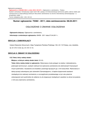 Ogłoszenie powiązane: Ogłoszenie nr 69458-2011 z dnia 2011-04-07 r. Ogłoszenie o zamówieniu - Puławy System wentylacji i klimatyzacji części hali H-80 i pokoju 215 Dokumentacja techniczna (pełny zakres robót) jest zamieszczona ze Specyfikacją Istotnych Warunków Zamówienia na stronie internetowej Zamawiającego: 1) przedmiary robót -... Termin składania ofert: 2011-04-22 Numer ogłoszenia: 70382 - 2011; data zamieszczenia: 08.04.2011 OGŁOSZENIE O ZMIANIE OGŁOSZENIA Ogłoszenie dotyczy: Ogłoszenia o zamówieniu. Informacje o zmienianym ogłoszeniu: 69458 - 2011 data 07.04.2011 r. SEKCJA I: ZAMAWIAJĄCY Instytut Nawozów Sztucznych, Aleja Tysiąclecia Państwa Polskiego 13A, 24-110 Puławy, woj. lubelskie, tel. 81 473 14 00, fax. 81 473 14 10. SEKCJA II: ZMIANY W OGŁOSZENIU II.2) Tekst, który należy dodać: Miejsce, w którym należy dodać tekst: III.3.2). Tekst, który należy dodać w ogłoszeniu: Wykonawca może polegać na wiedzy i doświadczeniu, potencjale technicznym, osobach zdolnych do wykonania zamówienia lub zdolnościach finansowych innych podmiotów, niezależnie od charakteru prawnego łączących go z nimi stosunków. Wykonawca w takiej sytuacji zobowiązany jest udowodnić Zamawiającemu, iż będzie dysponował zasobami niezbędnymi do realizacji zamówienia, w szczególności przedstawiając w tym celu pisemne zobowiązanie tych podmiotów do oddania mu do dyspozycji niezbędnych zasobów na okres korzystania z nich przy wykonaniu zamówienia..