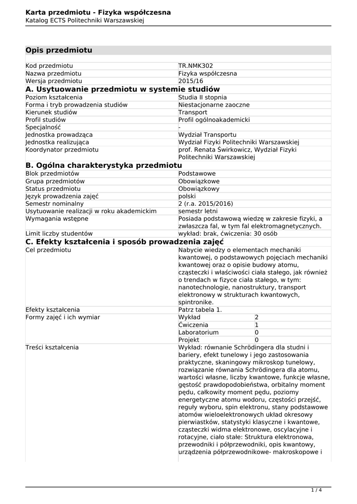 Karta przedmiotu - Fizyka współczesna Katalog ECTS Politechniki Warszawskiej Opis przedmiotu Kod przedmiotu Nazwa przedmiotu Wersja przedmiotu TR.NMK302 Fizyka współczesna 2015/16 A. Usytuowanie przedmiotu w systemie studiów Poziom kształcenia Forma i tryb prowadzenia studiów Kierunek studiów Profil studiów Specjalność Jednostka prowadząca Jednostka realizująca Koordynator przedmiotu Studia II stopnia Niestacjonarne zaoczne Transport Profil ogólnoakademicki Wydział Transportu Wydział Fizyki Politechniki Warszawskiej prof. Renata Świrkowicz, Wydział Fizyki Politechniki Warszawskiej B. Ogólna charakterystyka przedmiotu Blok przedmiotów Grupa przedmiotów Status przedmiotu Język prowadzenia zajęć Semestr nominalny Usytuowanie realizacji w roku akademickim Wymagania wstępne Limit liczby studentów Podstawowe Obowiązkowe Obowiązkowy polski 2 (r.a. 2015/2016) semestr letni Posiada podstawową wiedzę w zakresie fizyki, a zwłaszcza fal, w tym fal elektromagnetycznych. wykład: brak, ćwiczenia: 30 osób C. Efekty kształcenia i sposób prowadzenia zajęć Cel przedmiotu Efekty kształcenia Formy zajęć i ich wymiar Treści kształcenia Nabycie wiedzy o elementach mechaniki kwantowej, o podstawowych pojęciach mechaniki kwantowej oraz o opisie budowy atomu, cząsteczki i właściwości ciała stałego, jak również o trendach w fizyce ciała stałego, w tym: nanotechnologie, nanostruktury, transport elektronowy w strukturach kwantowych, spintronike. Patrz tabela 1. Wykład 2 Ćwiczenia 1 Laboratorium 0 Projekt 0 Wykład: równanie Schrödingera dla studni i bariery, efekt tunelowy i jego zastosowania praktyczne, skaningowy mikroskop tunelowy, rozwiązanie równania Schrödingera dla atomu, wartości własne, liczby kwantowe, funkcje własne, gęstość prawdopodobieństwa, orbitalny moment pędu, całkowity moment pędu, poziomy energetyczne atomu wodoru, częstości przejść, reguły wyboru, spin elektronu, stany podstawowe atomów wieloelektronowych układ okresowy pierwiastków, statystyki klasyczne i kwantowe, cząsteczki widma elektronowe, oscylacyjne i rotacyjne, ciało stałe: Struktura elektronowa, przewodniki i półprzewodniki, opis kwantowy, urządzenia półprzewodnikowe- makroskopowe i 1/4 Karta przedmiotu - Fizyka współczesna Katalog ECTS Politechniki Warszawskiej Opis przedmiotu Metody oceny Metody sprawdzania efektów kształcenia Egzamin Literatura Witryna www przedmiotu nanoskopowe, nadprzewodniki nisko- i wysokotemperaturowe, diamagnetyki, paramagnetyki, ferromagnetyki , ferrimagnetyki. Spintronika, gigantyczny magnetoopór, tunelowy magnetoopór, zastosowania w komórkach pamięci MRAM, wytwarzanie struktur niskowymiarowych, epitaksja, właściwości fizyczne układów niskowymiarowych, studnie, druty i kropki kwantowe, zastosowanie układów niskowymiarowych, nanoelektronika, grafen i jego właściwości, nanorurki, optyka: działanie i budowa laserów. Ćwiczenia: przykłady rozwiązań zagadnień z mechaniki kwantowej w zastosowaniu do fizyki ciała stałego, optyki. Wykład: ocena formująca: kartkówka, ocena podsumowująca: egzamin ustny. Do zaliczenia wymagana znajomość 50% zakresu materiału. Ćwiczenia: opracowanie w zakresie rozwiązań wybranych zagadnień fizyki współczesnej oraz ich praktycznego zastosowania, prezentacja wykonanego opracowania. Patrz tabela 1. tak 1) Ginter J., Wstęp do fizyki atomu cząsteczki i ciała stałego, wydanie 2, PWN, Warszawa 1986; 2) Eisberg R., Resnick R., Fizyka kwantowa: atomów, cząsteczek, ciał stałych, jąder i cząstek elementarnych, PWN, Warszawa 1993; 3) Matthews P.T., Wstęp do mechaniki kwantowej, wydanie 4, PWN, Warszawa 1977; 4) Busmanow B.N., Chromov Ju. A., Fizyka ciała stałego, WNT, Warszawa 1973; 5) Kittel C., Wstęp do fizyki ciała stałego, wydanie 5, PWN, Warszawa 2012; 6) Liboff R., Wstęp do mechaniki kwantowej, PWN, Warszawa 1987; 7) Szalimowa K.W., Fizyka półprzewodników, PWN, Warszawa 1974; 8) Petykiewicz J., Podstawy fizyczne optyki scalonej, PWN, Warszawa 1989; 9) Szczeniowski S., Fizyka doświadczalna; 10) Postępy Fizyki, Polskie Towarzystwo Fizyczne, Warszawa - czasopismo; 11) Physics Today, American Institute of Physics, New York - czasopismo. www.if.pw.edu.pl D. Nakład pracy studenta Liczba punktów ECTS Liczba godzin pracy studenta związanych z osiągnięciem efektów kształcenia 3 88 godzin, w tym: obecność na wykładach: 18 godz., udział w ćwiczeniach: 9 godz., konsultacje: 4 godz., udział w egzaminie: 2 godz., przygotowanie się do egzaminu: 30 godz., samodzielne przygotowanie opracowania w zakresie rozwiązań wybranych zagadnień fizyki współczesnej oraz ich praktycznego zastosowania: 25 godz. 2/4 Karta przedmiotu - Fizyka współczesna Katalog ECTS Politechniki Warszawskiej Opis przedmiotu Liczba punktów ECTS na zajęciach wymagających 1,5 pkt ECTS (33 godziny, w tym: obecność na bezpośredniego udziału nauczycieli akademickich: wykładach: 18 godz., udział w ćwiczeniach: 9 godz., konsultacje: 4 godz., udział w egzaminie: 2 godz.) Liczba punktów ECTS, którą student uzyskuje w 1,0 pkt ECTS (25 godzin, samodzielne ramach zajęć o charakterze praktycznym przygotowanie opracowania w zakresie rozwiązań wybranych zagadnień fizyki współczesnej oraz ich praktycznego zastosowania) E. Informacje dodatkowe Uwagi Data ostatniej aktualizacji O ile nie powoduje to zmian w zakresie powiązań danego modułu zajęć z kierunkowymi efektami kształcenia w treściach kształcenia mogą być wprowadzane na bieżąco zmiany związane z uwzględnieniem najnowszych osiągnięć naukowych. 2015-04-21 15:38:50 Tabela 1. Efekty przedmiotowe Profil ogólnoakademicki - wiedza Efekt: Kod: Weryfikacja: Powiązane efekty kierunkowe Powiązane efekty obszarowe Efekt: Kod: Weryfikacja: Powiązane efekty kierunkowe Powiązane efekty obszarowe Efekt: Kod: Weryfikacja: Powiązane efekty kierunkowe Powiązane efekty obszarowe Ma wiedzę na temat koncepcji dot