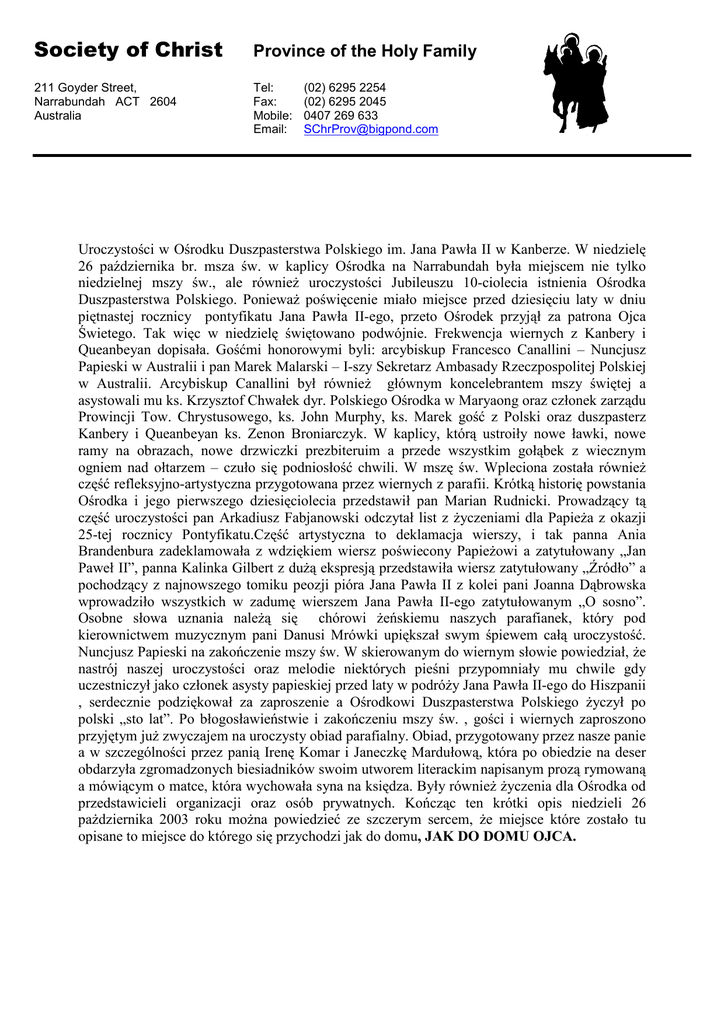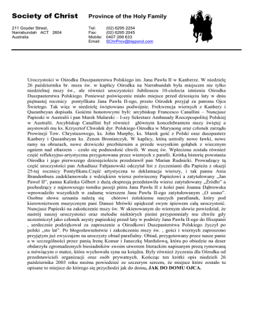 Society of Christ Province of the Holy Family 211 Goyder Street, Narrabundah ACT 2604 Australia Tel: Fax: Mobile: Email: (02) 6295 2254 (02) 6295 2045 0407 269 633 [email protected] Uroczystości w Ośrodku Duszpasterstwa Polskiego im. Jana Pawła II w Kanberze. W niedzielę 26 października br. msza św. w kaplicy Ośrodka na Narrabundah była miejscem nie tylko niedzielnej mszy św., ale równieŜ uroczystości Jubileuszu 10-ciolecia istnienia Ośrodka Duszpasterstwa Polskiego. PoniewaŜ poświęcenie miało miejsce przed dziesięciu laty w dniu piętnastej rocznicy pontyfikatu Jana Pawła II-ego, przeto Ośrodek przyjął za patrona Ojca Świetego. Tak więc w niedzielę świętowano podwójnie. Frekwencja wiernych z Kanbery i Queanbeyan dopisała. Gośćmi honorowymi byli: arcybiskup Francesco Canallini – Nuncjusz Papieski w Australii i pan Marek Malarski – I-szy Sekretarz Ambasady Rzeczpospolitej Polskiej w Australii. Arcybiskup Canallini był równieŜ głównym koncelebrantem mszy świętej a asystowali mu ks. Krzysztof Chwałek dyr. Polskiego Ośrodka w Maryaong oraz członek zarządu Prowincji Tow. Chrystusowego, ks. John Murphy, ks. Marek gość z Polski oraz duszpasterz Kanbery i Queanbeyan ks. Zenon Broniarczyk. W kaplicy, którą ustroiły nowe ławki, nowe ramy na obrazach, nowe drzwiczki prezbiteruim a przede wszystkim gołąbek z wiecznym ogniem nad ołtarzem – czuło się podniosłość chwili. W mszę św. Wpleciona została równieŜ część refleksyjno-artystyczna przygotowana przez wiernych z parafii. Krótką historię powstania Ośrodka i jego pierwszego dziesięciolecia przedstawił pan Marian Rudnicki. Prowadzący tą część uroczystości pan Arkadiusz Fabjanowski odczytał list z Ŝyczeniami dla PapieŜa z okazji 25-tej rocznicy Pontyfikatu.Część artystyczna to deklamacja wierszy, i tak panna Ania Brandenbura zadeklamowała z wdziękiem wiersz poświecony PapieŜowi a zatytułowany „Jan Paweł II”, panna Kalinka Gilbert z duŜą ekspresją przedstawiła wiersz zatytułowany „Źródło” a pochodzący z najnowszego tomiku peozji pióra Jana Pawła II z kolei pani Joanna Dąbrowska wprowadziło wszystkich w zadumę wierszem Jana Pawła II-ego zatytułowanym „O sosno”. Osobne słowa uznania naleŜą się chórowi Ŝeńskiemu naszych parafianek, który pod kierownictwem muzycznym pani Danusi Mrówki upiększał swym śpiewem całą uroczystość. Nuncjusz Papieski na zakończenie mszy św. W skierowanym do wiernym słowie powiedział, Ŝe nastrój naszej uroczystości oraz melodie niektórych pieśni przypomniały mu chwile gdy uczestniczył jako członek asysty papieskiej przed laty w podróŜy Jana Pawła II-ego do Hiszpanii , serdecznie podziękował za zaproszenie a Ośrodkowi Duszpasterstwa Polskiego Ŝyczył po polski „sto lat”. Po błogosławieństwie i zakończeniu mszy św. , gości i wiernych zaproszono przyjętym juŜ zwyczajem na uroczysty obiad parafialny. Obiad, przygotowany przez nasze panie a w szczególności przez panią Irenę Komar i Janeczkę Mardułową, która po obiedzie na deser obdarzyła zgromadzonych biesiadników swoim utworem literackim napisanym prozą rymowaną a mówiącym o matce, która wychowała syna na księdza. Były równieŜ Ŝyczenia dla Ośrodka od przedstawicieli organizacji oraz osób prywatnych. Kończąc ten krótki opis niedzieli 26 paŜdziernika 2003 roku moŜna powiedzieć ze szczerym sercem, Ŝe miejsce które zostało tu opisane to miejsce do którego się przychodzi jak do domu, JAK DO DOMU OJCA.
