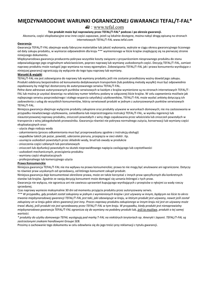MIĘDZYNARODOWE WARUNKI OGRANICZONEJ GWARANCJI TEFAL/T-FAL* : www.tefal.com Ten produkt może być naprawiany przez TEFAL/T-FAL* podczas i po okresie gwarancji. Akcesoria, części eksploatacyjne oraz inne części zapasowe, jeżeli są lokalnie dostępne, można nabyć drogą opisaną na stronach internetowych TEFAL/T-FAL www.tefal.com Gwarancja Gwarancja TEFAL/T-FAL obejmuje wady fabryczne materiałów lub jakość wykonania, wykryte w ciągu okresu gwarancyjnego liczonego od daty zakupu produktu, w wymiarze odpowiednim dla kraju *** wymienionego w liście krajów znajdującej się na pierwszej stronie niniejszego dokumentu. Międzynarodowa gwarancja producenta pokrywa wszystkie koszty związane z przywróceniem niesprawnego produktu do stanu odpowiadającego jego oryginalnym właściwościom, poprzez naprawę lub wymianę uszkodzonych części. Decyzją TEFAL/T-FAL, zamiast naprawy produktu może nastąpić jego wymiana na nowy egzemplarz. Zobowiązania TEFAL/T-FAL jak i prawa konsumenta wynikające z niniejszej gwarancji ograniczają się wyłącznie do tego typu naprawy lub wymiany. Warunki & wyjątki TEFAL/T-FAL nie jest zobowiązana do naprawy lub wymiany produktu jeśli nie zostanie przedłożony ważny dowód jego zakupu. Produkt odebrany bezpośrednio od konsumenta dedykowanym transportem (lub podobną metodą wysyłki) musi być odpowiednio zapakowany by mógł być dostarczony do autoryzowanego serwisu TEFAL/T-FAL. Pełne dane adresowe autoryzowanych punktów serwisowych w każdym z krajów wymienione są na stronach internetowych TEFAL/TFAL lub można je uzyskać dzwoniąc na właściwy numer telefonu podany w załączonej liście krajów. W celu zapewnienia możliwie jak najlepszego serwisu posprzedażnego i stałego wsparcia satysfakcji użytkowników, TEFAL/T-FAL może wysłać ankietę dotyczącą ich zadowolenia z usług do wszystkich konsumentów, którzy serwisowali produkt w jednym z autoryzowanych punktów serwisowych TEFAL/T-FAL. Niniejsza gwarancja obejmuje wyłącznie produkty zakupione oraz produkty używane w warunkach domowych; nie ma zastosowania w przypadku niewłaściwego użytkowania, zaniedbania lub nieprzestrzegania instrukcji TEFAL/T-FAL, w wyniku ingerencji lub nieautoryzowanej naprawy produktu, zniszczeń powstałych z winy złego zapakowania przez właściciela lub zniszczeń powstałych w transporcie z winy jakiegokolwiek przewoźnika. Gwarancja również nie pokrywa normalnego zużycia, konserwacji lub wymiany części eksploatacyjnych oraz: - użycia złego rodzaju wody - zakamienienia (proces odkamieniania musi być przeprowadzany zgodnie z instrukcją obsługi) - wypadków takich jak pożar, powódź, uderzenie pioruna, przepięcia w sieci elektr. itp. - usunięcia uszkodzeń powstałych przez składniki wody, brud lub owady w produkcie - zniszczenia części szklanych lub porcelanowych - zniszczeń lub dysfunkcji powstałych na skutek nieprawidłowego napięcia zasilającego lub częstotliwości - uszkodzeń mechanicznych, przeciążenia produktu - wymiany części eksploatacyjnych - profesjonalnego lub komercyjnego użycia Prawa Konsumenckie Niniejsza gwarancja TEFAL/T-FAL nie ma wpływu na prawa konsumenckie; prawa te nie mogą być anulowane ani ograniczone. Dotyczy to również praw uzyskanych od sprzedawcy, od którego konsument zakupił produkt. Niniejsza gwarancja daje konsumentowi określone prawa, może on także korzystać z innych praw specyficznych dla konkretnych stanów lub krajów. Zgodnie ze swoją decyzją konsument może domagać się uznania któregoś z tych praw. Gwarancja nie wyłącza, nie ogranicza ani nie zawiesza uprawnień kupującego wynikających z przepisów o rękojmi za wady rzeczy sprzedanej. Czas naprawy wyniesie maksymalnie 30 dni od momentu przyjęcia produktu przez autoryzowany serwis. *** W przypadku, gdy produkt został zakupiony w jednym z wymienionych krajów i jest używany w innym, będącym na liście to okres trwania międzynarodowej gwarancji TEFAL/T-FAL jest taki, jaki obowiązuje w kraju, w którym produkt jest używany, nawet jeśli został zakupiony on w kraju gdzie okres gwarancji jest inny. Proces naprawy produktu zakupionego w innym kraju niż jest on używany może trwać dłużej, jeśli produkt nie jest sprzedawany przez TEFAL/T-FAL w tym kraju. W przypadku, kiedy produkt jest nienaprawialny międzynarodowa gwarancja TEFAL/T-FAL ogranicza się do wymiany na podobny produkt lub, jeśli to możliwe, produkt o tej samej wartości. * produkty do użytku domowego TEFAL występują pod marką T-FAL na niektórych terytoriach np. Ameryki i Japonii. TEFAL/T-FAL są zastrzeżonymi znakami handlowymi Groupe SEB. Prosimy o zachowanie tego dokumentu w celu odowłania się do jego treści przy reklamacji z tytułu gwarancji.
