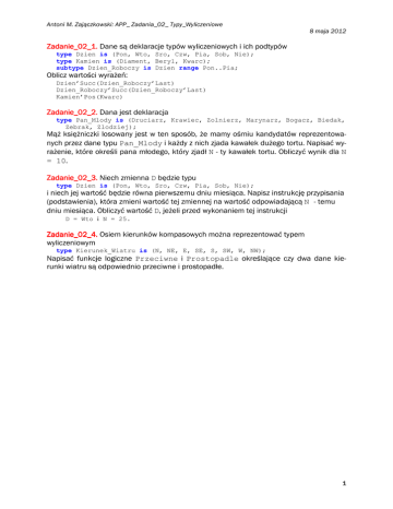 Antoni M. Zajączkowski: APP_ Zadania_02_ Typy_Wyliczeniowe 8 maja 2012 Zadanie_02_1 Zadanie_02_1. _02_1. Dane są deklaracje typów wyliczeniowych i ich podtypów type Dzien is (Pon, Wto, Sro, Czw, Pia, Sob, Nie); type Kamien is (Diament, Beryl, Kwarc); subtype Dzien_Roboczy is Dzien range Pon..Pia; Oblicz wartości wyrażeń: Dzien’Succ(Dzien_Roboczy’Last) Dzien_Roboczy’Succ(Dzien_Roboczy’Last) Kamien’Pos(Kwarc) Zadanie_02_2 Zadanie_02_2. Dana jest deklaracja type Pan_Mlody is (Druciarz, Krawiec, Zolnierz, Marynarz, Bogacz, Biedak, Zebrak, Zlodziej); Mąż księżniczki losowany jest w ten sposób, że mamy ośmiu kandydatów reprezentowanych przez dane typu Pan_Mlody i każdy z nich zjada kawałek dużego tortu. Napisać wyrażenie, które określi pana młodego, który zjadł N - ty kawałek tortu. Obliczyć wynik dla N = 10. Zadanie_02_3 Zadanie_02_3. Niech zmienna D będzie typu type Dzien is (Pon, Wto, Sro, Czw, Pia, Sob, Nie); i niech jej wartość będzie równa pierwszemu dniu miesiąca. Napisz instrukcję przypisania (podstawienia), która zmieni wartość tej zmiennej na wartość odpowiadającą N - temu dniu miesiąca. Obliczyć wartość D, jeżeli przed wykonaniem tej instrukcji D = Wto i N = 25. Zadanie_02_4 Zadanie_02_4. Osiem kierunków kompasowych można reprezentować typem wyliczeniowym type Kierunek_Wiatru is (N, NE, E, SE, S, SW, W, NW); Napisać funkcje logiczne Przeciwne i Prostopadle określające czy dwa dane kierunki wiatru są odpowiednio przeciwne i prostopadłe. 1