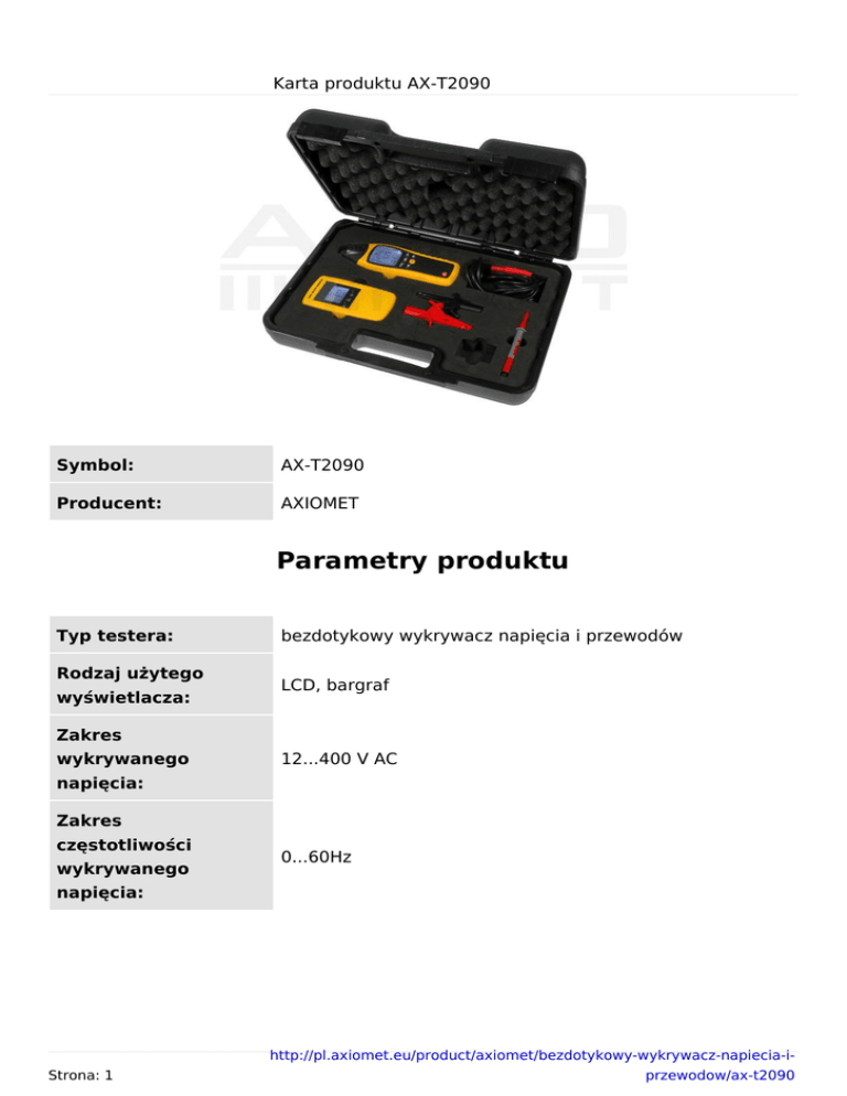Karta produktu AX-T2090 Symbol: AX-T2090 Producent: AXIOMET Parametry produktu Typ testera: Rodzaj użytego wyświetlacza: bezdotykowy wykrywacz napięcia i przewodów LCD, bargraf Zakres wykrywanego 12...400 V AC napięcia: Zakres częstotliwości wykrywanego 0...60Hz napięcia: http://pl.axiomet.eu/product/axiomet/bezdotykowy-wykrywacz-napiecia-iStrona: 1 przewodow/ax-t2090 Karta produktu AX-T2090 Wykrywanie: wykrywanie napięcia do głębokości 0,4 m, wykrywanie przewodów do głębokości 0,5 m (zastosowanie 2biegunowe), wykrywanie przewodów do głębokości 2 m (zastosowanie 1-biegunowe) Sygnał wyjściowy: Stopień zanieczyszczenia: 125kHz 2 Temperatura pracy: 0...40 °C Wymiary odbiornika: 192 x 61 x 37 mm Wymiary nadajnika: 130 x 69 x 32 mm Masa odbiornika: 180 g Masa nadajnika: 130 g Źródło zasilania: 1 bateria 9V 6F22 (nadajnik), 1 bateria 9V 6F22 (odbiornik), brak baterii w zestawie Właściwości przyrządów pomiarowych: automatyczne wyłączanie lokalizowanie tras kabli w gruncie lokalizowanie tras metalowych rur instalacji wodnych i centralnego ogrzewania lokalizowanie właściwego zabezpieczenia odpowiedniego obwodu elektrycznego zestaw złożony z nadajnika i odbiornika wykrywanie przerw i zwarć w przewodach wykrywanie przewodów w ścianach Wyposażenie standardowe: końcówki pomiarowe krokodylki przewody pomiarowe Heavy Duty walizka przenośna http://pl.axiomet.eu/product/axiomet/bezdotykowy-wykrywacz-napiecia-iStrona: 2 przewodow/ax-t2090 Karta produktu AX-T2090 Zgodność z normą: EN61010 300V CAT III Informacje dodatkowe Masa brutto: 2,132 kg http://pl.axiomet.eu/product/axiomet/bezdotykowy-wykrywacz-napiecia-iStrona: 3 przewodow/ax-t2090