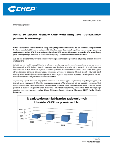 Warszawa, 30.07.2015 Informacja prasowa Ponad 80 procent klientów CHEP widzi firmę jako strategicznego partnera biznesowego CHEP – światowy lider w zakresie usług wynajmu palet i kontenerów po raz czwarty przeprowadził badanie satysfakcji klientów metodą NPS (Net Promotor Score). Jak wynika z tegorocznego pomiaru, wykonanego wśród 450 firm współpracujących z CHEP ponad 80 procent respondentów widzi firmę jako strategicznego partnera w zakresie współpracy i zarządzania łańcuchem dostaw. Już po raz czwarty CHEP Polska zdecydowało się na zmierzenie poziomu satysfakcji swoich klientów metodą NPS. Jakość, serwis i dział obsługi klienta to obszary współpracy bardzo wysoko ocenione przez partnerów biznesowych CHEP Polska. Wynik tegorocznego badania metodą NPS wskazał, iż średni poziom zadowolenia w tym zakresie wynosi ponad 85 procent. Ponad 80 % klientów CHEP widzi firmę jako strategicznego partnera biznesowego. Niezwykle wysoko w badaniu, klienci ocenili również dział obsługi klienta CHEP (Account Management), wskazując na jego szybki, sprawny i profesjonalny serwis. Poziom satysfakcji w tym obszarze wyniósł aż 90%. Tegoroczny wynik badania satysfakcji klientów jest imponujący, najbardziej satysfakcjonujące jest jednak to, że zadowolenie klientów z naszych usług już od lat utrzymuje się na wysokim poziomie. Taki wynik nie mógłby zostać osiągnięty bez solidnych podstaw jakie zbudowaliśmy przez 15 lat na rynku polskim, a przede wszystkim dzięki zgranemu i ambitnemu zespołowi, który na co dzień opiekuje się i wspiera naszych klientów – mówi Kinga Di Salvo, Country General Manager, CHEP Polska i kraje bałtyckie. % zadowolonych lub bardzo zadowolonych klientów CHEP na przestrzeni lat 84% 82% 80% 78% 2012 2013 2014 2015 Anna Wójcik VMG PR e-mail: [email protected] tel. +48. 698 683 510 Dzięki cykliczności badania jesteśmy w stanie ocenić jak na przestrzeni lat plasuje się poziom satysfakcji klientów z naszych usług. Pomimo bardzo wysokich ocen nie spoczywamy na laurach, wciąż rozwijając i ulepszając nasze usługi. W zeszłym roku otworzyliśmy kolejne, 6-te już centrum serwisowe, w tym roku przekroczyliśmy pułap 9.000 punktów dystrybucyjnych na terenie całego kraju, z którymi współpracujemy oraz wydaliśmy naszym klientom ponad 17 milionów palet – podkreśla Kinga Di Salvo. Tak wysoki poziom satysfakcji z usług firmy jest sygnałem, że procesy operacyjne w CHEP są dobrze zaprojektowane i wdrożone. Jest to również silna mobilizacja do dalszego rozwoju i wprowadzania innowacyjnych rozwiązań, tak aby wzmacniać rolę firmy jako strategiczneg partnera rynkowego w łańcuchu dostaw. Badanie satysfakcji co roku jest przeprowadzane metodą NPS (Net Promoter Score), która w sposób prosty i szybki mierzy to, co wydawałoby się nieuchwytne - emocje klientów, ponieważ poprzez NPS klient wyraża swoje przywiązanie do marki lub jego brak. Pomiar przeprowadzany jest na dwóch grupach klientów CHEP: użytkownikach palet czyli producentach FMCG oraz sieciach dystrybucji, które otrzymują towar na paletach CHEP. Każda grupa badana jest oddzielnie, ponieważ często współpraca między CHEP a poszczególnymi firmami przebiega na różnych płaszczyznach. Metodologia i wskaźnik lojalności i zadowolenia klientów mierzone są w skali od 1 do 10. FIRMA CHEP jest światowym liderem w dostarczaniu kompleksowych rozwiązań w zakresie zarządzania paletami. Założona w 1945 roku, działa aktualnie w ponad 50 krajach świata świadcząc usługi największym globalnym firmom z sektora dóbr konsumpcyjnych. Właścicielem firmy jest Grupa Brambles Limited notowana na australijskiej giełdzie papierów wartościowych. Do Grupy Brambles należą oprócz CHEP - IFCO, Pallecon, Transpac oraz Ferguson Group. CHEP oferuje usługę poolingu palet, która polega na współużytkowaniu stałej jakości palet i kontenerów przez wielu klientów. Pooling jest strategicznym rozwiązaniem biznesowym dla firm, które chcą ograniczyć wydatki kapitałowe i poprawić działanie łańcucha dostaw. Rozwiązania logistyczne CHEP są przyjazne dla środowiska i pomagają chronić produkty klientów poprzez połączenie wieloletniego doświadczenia oraz ogromnej bazy aktywów. CHEP zatrudnia ponad 9,5 tys. pracowników, zarządza blisko 250 milionami palet. W Europie CHEP posiada ponad 400 magazynów serwisowych palet. CHEP w Polsce istnieje od 15 lat, a z jego systemu korzysta ponad 550 przedsiębiorstw, w tym firmy polskie, jak i koncerny międzynarodowe. Aktualnie CHEP Polska wydaje rocznie ponad 15 mln palet swoim klientom w Polsce oraz odbiera palety z ponad 9.000 punktów dystrybucyjnych. Palety podlegają inspekcji i naprawie w Centrach Serwisowych – Kampinos, Radom, Świętochłowice, Gądki, Bydgoszcz, Niewiadów. Za swoje zaangażowanie we wdrażanie idei zrównoważonego rozwoju firma otrzymała nagrody: Przedsiębiorca Efektywny Surowcowo 2013 oraz Promotor Ekologii 2015. W 2015 roku firma CHEP Polska otrzymała także tytuł Gazeli Biznesu przyznawany przez dziennik gospodarczy Puls Biznesu. Więcej informacji na: www.goforchep.com/pl I www.chep.com Anna Wójcik VMG PR e-mail: [email protected] tel. +48. 698 683 510