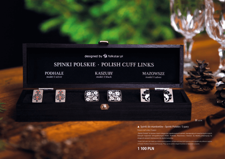 12176 Spinki do mankietów - Spinki Polskie / 3 pary Polish Cuff Links / 3 pairs „Spinki Polskie” to zestaw trzech elegancko zapakowanych spinek, nawiązujących swą formą do trzech różnych regionów etnograficznych Polski: Podhala, Mazowsza i Kaszub. Są idealną propozycją na elegancki prezent biznesowy lub dyplomatyczny. “Polish Cuff Links” are made up of three stylishly packed cuff links with their form typical of ethnographically different regions of Poland: Podhale, Masovia and Kaszuby. They can be perfect elegant business or diplomatic presents. 1 100 PLN Spinki polskie Polish cuff links Produkt polski Product of Poland Projekt Design ŁOWICZ 12417 ŁOWICZ 12409 ŁOWICZ 12414 ŁOWICZ 12415 ŁOWICZ 12413 ŁOWICZ 12412 ŁOWICZ 12774 KASZUBY 12410 PODHALE 12416 model I silver model II silver model III blue W 2013 r. Folkstar stworzył serię unikatowych spinek do mankietów. Wykonane z polskiego srebra i zdobione szlachetnymi emaliami dodatki to inspirowana polskimi motywami ludowymi seria dla osób ceniących elegancję oraz oryginalność. Poszczególne wzory produkowane są w ilości od kilku do kilkunastu egzemplarzy. Autorska kolekcja obejmuje najwyższej jakości wyroby nawiązujące do sztuki ludowej m.in. Podhala, Kaszub i leżącego na Mazowszu, dawnego Księstwa Łowickiego. In 2013 Folkstar created a line of unique cuff links. Made from Polish silver, ornamented with refined enamels, these accessories were inspired by folk motifs. It is a series for people appreciating elegance and sophistication. Individual patterns are produced only in several copies. This designer collection includes top quality articles related to regional folk art of Podhale, Kaszuby and located in Masovia former Duchy of Łowicz. model IV red model V red model VI blue Spinki do mankietów - „Spinki Polskie” / para Polish Cuff Links / pair Komplet oryginalnych srebrnych spinek do mankietów wykonanych z wysokiej jakości srebra próby 925 zdobione szlachetnymi emaliami. Pakowane w eleganckie drewniane pudełko. 390 PLN model VI black model I black model I silver