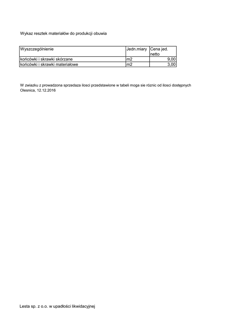 Wykaz resztek materiałów do produkcji obuwia Wyszczególnienie końcówki i skrawki skórzane końcówki i skrawki materiałowe Jedn.miary Cena jed. netto m2 9,00 m2 3,00 W zwiazku z prowadzona sprzedaza ilosci przedstawione w tabeli moga sie róznic od ilosci dostępnych Olesnica, 12.12.2016 Lesta sp. z o.o. w upadłości likwidacyjnej
