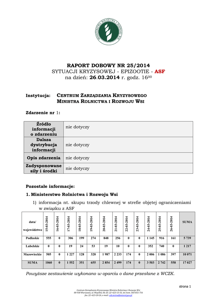 RAPORT DOBOWY NR 25/2014 SYTUACJI KRYZYSOWEJ - EPIZOOTIE - ASF na dzień: 26.03.2014 r. godz. 1600 Instytucja: CENTRUM ZARZĄDZANIA KRYZYSOWEGO MINISTRA ROLNICTWA I ROZWOJU WSI Zdarzenie nr 1: Źródło informacji o zdarzeniu Dalsza dystrybucja informacji nie dotyczy nie dotyczy Opis zdarzenia nie dotyczy Zadysponowane nie dotyczy siły i środki Pozostałe informacje: 1. Ministerstwo Rolnictwa i Rozwoju Wsi 19-03-2014 20-03-2014 21-03-2014 24-03-2014 25-03-2014 26-03-2014 23-03-2014 18-03-2014 22-03-2014 17-03-2014 555 0 306 199 274 848 256 0 0 1 145 916 161 5 739 Lubelskie 0 0 19 24 53 19 10 0 0 352 740 0 1 217 Mazowieckie 505 0 1 227 128 328 1 987 2 233 174 0 2 006 1 086 397 10 071 SUMA 1060 0 1 552 351 655 2 854 2 499 174 0 3 503 2 742 558 17 027 województwo 16-03-2014 Podlaskie data/ 15-03-2014 1) informacja nt. skupu trzody chlewnej w strefie objętej ograniczeniami w związku z ASF SUMA Powyższe zestawienie wykonano w oparciu o dane przesłane z WCZK. strona 1 Centrum Zarządzania Kryzysowego Ministra Rolnictwa i Rozwoju Wsi 00-930 Warszawa, ul. Wspólna 30, tel. 22~623-13-31, tel. kom. 503-851-716 fax. 22~623-20-26, e-mail: [email protected] 2) W ramach działań wewnątrz resortowych Dyrektor Państwowego Instytutu Weterynaryjnego - Państwowego Instytutu Badawczego przedstawił Ministrowi RiRW propozycje dotyczące przygotowania sprzętowego do likwidacji ewentualnych ognisk ASF w populacji świń domowych. Likwidacja i utylizacja w miejscu ogniska wymaga dysponowania specjalistycznym sprzętem pozwalającym na ubicie i utylizację świń z różnej wielkości ognisk (od kilku do kilku tysięcy świń). Ponadto zostały przedstawione propozycje dotyczące warunków bioasekuracji, które powinny być wypełnione przez producentów i hodowców świń, których chlewnie zlokalizowane są w uznanym za obszar zakażony i buforowy w odniesieniu do ASF. 3) 25 marca 2013 r. w Genewie odbyło się spotkanie bilateralne pomiędzy Komisją Europejską a Federacją Rosyjską w związku z zakazem eksportu świń i wieprzowiny z UE do Federacji Rosyjskiej. Głównym tematem była sytuacja związana ze wstrzymaniem eksportu świń i wieprzowiny przez RF z UE w związku z przypadkami ASF u dzików w UE. 2. Krajowe Laboratorium Referencyjne ds. ASF - Zakład Chorób Świń PIWet-PIB w Puławach KLR wykonuje badania wirusologiczne i serologiczne w kierunku ASF próbek pobieranych przez Powiatowych Lekarzy Weterynarii. Od godziny 14.00 dnia wczorajszego (25.03) do dnia dzisiejszego (26.03) do godz. 14.00 nie stwierdzono dodatnich wyników badań w kierunku ASF. 3. Wojewódzkie Centrum Zarządzania Kryzysowego Podlaskiego Urzędu Wojewódzkiego informuje: 4) na obszarze objętym ograniczeniami (dane narastająco): a) ilość wydanych zgód na wykonywanie polowań – 69; b) ilość wydanych pozwoleń na przemieszczanie świń - 358 ; - do gospodarstw – 8 pozwolenia /882 sztuk świń na obszarze objętym ograniczeniami - do gospodarstw – 8 pozwoleń /4432 sztuk świń poza obszar objęty ograniczeniami; - do rzeźni 169 pozwoleń /4343 sztuk świń na obszarze objętym ograniczeniami; - do rzeźni 165 pozwoleń /3068 sztuk świń poza obszar objętym ograniczeniami. 5) według informacji przekazanych z Powiatowych Inspektoratów Weterynarii na terenie obszaru objętego ograniczeniami w dniu 25.03.2014 r.: strona 2 Centrum Zarządzania Kryzysowego Ministra Rolnictwa i Rozwoju Wsi 00-930 Warszawa, ul. Wspólna 30, tel. 22~623-13-31, tel. kom. 503-851-716 fax. 22~623-20-26, e-mail: [email protected] - został uruchomiony skup trzody chlewnej na terenie powiatu bielskiego. W dniu 25.03.2014 r. skupiono 17 sztuk świń z 1 gospodarstwa; - uruchomiono Punkt Skupu Zwierząt w Grodzisku (powiat siemiatycki) z którego wysłano 22 tuczniki do Zakładów Mięsnych „Zakrzewscy” w Kosowie Lackim pow. Sokołów Podl.; - wydano w ramach skupu 44 pozwolenia na 174 sztuki trzody chlewnej na terenie powiatu sokólskiego. 4. Wojewódzkie Centrum Zarządzania Kryzysowego Lubelskiego Urzędu Wojewódzkiego 1) wydane pozwolenia na polowania: 0 (wydane poprzednio 48 są jeszcze aktualne - mają ważność 30 dni ); 2) pozwolenia na przemieszczanie świń: a) do stad: 1 (narastająco do 10 stad/dla 733 szt. świń); b) do rzeźni: 71 dla 2241 szt. (narastająco 450 dla 18574 szt.) z czego w rzeźniach na terenie woj. lubelskiego ubito: 2695 szt. 3) na terenie województwa lubelskiego ubój świń z terenu powiatu bialskiego oraz włodawskiego prowadzą 6 podmioty gospodarcze: PPH Rossosz, GS Wisznice, PPHU GRAMAR, Zakłady Mięsne Henryk Amanowicz, Ł-meat i Wierzejki. 5. Wojewódzkie Centrum Urzędu Wojewódzkiego Zarządzania Kryzysowego Mazowieckiego 1) na obszarze objętym ograniczeniami (dane narastająco): a) ilość wydanych zgód na wykonywanie polowań – 1; b) ilość wydanych pozwoleń na przemieszczanie świń - 382; - do gospodarstw – 2 pozwolenia/ 770 sztuk świń na obszarze objętym ograniczeniami; - do gospodarstw – 0 pozwoleń / 0 sztuk świń poza obszar objęty ograniczeniami; - do rzeźni - 0 pozwoleń /0 sztuk świń na obszarze objętym ograniczeniami; - do rzeźni 380 pozwoleń / 10565 sztuk świń poza obszar objęty ograniczeniami. 2) według informacji przekazanych z Powiatowych Inspektoratów Weterynarii na terenie powiatu łosickiego w dniu 26.03.2014 r. objętego ograniczeniami skup trzody chlewnej był prowadzony w następujących punktach: a) Mostów, gmina Huszlew – 66 szt.; b) Sarnaki, gmina Sarnaki – 24 szt.; c) Stare Szpaki, gmina Stara Kornica – 87 szt.; d) Niemojki, gmina Łosice – 62 szt. strona 3 Centrum Zarządzania Kryzysowego Ministra Rolnictwa i Rozwoju Wsi 00-930 Warszawa, ul. Wspólna 30, tel. 22~623-13-31, tel. kom. 503-851-716 fax. 22~623-20-26, e-mail: [email protected] 6. Główny Lekarz Weterynarii wystosował pisma do: 1) WLW z poleceniem stałego przeglądu magazynów przeciwepizootycznych oraz z prośbą o zorganizowanie i przeprowadzenie, w rok