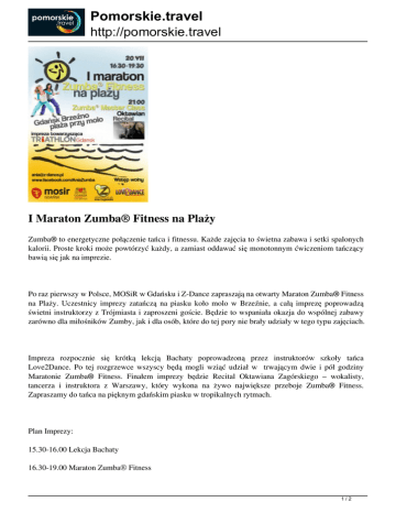 Pomorskie.travel http://pomorskie.travel I Maraton Zumba® Fitness na Plaży Zumba® to energetyczne połączenie tańca i fitnessu. Każde zajęcia to świetna zabawa i setki spalonych kalorii. Proste kroki może powtórzyć każdy, a zamiast oddawać się monotonnym ćwiczeniom tańczący bawią się jak na imprezie. Po raz pierwszy w Polsce, MOSiR w Gdańsku i Z-Dance zapraszają na otwarty Maraton Zumba® Fitness na Plaży. Uczestnicy imprezy zatańczą na piasku koło molo w Brzeźnie, a całą imprezę poprowadzą świetni instruktorzy z Trójmiasta i zaproszeni goście. Będzie to wspaniała okazja do wspólnej zabawy zarówno dla miłośników Zumby, jak i dla osób, które do tej pory nie brały udziały w tego typu zajęciach. Impreza rozpocznie się krótką lekcją Bachaty poprowadzoną przez instruktorów szkoły tańca Love2Dance. Po tej rozgrzewce wszyscy będą mogli wziąć udział w trwającym dwie i pół godziny Maratonie Zumba® Fitness. Finałem imprezy będzie Recital Oktawiana Zagórskiego – wokalisty, tancerza i instruktora z Warszawy, który wykona na żywo największe przeboje Zumba® Fitness. Zapraszamy do tańca na pięknym gdańskim piasku w tropikalnych rytmach. Plan Imprezy: 15.30-16.00 Lekcja Bachaty 16.30-19.00 Maraton Zumba® Fitness 1/2 Pomorskie.travel http://pomorskie.travel 21.00 Oktawian - Recital & Zumba® Master Class Organizatorzy: Z-Dance Ania Cegłowska & MOSiR w Gdańsku Partnerzy: Pomorska Szkoła Tańca Love2Dance Maraton poprowadzą: Z-Dance: Ania Cegłowska, Aga Piotrowicz, Misia Mrozińska, Ania Pawlak Ola Kloska, Magdalena Mijal, Sara Hebel Love2Dance: Magda & Bartek Maciejewicz Goście: Oktawian Zagórski (Warszawa) Karol Hoffman (Elbląg) Agata Oskroba (Słupsk) Anna Wojnarowska (Koszalin) Iza Grzenkowicz (Sierakowice/Lębork) Natalia Wnukowska (Gdańsk) Łukasz Łukaszewicz, Marta Skierka, Karolina Landowska (Project Dance-Wejherowo) Asia Zajdel (Gdańsk) WSTĘP WOLNY kontakt: [email protected] Zapraszamy! PCIT 2/2 Powered by TCPDF (www.tcpdf.org)