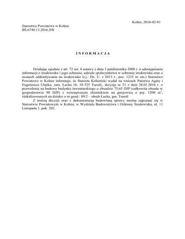 Kolno, 2016-02-01 Starostwo Powiatowe w Kolnie BŚ.6740.13.2016.SW INFORMACJA Działając zgodnie z art. 72 ust. 6 ustawy z dnia 3 października 2008 r. o udostępnianiu informacji o środowisku i jego ochronie, udziale społeczeństwa w ochronie środowiska oraz o ocenach oddziaływania na środowisko (t.j.: Dz. U. z 2013 r., poz. 1235 ze zm.) Starostwo Powiatowe w Kolnie informuje, że Starosta Kolneński wydał na wniosek Państwa Agaty i Eugeniusza Ulążka, zam. Łacha 16, 18-525 Turośl,, decyzję nr 21 z dnia 28.01.2016 r. o pozwoleniu na budowę budynku inwentarskiego o obsadzie 75,65 DJP (całkowita obsada w gospodarstwie 90 DJP) z wewnętrznym zbiornikiem na gnojowicę o poj. 1200 m3, zlokalizowanych na działce o nr geod.: 89/2 – obręb Łacha, gm. Turośl. Z treścią decyzji oraz z dokumentacją budowlaną sprawy można zapoznać się w Starostwie Powiatowym w Kolnie, w Wydziale Budownictwa i Ochrony Środowiska, ul. 11 Listopada 1, pok. 202.