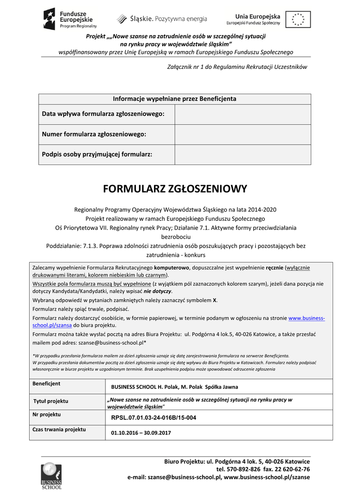 Projekt „„Nowe szanse na zatrudnienie osób w szczególnej sytuacji na rynku pracy w województwie śląskim” współfinansowany przez Unię Europejską w ramach Europejskiego Funduszu Społecznego Załącznik nr 1 do Regulaminu Rekrutacji Uczestników Informacje wypełniane przez Beneficjenta Data wpływa formularza zgłoszeniowego: Numer formularza zgłoszeniowego: Podpis osoby przyjmującej formularz: FORMULARZ ZGŁOSZENIOWY Regionalny Programy Operacyjny Województwa Śląskiego na lata 2014-2020 Projekt realizowany w ramach Europejskiego Funduszu Społecznego Oś Priorytetowa VII. Regionalny rynek Pracy; Działanie 7.1. Aktywne formy przeciwdziałania bezrobociu Poddziałanie: 7.1.3. Poprawa zdolności zatrudnienia osób poszukujących pracy i pozostających bez zatrudnienia - konkurs Zalecamy wypełnienie Formularza Rekrutacyjnego komputerowo, dopuszczalne jest wypełnienie ręcznie (wyłącznie drukowanymi literami, kolorem niebieskim lub czarnym). Wszystkie pola formularza muszą być wypełnione (z wyjątkiem pól zaznaczonych kolorem szarym), jeżeli dana pozycja nie dotyczy Kandydata/Kandydatki, należy wpisać nie dotyczy. Wybraną odpowiedź w pytaniach zamkniętych należy zaznaczyć symbolem X. Formularz należy spiąć trwale, podpisać. Formularz należy dostarczyć osobiście, w formie papierowej, w terminie podanym w ogłoszeniu na stronie www.businessschool.pl/szansa do biura projektu. Formularz można także wysłać pocztą na adres Biura Projektu: ul. Podgórna 4 lok.5, 40-026 Katowice, a także przesłać mailem pod adres: [email protected]* *W przypadku przesłania formularza mailem za dzień zgłoszenia uznaje się datę zarejestrowania formularza na serwerze Beneficjenta. W przypadku przesłania dokumentów pocztą za dzień zgłoszenia uznaje się datę wpływu do Biura Projektu w Katowicach. Formularz należy podpisać własnoręcznie w biurze projektu w uzgodnionym terminie. Brak uzupełnienia podpisu może spowodować odrzucenie zgłoszenia Beneficjent Tytuł projektu Nr projektu Czas trwania projektu BUSINESS SCHOOL H. Polak, M. Polak Spółka Jawna „Nowe szanse na zatrudnienie osób w szczególnej sytuacji na rynku pracy w województwie śląskim” RPSL.07.01.03-24-016B/15-004 01.10.2016 – 30.09.2017 Biuro Projektu: ul. Podgórna 4 lok. 5, 40-026 Katowice tel. 570-892-826 fax. 22 620-62-76 e-mail: [email protected], www.business-school.pl/szanse Projekt „„Nowe szanse na zatrudnienie osób w szczególnej sytuacji na rynku pracy w województwie śląskim” współfinansowany przez Unię Europejską w ramach Europejskiego Funduszu Społecznego DANE OSOBOWE Imię (Imiona) i nazwisko PESEL Wiek 1 Miejsce urodzenia Płeć Telefon kontaktowy (komórkowy, ewentualnie domowy) Adres e-mail Wybrany kanał komunikacji Telefon komórkowy e-mail K M Inny …………………... MIEJSCE ZAMIESZKANIA2 Miejscowość: ……………………………………………………………….……………………………………… Ulica: ……………………………………..……………………………………………………………….……… Nr domu:………………… Nr lokalu:…..……..… Kod pocztowy: …………………..……. Gmina: …………………………….………………………. Powiat:………………………………..…..……………… Województwo: ……………………………………………………… Kraj: ……………………………………………….. 3 Obszar według urbanizacji (DEGURBA) (wypełnia Organizator): obszary słabo zaludnione (wiejskie) tereny pośrednie (miasta, przedmieście) tereny gęsto zaludnione (miasta, centra miejskie, obszary miejskie) 1 Wiek uczestników określany jest na podstawie daty urodzenia i ustalany w dniu rozpoczęcia udziału w projekcie 2 Zgodnie z Kodeksem Cywilnym miejscem zamieszkania osoby fizycznej jest miejscowość, w której osoba ta przebywa z zamiarem stałego pobytu. 3 Zgodnie z klasyfikacją DEGURBA jednostki przestrzenne przyporządkowane są do następujących kategorii: słabo zaludnione, pośrednie, gęsto zaludnione. Założenia metodologiczne DEGURBA opierają się na kryterium gęstości zaludnienia i minimalnej liczby ludności. Zaklasyfikowanie terenów jako: obszary słabo zaludnione (wiejskie)–50% ludności zamieszkuje obszary wiejskie; pośrednie (miasta, przedmieścia) – poniżej 50% ludności zamieszkuje obszary wiejskie i poniżej 50% ludności obszary o dużej gęstości zaludnienia; tereny gęsto zaludnione (miasta, centra miejskie, obszary miejskie)–przynajmniej 50% ludności zamieszkuje obszary gęsto zaludnione. Biuro Projektu: ul. Podgórna 4 lok. 5, 40-026 Katowice tel. 570-892-826 fax. 22 620-62-76 e-mail: [email protected], www.business-school.pl/szanse Projekt „„Nowe szanse na zatrudnienie osób w szczególnej sytuacji na rynku pracy w województwie śląskim” współfinansowany przez Unię Europejską w ramach Europejskiego Funduszu Społecznego Adres korespondencyjny (jeżeli jest inny niż zamieszkania) Miejscowość: ……………………………………………………………….……………………………………… Ulica inumer: …………………………………………:………Kod pocztowy: …………………. WYKSZTAŁCENIE brak - brak formalnego wykształcenia podstawowe - kształcenie ukończone na poziomie szkoły podstawowej gimnazjalne - kształcenie ukończone na poziomie szkoły gimnazjalnej ponadgimnazjalne - kształcenie ukończone na poziomie szkoły średniej lub zasadniczej szkoły zawodowej policealne - kształcenie ukończone na poziomie wyższym niż kształcenie na poziomie szkoły średniej, które jednocześnie nie jest wykształceniem wyższym wyższe krótkiego cyklu - kształcenie ukończone na poziomie studiów krótkiego cyklu, które jednocześnie nie jest wykształceniem licencjackim, magisterskim i doktoranckim wyższe li