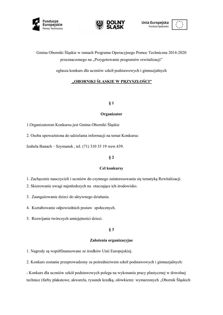 Gmina Oborniki Śląskie w ramach Programu Operacyjnego Pomoc Techniczna 2014-2020 przeznaczonego na „Przygotowanie programów rewitalizacji” ogłasza konkurs dla uczniów szkół podstawowych i gimnazjalnych „OBORNIKI ŚLĄSKIE W PRZYSZŁOŚCI” §1 Organizator 1.Organizatorem Konkursu jest Gmina Oborniki Śląskie 2. Osoba upoważniona do udzielania informacji na temat Konkursu: Izabela Banach – Szymanek , tel. (71) 310 35 19 wew.439. §2 Cel konkursy 1. Zachęcenie nauczycieli i uczniów do czynnego zainteresowania się tematyką Rewitalizacji. 2. Skierowanie uwagi najmłodszych na otaczające ich środowisko. 3. Zaangażowanie dzieci do aktywnego działania. 4. Kształtowanie odpowiednich postaw społecznych. 5. Rozwijanie twórczych umiejętności dzieci. §3 Założenia organizacyjne 1. Nagrody są współfinansowane ze środków Unii Europejskiej. 2. Konkurs zostanie przeprowadzony za pośrednictwem szkół podstawowych i gimnazjalnych: - Konkurs dla uczniów szkół podstawowych polega na wykonaniu pracy plastycznej w dowolnej technice (farby plakatowe, akwarela, rysunek kredką, ołówkiem) wymarzonych „Obornik Śląskich w przyszłości”. Format i sposób opisu prac: - praca formatu A3 + oprawa: biały karton, ramka o szerokości 4 cm. UWAGA! Na odwrocie pracy pieczątka szkoły, imię i nazwisko autora, wiek lub klasa. - Konkurs dla uczniów szkół gimnazjalnych polega na wykonaniu prezentacji multimedialnej wymarzonych „Obornik Śląskich w przyszłości”. Uczniowie wykonują prezentację multimedialną w programie Microsoft PowerPoint. Pojemność prezentacji nie może przekraczać 10 slajdów. Prezentację należy zapisać na płycie CD. Do płyt CD z prezentacją należy dołączyć następujące dane: tytuł prezentacji, imię i nazwisko ucznia, klasa, adres szkoły, imię i nazwisko opiekuna oraz jego adres e-mail. Kryteria oceny prezentacji: a) efekty wizualne i dźwiękowe – estetyka pracy, b) merytoryczność prezentacji, c) oryginalność projektu, d) zastosowanie różnych narzędzi programu Microsoft PowerPoint. 3. Prace nadesłane na Konkurs muszą być pracami własnymi , nigdzie wcześniej niepublikowanymi, nie przedstawianymi na innych konkursach. Złożenie pracy na Konkurs jest jednoznaczne ze złożeniem deklaracji o tych faktach. 4. Tematyka prac ma obejmować pomysły na zmiany , które powinny zajść w najbliższym otoczeniu uczniów przy nacisku na hasło przewodnie konkursu „Oborniki Śląskie w przyszłości”. 5. Udział w konkursie jest jednoznaczny z nieodpłatnym i na czas nieoznaczony udzieleniem licencji na wykorzystanie prac na następujących polach eksploatacji: druk w dowolnej liczbie publikacji i w dowolnym nakładzie, używania w Internecie oraz w innych formach utrwaleń nadających się do rozpowszechniania (np. Nośniki magnetyczne, elektroniczne , optyczne , CD –ROM wprowadzenie do obrotu, wprowadzenie do pamięci komputera), a także prezentowania prac na wystawach oraz zgodą na ich pierwsze publiczne wykorzystanie. 6. Osoby nadsyłające prace konkursowe wyrażają zgodę na przetwarzanie przez Organizatora Konkursu swoich danych osobowych (Ustawa o ochronie danych osobowych z dnia 29 sierpnia 1997 r. , Dz. U. Nr 133, poz. 833, z późn.zm.). 7. Prace zgłoszone do Konkursu nie będą zwracane autorom. Zgłoszenie prac do konkursu jest równoznaczne z przeniesieniem na Organizatora praw własności złożonych egzemplarzy. 8. Prace nie spełniające zasad uczestnictwa nie będą brane pod uwagę przez Komisję Konkursową. 9. Termin zgłoszenia i złożenia prac - od dnia 25 kwietnia 2016r. do dnia 29 kwietnia 2016 r. do godziny 15.30 w Urzędzie Miejskim w Obornikach Śląskich w pokoju 12 a. §4 Ocena prac konkursowych 1.Konkurs jest złożony z dwóch etapów : 1) Etap I – szkolny: Każda ze szkół może przesłać na konkurs maksymalnie 6 prac , wyłonionych wcześniej w eliminacjach szkolnych ; 2) Etap II – gminny Komisja Konkursowa , powołana przez Organizatora , rozstrzygnie Konkurs wyłaniając laureatów. 2. Prace , które wygrały w etapie szkolnym, powinny zostać dostarczone w zbiorczej kopercie , przy czym każda z prac, za załączonym formularzem zgłoszeniowym , stanowiącym załącznik do niniejszego Regulaminu , z numerem szkoły, z której prace zostały dostarczone. 3. O wyłonieniu zwycięzców konkursu decyduje Komisja Konkursowa , która zostanie powołana przez Burmistrza Obornik Śląskich. 4. Kryteria oceny ustalone zostają w następujący sposób: 1) trafność doboru tematu pracy, 2) jakości wykonania, 3) oryginalność, 4) stopień trudności wykonania. §5 Ogłoszenie wyników Konkursu 1. Lista nagrodzonych osób zostanie opublikowana na stronie internetowej Gminy Oborniki Śląskie . 2. Osoby nagrodzone oraz wyróżnione zostaną powiadomione poprzez Dyrektora szkoły o wynikach Konkursu w terminie do 06.05.2016 r. 3. Prace laureatów, jak również pozostałe prace zgłoszone do konkursu , będą prezentowane na wystawie pokonkursowej (miejsce wystawy zostanie podane w terminie późniejszym na stronie internetowej Gminy Oborniki Śląskie) oraz będą prezentowane na podstronie dotyczącej rewitalizacji. §6 Nagrody 1. Organizator przyzna trzy nagrody za trzy miejsca oraz pięć wyróżnień dla szkół podstawowych i trzy nagrody oraz pięć wyróżnień dla szkół gimnazjalnych: I miejsca: MP 4 , II miejsca : MP 3, III miejsca : pen-drivy . KARTA ZGŁOSZENIA Konkursu „OBORNIKI ŚLĄSKIE W PRZYSZŁOŚCI” 1. Jednostka – podmiot zgłaszający: nazwa, adres: szkoły …………………………………………………………………………………………… …………………………………………………………………………………………… osoba odpowiedzialna ………………………………………………………………… telefon: …………………………………………………………………………
