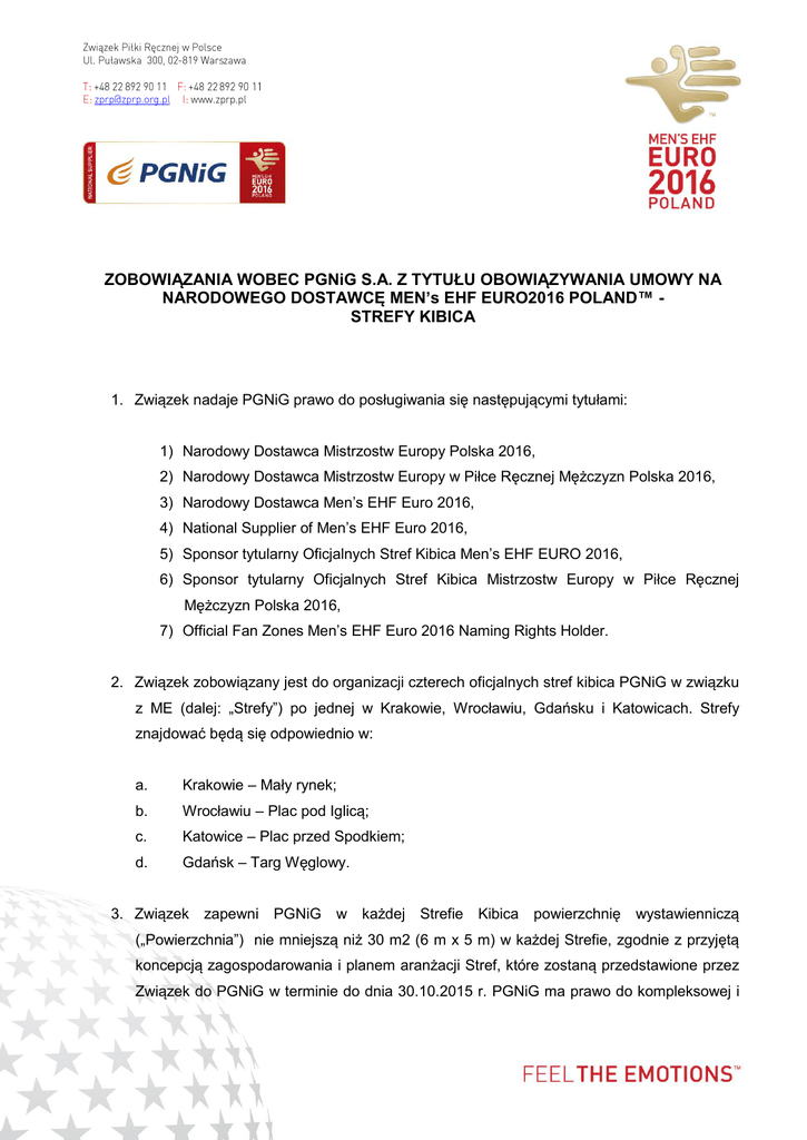 ZOBOWIĄZANIA WOBEC PGNiG S.A. Z TYTUŁU OBOWIĄZYWANIA UMOWY NA NARODOWEGO DOSTAWCĘ MEN’s EHF EURO2016 POLAND™ STREFY KIBICA 1. Związek nadaje PGNiG prawo do posługiwania się następującymi tytułami: 1) Narodowy Dostawca Mistrzostw Europy Polska 2016, 2) Narodowy Dostawca Mistrzostw Europy w Piłce Ręcznej Mężczyzn Polska 2016, 3) Narodowy Dostawca Men’s EHF Euro 2016, 4) National Supplier of Men’s EHF Euro 2016, 5) Sponsor tytularny Oficjalnych Stref Kibica Men’s EHF EURO 2016, 6) Sponsor tytularny Oficjalnych Stref Kibica Mistrzostw Europy w Piłce Ręcznej Mężczyzn Polska 2016, 7) Official Fan Zones Men’s EHF Euro 2016 Naming Rights Holder. 2. Związek zobowiązany jest do organizacji czterech oficjalnych stref kibica PGNiG w związku z ME (dalej: „Strefy”) po jednej w Krakowie, Wrocławiu, Gdańsku i Katowicach. Strefy znajdować będą się odpowiednio w: a. Krakowie – Mały rynek; b. Wrocławiu – Plac pod Iglicą; c. Katowice – Plac przed Spodkiem; d. Gdańsk – Targ Węglowy. 3. Związek zapewni PGNiG w każdej Strefie Kibica powierzchnię wystawienniczą („Powierzchnia”) nie mniejszą niż 30 m2 (6 m x 5 m) w każdej Strefie, zgodnie z przyjętą koncepcją zagospodarowania i planem aranżacji Stref, które zostaną przedstawione przez Związek do PGNiG w terminie do dnia 30.10.2015 r. PGNiG ma prawo do kompleksowej i dowolnej aranżacji i korzystania z Powierzchni. PGNiG jest uprawniona do przeniesienia prawa do aranżacji i korzystania z Powierzchni na podmioty z Grupy Kapitałowej PGNiG. 4. Związek w odniesieniu do 4 Stref Kibica zobowiązany jest do uwzględniania w działaniach komunikacyjnych nazw: 1) „PGNiG – Oficjalna Strefa Kibica EHF EURO2016” lub „PGNiG Official FAN ZONE EHF EURO2016”, 2) PGNiG OD - Oficjalna Strefa Kibica EHF EURO2016” lub „PGNiG OD Official FAN ZONE EHF EURO2016”, 3) PGNiG Obrót Detaliczny - Oficjalna Strefa Kibica EHF EURO2016” lub „PGNiG Obrót Detaliczny Official FAN ZONE EHF EURO2016”, oraz Logo Kompozytowego (w wariancie wskazanym przez PGNiG). Strony ustalą wspólnie, którymi z ww. nazw będą się posługiwać w komunikacji. Związek jest zobowiązany do: a) każdorazowego używania wspólnie ustalonych przez Strony nazw oraz wskazanego przez PGNiG Logo Kompozytowego w odniesieniu do Stref, b) zobowiązania i egzekwowania ich używania od swoich pracowników i współpracowników; c) zobowiązania i egzekwowania ich używania od swoich partnerów, kontrahentów oraz Dostawców pozyskanych przez ZPRP po dniu wejścia w życie Umowy; d) poinformowania i zobowiązania do ich używania obecnych partnerów, kontrahentów oraz Dostawców. 5. Świadczenia i uprawnienia przyznane pozostałym Narodowym Dostawcom (dalej: „Dostawcy”) pozostawać będą w odpowiedniej proporcji do świadczeń i praw przyznanych PGNiG. Dla zapewnienia PGNiG odpowiedniej pozycji ustala się, iż w odniesieniu do innych Dostawców ME świadczenia przyznane PGNiG nie będą mniejsze niż 12,5% z sumy analogicznych świadczeń przyznanych dla wszystkich Narodowych Dostawców ME. 6. Zasada określona w ust. 1 i 2 dotyczy w szczególności prawa do wykorzystania powierzchni reklamowych, czasu antenowego, jak również umieszczania reklam w materiałach drukowanych (w tym w informacjach prasowych), plakatach, bilbordach, ściankach promocyjnych, ulotkach, w sieci Internet oraz wszelkich świadczeń w zakresie promocji i reklamy chyba, że Umowa wyraźnie stanowi inaczej. 7. Związek zobowiązany jest zapewnić PGNiG i podmiotom działającym na jego zlecenie wszelkie wymagane pozwolenia umożliwiając PGNiG lub podmiotom działającym na jego zlecenie przeprowadzanie akcji promocyjnych i reklamowych w miejscach odbywania się ME oraz w strefach kibica ME. 8. W zakresie świadczeń promocyjno-reklamowych Związek zobowiązuje się do: a. zapewnienia PGNiG prądu i innych koniecznych do realizacji Umowy mediów, w szczególności do Stoisk, powierzchni wystawienniczych w Strefach, balonów, standów oraz innych nośników reklamowych zlokalizowanych wewnątrz oraz na zewnątrz Obiektu i pozostałych trzech hal sportowych. Szczegółowa lokalizacja zostanie potwierdzona przez ZPRP do dnia 20.11.2015 r.; 9. Związek zobowiązuje się w miarę możliwości do zapewnienia obecności kadrowiczów Reprezentacji Polski na czas trwania wskazanych przez PGNiG akcji promocyjnych PGNiG, przy czym skład przedstawicieli to minimum dwie osoby. Harmonogram ww. akcji zostanie uzgodniony przez Strony z wyprzedzeniem, nie później niż do dnia 30 października 2015 r. Film/foto/TV 10. Związek zobowiązany jest zapewnić PGNiG możliwość utrwalania i rozpowszechniania wizerunków uczestników Stref Kibica (pisemny regulamin Stref) oraz filmowania i fotografowania wydarzeń odbywających się w Strefach przez podwykonawców PGNiG, w tym przez TVN News & Services Agency i tworzenia tym samym materiałów informacyjnych i newsowych, które następnie umieszczane będą m.in. na stronie www.xnews.pl (serwis zapewnia możliwość nieodpłatnego pobierania materiałów oraz ich udostępniania wszystkim mediom do bezpłatnej dystrybucji). odpowiednie akredytacje „MEDIA” osobom wskazanym przez PGNiG. Związek zapewni 11. Związek zobowiązany jest zapewnić PGNiG możliwość utrwalania i rozpowszechniania wizerunków uczestników Stref (pisemny regulamin Stref) oraz filmowania i fotografowania przez podwykonawców PGNiG wydarzeń odbywających się w Strefach, w tym tworzenia w oparciu o powstały materiał filmowy (fotograficzny) filmów promocyjnych PGNiG. Związek zapewni odpowiednie akredytacje „MEDIA” osobom wskazanym przez PGNiG. Logo Kompozytowe 12. Związek przyznaje PGNiG prawo do wykorzystywania Logo Kompozytowego na zasadach określonych w Umowie, w tym prawo przekazania tych uprawnień na rzecz innych podmiotów w ramach Grupy Kapitałowej PGNiG. 13. Związek w okresie obowiązywania Umowy zobowiązuje się do uzys