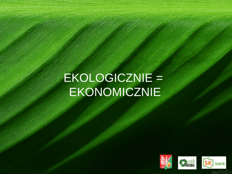 EKOLOGICZNIE = EKONOMICZNIE CHRONISZ = OSZCZĘDZASZ Rzeczy takie jak ciągłe zmiany klimatu, zanieczyszczenia powietrza, kwaśne deszcze, niszczenie warstwy ozonowej, globalne ocieplenie i wzrost ubóstwa, dają nam do zrozumienia, że nieprawidłowo korzystamy z darów przyrody. Wyobraź sobie, że pewnego dnia wychodzisz z domu i wszystko co widzisz to kłęby czarnego dymu i żadnych drzew. Wszystko co słyszysz to ryk samochodów, a nie śpiew ptaków. Nie czujesz zapachu kwiatów, tylko zapach benzyny. Czy takiego chcesz życia? Aby zmniejszyć ten problem, musisz postarać się chronić środowisko i być bardziej oszczędnym. Oto kilka pomysłów, jak zadbać o naturalne środowisko. ZAKRĘCASZ = OSZCZĘDZASZ • Jeden nieszczelny, lekko kapiący kran powoduje, że w ciągu doby wycieka około 36 litrów wody, co daje nam ok. 1080 litrów wody miesięcznie i ok.13140 litrów rocznie. • Nieszczelna spłuczka w WC powoduje wyciek w ciągu dnia około 72 litrów wody, a rocznie – 26280 litrów wody. WYŁĄCZASZ = OSZCZĘDZASZ • W dzisiejszych czasach diody umieszczane są na wielu urządzeniach codziennego użytku. Niemal wszędzie możemy zauważyć świecące się lampki. Zużywają niepotrzebnie energię elektryczną za którą płacimy. Ponadto naukowcy udowodnili ich szkodliwe oddziaływanie na nasze zdrowie. Starajmy się wybierać urządzenia, posiadające ich jak najmniej i nie obciążające naszych domowych budżetów. ODKRĘCASZ = OSZCZĘDZASZ • Fundacje i firmy prowadzą akcje polegające na tym, że każdy z nas może zbierać plastikowe nakrętki, korki z butelek, z kartonów po mleku i innych opakowaniach, które następnie są wymieniane na sprzęt rehabilitacyjny dla niepełnosprawnych osób. • Nakrętki i korki - ważne aby były plastikowe - odkręcamy z butelek . Jak widać, nie wszyscy to czynią. • Firmy recyklingowe płacą od 50 do 70 groszy za kilogram. Kilogram to około 450 nakrętek. • Uzbierane nakrętki w Wołominie zamieniają się we wspaniałe zajęcia terapeutyczne. SEGREGUJESZ = OSZCZĘDZASZ • Każda butelka poddana recyklingowi pozwala zaoszczędzić energię potrzebną do świecenia 100 watowej żarówki przez 4 h. • Każdy z nas wyrzuca w ciągu roku około 56 opakowań szklanych, nadających się w pełni do ponownego wykorzystania . • Każde 100 kg papieru to średniej wielkości dwa drzewa, a jedno drzewo produkuje w ciągu roku tlen wystarczający dla 10 osób. POZYSKUJESZ = OSZCZĘDZASZ • Pozyskiwanie energii oparte o akumulatory ładowane przez panele solarne i turbiny wiatrowe to najprostszy sposób zastosowania odnawialnych źródeł energii i oszczędności w budżecie domowym i gminnym. EKOLOGICZNIE = EKONOMICZNIE = ZDROWO = OSZCZĘDNIE DZIĘKUJEMY ZA UWAGĘ Wykonały: Aleksandra Rogulska Martyna Spadarzewska klasa 3b Zielona Klasa Gimnazjum nr 1 w Wołominie opiekun Jolanta Mosak