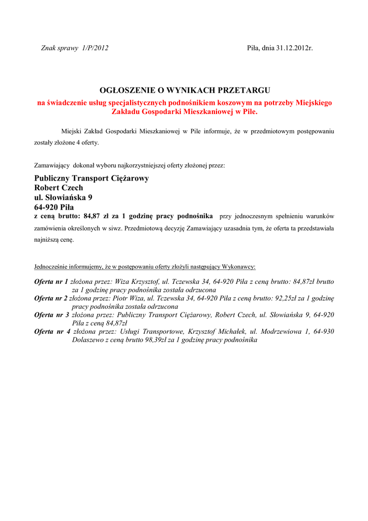 Znak sprawy 1/P/2012 Piła, dnia 31.12.2012r. OGŁOSZENIE O WYNIKACH PRZETARGU na świadczenie usług specjalistycznych podnośnikiem koszowym na potrzeby Miejskiego Zakładu Gospodarki Mieszkaniowej w Pile. Miejski Zakład Gospodarki Mieszkaniowej w Pile informuje, że w przedmiotowym postępowaniu zostały złożone 4 oferty. Zamawiający dokonał wyboru najkorzystniejszej oferty złożonej przez: Publiczny Transport Ciężarowy Robert Czech ul. Słowiańska 9 64-920 Piła z ceną brutto: 84,87 zł za 1 godzinę pracy podnośnika przy jednoczesnym spełnieniu warunków zamówienia określonych w siwz. Przedmiotową decyzję Zamawiający uzasadnia tym, że oferta ta przedstawiała najniższą cenę. Jednocześnie informujemy, że w postępowaniu oferty złożyli następujący Wykonawcy: Oferta nr 1 złożona przez: Wiza Krzysztof, ul. Tczewska 34, 64-920 Piła z ceną brutto: 84,87zł brutto za 1 godzinę pracy podnośnika została odrzucona Oferta nr 2 złożona przez: Piotr Wiza, ul. Tczewska 34, 64-920 Piła z ceną brutto: 92,25zł za 1 godzinę pracy podnośnika została odrzucona Oferta nr 3 złożona przez: Publiczny Transport Ciężarowy, Robert Czech, ul. Słowiańska 9, 64-920 Piła z ceną 84,87zł Oferta nr 4 złożona przez: Usługi Transportowe, Krzysztof Michałek, ul. Modrzewiowa 1, 64-930 Dolaszewo z ceną brutto 98,39zł za 1 godzinę pracy podnośnika