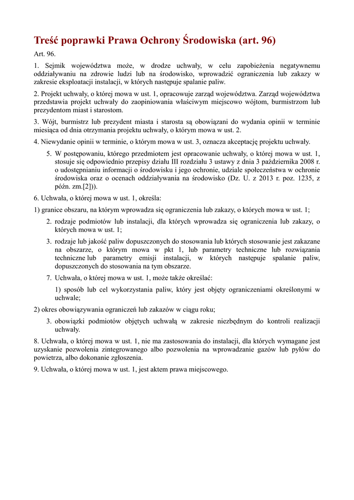 Treść poprawki Prawa Ochrony Środowiska (art. 96) Art. 96. 1. Sejmik województwa może, w drodze uchwały, w celu zapobieżenia negatywnemu oddziaływaniu na zdrowie ludzi lub na środowisko, wprowadzić ograniczenia lub zakazy w zakresie eksploatacji instalacji, w których następuje spalanie paliw. 2. Projekt uchwały, o której mowa w ust. 1, opracowuje zarząd województwa. Zarząd województwa przedstawia projekt uchwały do zaopiniowania właściwym miejscowo wójtom, burmistrzom lub prezydentom miast i starostom. 3. Wójt, burmistrz lub prezydent miasta i starosta są obowiązani do wydania opinii w terminie miesiąca od dnia otrzymania projektu uchwały, o którym mowa w ust. 2. 4. Niewydanie opinii w terminie, o którym mowa w ust. 3, oznacza akceptację projektu uchwały. 5. W postępowaniu, którego przedmiotem jest opracowanie uchwały, o której mowa w ust. 1, stosuje się odpowiednio przepisy działu III rozdziału 3 ustawy z dnia 3 października 2008 r. o udostępnianiu informacji o środowisku i jego ochronie, udziale społeczeństwa w ochronie środowiska oraz o ocenach oddziaływania na środowisko (Dz. U. z 2013 r. poz. 1235, z późn. zm.[2])). 6. Uchwała, o której mowa w ust. 1, określa: 1) granice obszaru, na którym wprowadza się ograniczenia lub zakazy, o których mowa w ust. 1; 2. rodzaje podmiotów lub instalacji, dla których wprowadza się ograniczenia lub zakazy, o których mowa w ust. 1; 3. rodzaje lub jakość paliw dopuszczonych do stosowania lub których stosowanie jest zakazane na obszarze, o którym mowa w pkt 1, lub parametry techniczne lub rozwiązania techniczne lub parametry emisji instalacji, w których następuje spalanie paliw, dopuszczonych do stosowania na tym obszarze. 7. Uchwała, o której mowa w ust. 1, może także określać: 1) sposób lub cel wykorzystania paliw, który jest objęty ograniczeniami określonymi w uchwale; 2) okres obowiązywania ograniczeń lub zakazów w ciągu roku; 3. obowiązki podmiotów objętych uchwałą w zakresie niezbędnym do kontroli realizacji uchwały. 8. Uchwała, o której mowa w ust. 1, nie ma zastosowania do instalacji, dla których wymagane jest uzyskanie pozwolenia zintegrowanego albo pozwolenia na wprowadzanie gazów lub pyłów do powietrza, albo dokonanie zgłoszenia. 9. Uchwała, o której mowa w ust. 1, jest aktem prawa miejscowego.