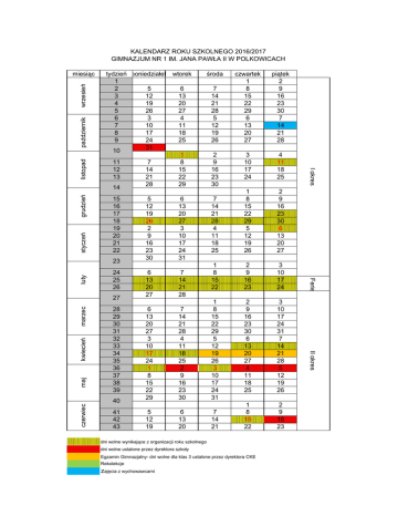 KALENDARZ ROKU SZKOLNEGO 2016/2017 GIMNAZJUM NR 1 IM. JANA PAWŁA II W POLKOWICACH grudzień styczeń tydzień poniedziałek wtorek 1 2 5 6 3 12 13 4 19 20 5 26 27 6 3 4 7 10 11 8 17 18 9 24 25 31 10 1 11 7 8 12 14 15 21 22 13 28 29 14 15 16 17 18 19 20 21 22 24 25 26 maj czerwiec 28 29 30 31 32 33 34 35 36 37 38 39 40 41 42 43 piątek 2 9 16 23 30 7 14 21 28 3 10 17 24 4 11 18 25 7 14 21 28 4 11 18 25 1 8 15 22 29 5 12 19 26 2 9 16 23 30 6 13 20 27 1 8 15 22 2 9 16 23 3 10 17 24 2 9 16 23 30 6 13 20 27 4 11 18 25 3 10 17 24 31 7 14 21 28 5 12 19 26 1 8 15 22 2 9 16 23 7 14 21 28 5 12 19 26 2 9 16 23 30 5 12 19 26 2 9 16 23 30 6 13 20 27 3 10 17 24 31 6 13 20 27 7 14 21 28 6 13 20 27 3 10 17 24 1 8 15 22 29 7 14 21 28 4 11 18 25 2 9 16 23 30 1 8 15 22 29 5 12 19 26 3 10 17 24 31 5 12 19 6 13 20 7 14 21 dni wolne wynikające z organizacji roku szkolnego dni wolne ustalone przez dyrektora szkoły Egzamin Gimnazjalny- dni wolne dla klas 3 ustalone przez dyrektora CKE Rekolekcje zajęcia z wychowawcami II okres kwiecień marzec 27 czwartek 1 8 15 22 29 6 13 20 27 Ferie luty 23 środa I okres listopad październik wrzesień miesiąc
