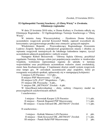 Zwoleń, 25 kwietnia 2010 r. 52 Ogólnopolski Turniej Szachowy „O Złotą Wieżę” w Zwoleniu. Eliminacje regionalne W dniu 25 kwietnia 2010 roku, w Domu Kultury w Zwoleniu odbyły się Eliminacje Regionalne - 52 Ogólnopolskiego Turnieju Szachowego o “Złotą Wieżę”. W imieniu Anny Wieczerzyńskiej – Dyrektora Domu Kultury, uczestników rozgrywek powitał Krzysztof Małek, zaprosił wszystkich do korzystania z przygotowanego posiłku oraz zimnych i gorących napojów. Włodzimierz Bojarski – Przewodniczący Regionalnego Zrzeszenia Ludowe Zespoły Sportowe, podziękował gospodarzom miasta i obiektu za wpisanie rozgrywek turniejowych do lokalnego kalendarza imprez, życzył uczestnikom udanych pojedynków i miłych wrażeń. Następnie Robert Brzozowski - Główny Sędzia Główny, przybliżył regulamin Turnieju, którego celem jest popularyzacja szachów w środowisku wiejskim, wyłonienie reprezentacji regionu do udziału w turnieju wojewódzkim oraz przybliżenie uczestnikom walorów ziemi zwoleńskiej, ziemi Jana Kochanowskiego. Z kapitanami drużyn ustalił system rozgrywek oraz tempo gry. W zawodach uczestniczyło pięć zespołów, które po rozegraniu wszystkich spotkań, uplasowały się w następującej kolejności: I miejsce LZS Parznice – 13,5 pkt., II miejsce PSP Mazowszany – 7,5 pkt., III miejsce LZS „PAT” Mogielnica – 7 pkt., IV miejsce DK Przysucha – 6 pkt., V miejsce DK „HETMAN” Zwoleń – 6 pkt. W klasyfikacji indywidualnej - złoty, srebrny i brązowy medal na poszczególnych szachownicach zdobyli: I szachownica – I miejsce – Poswniak Kacper LZS Parznice II miejsce – Paterek Bogumił PSP Mazowszany III miejsce – Ciucias Edward DK „HETMAN” Zwoleń 3 ½ pkt. 3 ½ pkt. 1 ½ pkt. II szachownica – I miejsce – Kubiak Mateusz LZS Parznice II miejsce – Sitek Krzysztof DK „HETMAN” Zwoleń III miejsce – Panek Rafał PSP Mazowszany 4 pkt. 2 ½ pkt. 2 pkt. III szachownica – I miejsce – Sadowiski Grzegorz LSZ „PAT” Mogielnica II miejsce – Sygnowski Adam DK Przysucha III miejsce – Pyszczek Maciej LZS Parznice 3 ½ pkt. 3 ½ pkt. 2 pkt. IV szachownica – I miejsce – Posuniak Weronika LZS Parznice II miejsce – Rutkowska Karolina LZS „PAT” Mogielnica III miejsce – Wesołowska Marta PSP Mazowszany 4 pkt. 3 pkt. 2 pkt. Puchary, medale, statuetki dla zwycięzców oraz dyplomy, w imieniu fundatorów i jednocześnie organizatorów - Urzędu Marszałkowskiego Województwa Mazowieckiego, Mazowieckiego i Regionalnego Zrzeszenia Ludowe Zespoły Sportowe, Starosty Zwoleńskiego i Radomskiego, Burmistrza Zwolenia, Domu Kultury w Zwoleniu oraz urzędów miast i gmin regionu radomskiego, wręczali: Henryk Hołuj – członek Zarządu Powiatu Zwoleńskiego, Włodzimierz Bojarski, Robert Brzozowski, Alfred Świątek i Wacław Kuś. Pan Kuś przekazał uczestnikom lokalne czasopismo – Głos Zwoleński. Nagrody dla medalistów oraz dla zespołów ufundowali: Starosta Radomski - Tadeusz Osiński oraz Starosta Zwoleński – Jerzy Koziński. Uczestnicy otrzymali posiłek regeneracyjny a także w czasie całego Turnieju: ciastka, paluszki, słodycze oraz napoje zimne i gorące. Rywalizacja przebiegała w miłej atmosferze i ciekawej scenografii, o którą zadbali gospodarze Turnieju.