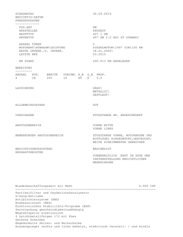 SCHADENTAG BESICHTIG-DATUM FAHRZEUGDATEN ------------FZG.ART HERSTELLER HAUPTTYP UNTERTYP 30.09.2016 PW PEUGEOT 407 I SW 407 SW 2.0 HDI ST DYNAMIC ANZAHL TÜREN MOTORART\HUBRAUM\LEISTUNG ERSTE INVERK./2. INVERK. LETZTE MFK 5 DIESELMOTOR\1997 CCM\100 KW 18.01.2005\ 03.2015 KM STAND 200.013 KM ABGELESEN BEREIFUNG --------ANZAHL POS. 4 VH BREITE 205 DURCHM. H_B 16 60 G_B H PROF. 5.0 LACKIERUNG GRAU\ METALLIC\ GEPFLEGT\ ALLGEMEINZUSTAND GUT VORSCHADEN STOSSTANGE HR. ANGESCHEUERT ANSTOSSBEREICH VORNE MITTE VORNE LINKS BEMERKUNGEN ANSTOSSBEREICH STOSSTANGE VORNE, MOTORHAUBE UND KOTFLÜGEL EINGEDRÜCKT,GESTAUCHT, BEIDE SCHEINWERFER GEBROCHEN BESICHTIGUNGSZUSTAND REPARATURKOSTEN BESCHÄDIGT VORBEHÄLTLICH ERST IM ZUGE DER INSTANDSTELLUNG ERSICHTLICHER MEHRSCHADEN Wiederbeschaffungswert mit MwSt 4.000 CHF ---------------------------------------------------------------------------Partikelfilter und Oxydationskatalysator 6-Gang-Getriebe Antiblockiersystem (ABS) Bremsassistent (BAS) Elektronisches Stabilitäts-Programm (ESP) Servolenkung geschwindigkeitsabhängig Wegfahrsperre elektronisch 4 Leichtmetallfelgen 17J mit Pneu Getönte Scheiben Abgedunkelte Seiten- und Heckscheibe Aussenspiegel rechts und links beheizt, elektrisch verstell- / und einkla Panorama-Glasdach Stosstangen in Wagenfarbe Nebelscheinwerfer Nebelschlussleuchte Drittes Bremslicht Leuchtweitenregulierung elektrisch Automatisches Einschalten der Abblendlichter Abblendlichtausschaltverzögerung ’Follow me home’ Heckscheiben-Wisch-/Waschanlage Scheibenwischer vorne mit Intervall Regensensor für Scheibenwischer vorne Zentralverriegelung mit Fernbedienung Kopfstützen hinten Vordersitze höhenverstellbar Rücksitzlehne geteilt abklappbar ISOFIX Kindersitzvorrichtung Kindersitzvorrichtung ISOFIX Beifahrerseite Stoff-Ausstattung Lederlenkrad Lenkrad längs- und höhenverstellbar Airbag Fahrer und Beifahrer Seitenairbags Knie-Airbag für Fahrer Window-Kopfairbags Airbag Beifahrer deaktivierbar Aktive Fuss-Stütze Sonnenschutzrollo elektrisch für Panoramaglasdach Mittelarmlehne hinten Mittelarmlehne vorne Beleuchtetes und abschliessbares Handschuhfach Beide Make up-Spiegel beleuchtet Durchladeöffnung im Kofferraum Steckdose Steckdose im Kofferraum Gepäcksicherungsnetz(e) im Laderaum Gurtstraffer vorne 3-Punkt-Sicherheitsgurte auf allen Plätzen Klimatisierungsautomatik Aktivkohlefilter (Geruchsfilter) Tempomat Bordcomputer Aussentemperaturanzeige Digital Uhr Oelstandsanzeige Drehzahlmesser Wassertemperaturanzeige Tageskilometerzähler Wartungsintervall-Anzeige Reifendruck-Kontrollanzeige Lichtwarnsummer Elektrische Fensterheber vorne + hinten Aufklappbare Heckscheibe Radiovorbereitung, Antenne, Entstörung und 6 LS Radio/CD mit Lenkradfernbedienung Metallic-Lackierung Park Distance Control hinten ---------------------------------------------------------------------------Wiederbeschaffungswert mit MwSt 4.000 CHF F A H R Z E U G B E W E R T U N G --------------------------------- 600.600.- E R G E B N I S: DIE AUF DEN 30.09.2016 BEZOGENE BEWERTUNG DES VORSTEHEND BESCHRIEBENEN FAHRZEUGES HAT UNTER BERÜCKSICHTIGUNG DER ÖRTLICHEN MARKTLAGE UND ALLER SONSTIGEN WERTBEEINFLUSSENDEN FAKTOREN ZU FOLGENDEM ERGEBNIS GEFÜHRT: Wiederbeschaffungswert mit MwSt 4.000 CHF