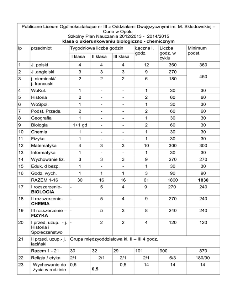 Publiczne Liceum Ogólnokształcące nr III z Oddziałami Dwujęzycznymi im. M. Skłodowskiej – Curie w Opolu Szkolny Plan Nauczania 2012/2013 - 2014/2015 klasa o ukierunkowaniu biologiczno - chemicznym lp przedmiot Tygodniowa liczba godzin I klasa II klasa III klasa Łączna l. godz. Liczba godz. w cyklu Minimum podst. 360 1 J. polski 4 4 4 12 360 2 J .angielski 3 3 3 9 270 3 j. niemiecki/ j. francuski 2 2 2 6 180 450 4 WoKul. 1 - - 1 30 30 5 Historia 2 - - 2 60 60 6 WoSpoł. 1 - - 1 30 30 7 Podst. Przeds. 2 - - 2 60 60 8 Geografia 1 - - 1 30 30 9 Biologia 1+1 gd - - 2 60 30 10 Chemia 1 - - 1 30 30 11 Fizyka 1 - - 1 30 30 12 Matematyka 4 3 3 10 300 300 13 Informatyka 1 - - 1 30 30 14 Wychowanie fiz. 3 3 3 9 270 270 15 Eduk. d bezp. 1 - - 1 30 30 16 Godz. wych. 1 1 1 3 90 90 RAZEM 1-16 30 16 16 61 1860 1830 17 I rozszerzenieBIOLOGIA - 5 4 9 270 240 18 II rozszerzenieCHEMIA - 5 4 9 270 240 19 III rozszerzenie – FIZYKA 5 3 8 240 240 20 I przed, uzup. - j. Historia i Społeczeństwo 2 2 4 120 120 21 II przed. uzup.- j. Grupa międzyoddziałowa kl. II – III 4 godz. łaciński 22 23 Razem 1 - 21 30 Religia / etyka 2/1 Wychowanie do 0,5 życia w rodzinie 32 29 2/1 0,5 101 900 870 2/1 2/1 6/3 180/90 0,5 14 14 14