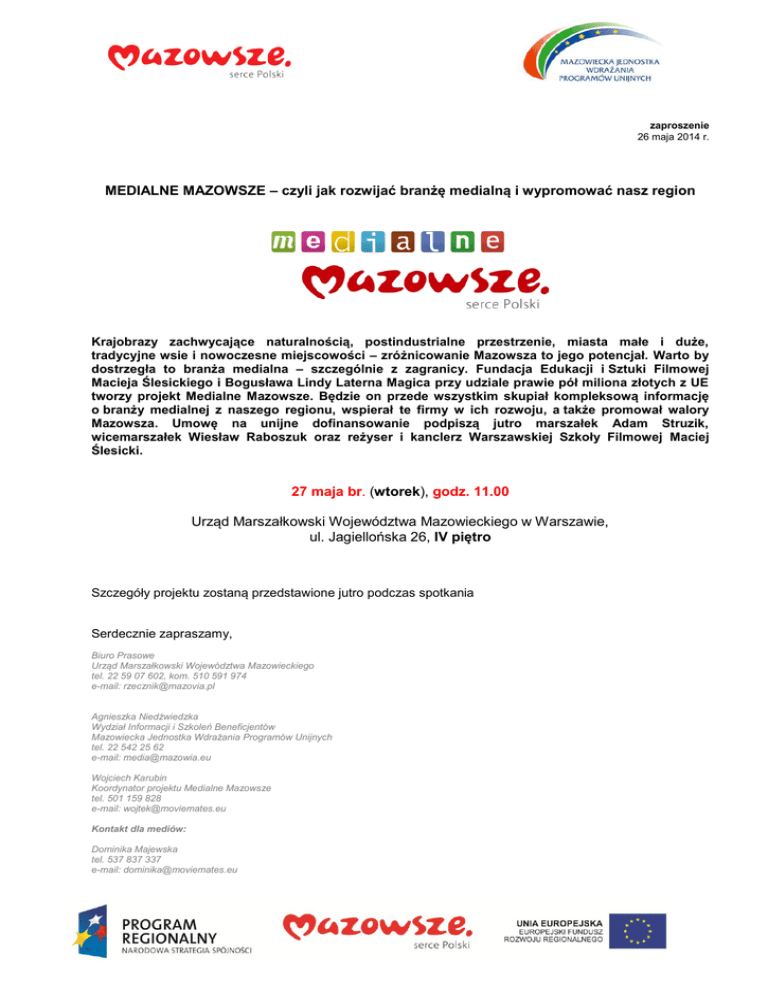 zaproszenie 26 maja 2014 r. MEDIALNE MAZOWSZE – czyli jak rozwijać branżę medialną i wypromować nasz region Krajobrazy zachwycające naturalnością, postindustrialne przestrzenie, miasta małe i duże, tradycyjne wsie i nowoczesne miejscowości – zróżnicowanie Mazowsza to jego potencjał. Warto by dostrzegła to branża medialna – szczególnie z zagranicy. Fundacja Edukacji i Sztuki Filmowej Macieja Ślesickiego i Bogusława Lindy Laterna Magica przy udziale prawie pół miliona złotych z UE tworzy projekt Medialne Mazowsze. Będzie on przede wszystkim skupiał kompleksową informację o branży medialnej z naszego regionu, wspierał te firmy w ich rozwoju, a także promował walory Mazowsza. Umowę na unijne dofinansowanie podpiszą jutro marszałek Adam Struzik, wicemarszałek Wiesław Raboszuk oraz reżyser i kanclerz Warszawskiej Szkoły Filmowej Maciej Ślesicki. 27 maja br. (wtorek), godz. 11.00 Urząd Marszałkowski Województwa Mazowieckiego w Warszawie, ul. Jagiellońska 26, IV piętro Szczegóły projektu zostaną przedstawione jutro podczas spotkania Serdecznie zapraszamy, Biuro Prasowe Urząd Marszałkowski Województwa Mazowieckiego tel. 22 59 07 602, kom. 510 591 974 e-mail: [email protected] Agnieszka Niedźwiedzka Wydział Informacji i Szkoleń Beneficjentów Mazowiecka Jednostka Wdrażania Programów Unijnych tel. 22 542 25 62 e-mail: [email protected] Wojciech Karubin Koordynator projektu Medialne Mazowsze tel. 501 159 828 e-mail: [email protected] Kontakt dla mediów: Dominika Majewska tel. 537 837 337 e-mail: [email protected]