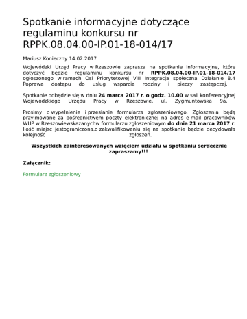Spotkanie informacyjne dotyczące regulaminu konkursu nr RPPK.08.04.00-IP.01-18-014/17 Mariusz Konieczny 14.02.2017 Wojewódzki Urząd Pracy w Rzeszowie zaprasza na spotkanie informacyjne, które dotyczyć będzie regulaminu konkursu nr RPPK.08.04.00-IP.01-18-014/17 ogłoszonego w ramach Osi Priorytetowej VIII Integracja społeczna Działanie 8.4 Poprawa dostępu do usług wsparcia rodziny i pieczy zastępczej. Spotkanie odbędzie się w dniu 24 marca 2017 r. o godz. 10.00 w sali konferencyjnej Wojewódzkiego Urzędu Pracy w Rzeszowie, ul. Zygmuntowska 9a. Prosimy o wypełnienie i przesłanie formularza zgłoszeniowego. Zgłoszenia będą przyjmowane za pośrednictwem poczty elektronicznej na adres e-mail pracowników WUP w Rzeszowiewskazanychw formularzu zgłoszeniowym do dnia 21 marca 2017 r. Ilość miejsc jestograniczona,o zakwalifikowaniu się na spotkanie będzie decydowała kolejność zgłoszeń. Wszystkich zainteresowanych wzięciem udziału w spotkaniu serdecznie zapraszamy!!! Załącznik: Formularz zgłoszeniowy