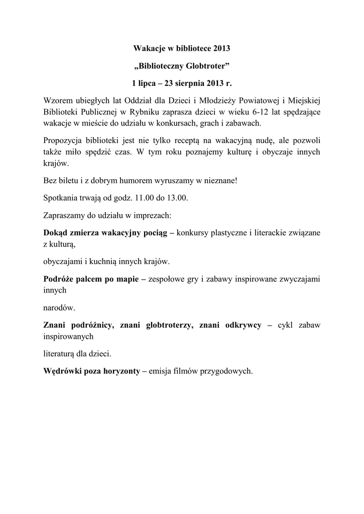 Wakacje w bibliotece 2013 „Biblioteczny Globtroter” 1 lipca – 23 sierpnia 2013 r. Wzorem ubiegłych lat Oddział dla Dzieci i Młodzieży Powiatowej i Miejskiej Biblioteki Publicznej w Rybniku zaprasza dzieci w wieku 6-12 lat spędzające wakacje w mieście do udziału w konkursach, grach i zabawach. Propozycja biblioteki jest nie tylko receptą na wakacyjną nudę, ale pozwoli także miło spędzić czas. W tym roku poznajemy kulturę i obyczaje innych krajów. Bez biletu i z dobrym humorem wyruszamy w nieznane! Spotkania trwają od godz. 11.00 do 13.00. Zapraszamy do udziału w imprezach: Dokąd zmierza wakacyjny pociąg – konkursy plastyczne i literackie związane z kulturą, obyczajami i kuchnią innych krajów. Podróże palcem po mapie – zespołowe gry i zabawy inspirowane zwyczajami innych narodów. Znani podróżnicy, znani globtroterzy, znani odkrywcy – cykl zabaw inspirowanych literaturą dla dzieci. Wędrówki poza horyzonty – emisja filmów przygodowych.