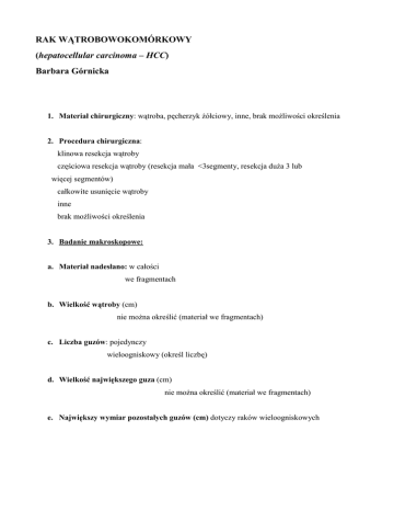 RAK WĄTROBOWOKOMÓRKOWY (hepatocellular carcinoma – HCC) Barbara Górnicka 1. Materiał chirurgiczny: wątroba, pęcherzyk Ŝółciowy, inne, brak moŜliwości określenia 2. Procedura chirurgiczna: klinowa resekcja wątroby częściowa resekcja wątroby (resekcja mała <3segmenty, resekcja duŜa 3 lub więcej segmentów) całkowite usunięcie wątroby inne brak moŜliwości określenia 3. Badanie makroskopowe: a. Materiał nadesłano: w całości we fragmentach b. Wielkość wątroby (cm) nie moŜna określić (materiał we fragmentach) c. Liczba guzów: pojedynczy wieloogniskowy (określ liczbę) d. Wielkość największego guza (cm) nie moŜna określić (materiał we fragmentach) e. Największy wymiar pozostałych guzów (cm) dotyczy raków wieloogniskowych f. Opis guza (wybierz wszystkie pasujące): wylewy krwi martwica naciekanie torebki wątroby inne (określ) g. Zasięg guza: guz ograniczony do wątroby guz wrasta do głównych odgałęzień Ŝyły wrotnej guz wrasta do jednej lub więcej Ŝył wątrobowych guz nacieka otrzewną trzewną guz bezpośrednio nacieka pęcherzyk Ŝółciowy guz bezpośrednio nacieka struktury lub narządy sąsiednie (określ które) h. Marginesy chirurgiczne: bez widocznego guza, odległość od najbliŜszej linii cięci (cm) guz widoczny w linii/liniach cięcia chirurgicznego (określ) brak moŜliwości określenia i. Węzły chłonne: brak obecne (określ liczbę) j. Wątroba poza guzem: bez zmian zmieniona (określ) nieidentyfikowalna 4. Badanie mikroskopowe: a. Typ histologiczny wg WHO 2010: rak wątrobowokomórkowy (hepatocellular carcinoma) kod ICD-10 8170/3 rak wątrobowokomórkowy wariant włóknisto-blaszkowy (hepatocellular carcinoma, fibrolamellar variant) rak niezróŜnicowany (undifferentiated carcinoma) 8171/3 8020/3 inny (other) b. Stopień dojrzałości histologicznej G (wg Edmondsona-Steinera)- załącznik 1 c. Zasięg guza: guz ograniczony do wątroby guz nacieka otrzewną trzewną guz bezpośrednio nacieka pęcherzyk Ŝółciowy guz bezpośrednio nacieka struktury lub narządy sąsiednie (określ które) d. Wrastanie do duŜych Ŝył (V): brak obecne niezdefiniowane e. Wrastanie do małych naczyń (L): brak obecne f. Węzły chłonne: brak obecne (określ liczbę) zajęte (określ liczbę) g. Naciekanie gałązek nerwowych: brak obecne niezdefiniowane h. Martwica w obrębie guza: brak obecna (% objętości guza) i. Marginesy chirurgiczne: bez widocznego guza, odległość od najbliŜszej linii cięcia (cm) guz widoczny w linii/liniach cięcia chirurgicznego (określ) brak moŜliwości określenia j. Panel histochemiczny przydatny do diagnostyki róŜnicowej: Gomori, Masson trichrom, mucykarmin k. Panel immunohistochemiczny przydatny do diagnostyki róŜnicowej: Hep-Par1, CK7, CK19, CD34 l. Stopień zaawansowania patologicznego pTNM: określ (załącznik 2) m. Stopień zaawansowania S (staging): określ (załącznik 3) n. Dodatkowe zmiany patologiczne w obrębie wątroby: Stopień włóknienia wątroby F1 - Marskość/nasilone włóknienie 5-6w/g skali Ishak’a F0 – włóknienie 0-4 wg skali Ishak’a Zmiany dysplastyczne dysplazja drobnokomórkowa dysplazja wielkokomórkowa Guzki dysplastyczne LG HG Stłuszczenie hepatocytów (%) Złogi Ŝelaza: obecne, nieoobecne Przewlekłe zapalenie wątroby (określ etiologię) Inne 5. Dane kliniczne: wirusowe zapalenie wątroby (określ typ) alkoholowa choroba wątroby otyłość dziedziczna hemochromatoza inne brak danych klinicznych Załącznik nr 1 Stopień dojrzałości histologicznej (Grade) najczęściej koreluje z wielkością guza i obecnością przerzutów. Znaczenie prognostyczne: Niski grading (GI, GII) wydłuŜa okres wolny od nawrotu choroby, jednak nie ma wpływu na całkowity okres przeŜycia. Stopień I Zarezerwowany dla raków wątrobowkomórkowych, w których róŜnica pomiędzy komórkami guza i hiperplastycznymi hepatocytami jest na tyle niewielka, Ŝe rozpoznanie raka opiera się na stwierdzeniu bardziej agresywnego typu wzrostu w innych częściach guza. PoniewaŜ stopień dojrzałosci histologicznej opiera się na najwyŜszym stwierdzonym w masie guza, stopień I (G I) stwierdzany jest wyjątkowo rzadko, o ile w ogóle. Stopień II Komórki guza wykazują znaczne podobieństwo do prawidłowych hepatocytów. Jądra komórkowe są większe i bardziej hiperchromatyczne niŜ prawidłowych hepatocytów. Posiadają obfitą, kwasochłonną cytoplazmę. Granice pojedynczych komórek są wyraźne. Często występują róŜnej wielkości gronka. Światła gronek są często wypełnione Ŝółcią lub materiałem białkowym. Stopień III Jądra są większe I bardziej hiperchromatyczne niŜ w stopniu II. Jądra zajmują większą część komórki (wysoki stosunek jądro/cytoplazma). Cytoplazma jest ziarnista I kwasochłonna, jednak słabiej niŜ w stopniu II. Gronka występują rzadziej i ich światła nie tak często wypełnione są Ŝółcią i masami białkowymi. Częściej niŜ w stopniu II widoczne jest wnikanie pojedynczych komórek do światła kanałów naczyniowych. Stopień IV Jądra są silnie hiperchromatyczne oraz zajmują znaczną część komórki. Komórki guza posiadają róŜną ilość cytoplazmy, często bardzo niewielką. Cytoplazma zawiera mniej ziarnistości. Guz ma rdzeniasty typ wzrostu, beleczki są trudne do znalezienia, a komórki guza wydają się być umiejscowione luźno, bez przylegania do kanałów naczyniowych. MoŜna dostrzec jedynie nieliczne gronka. W niektórych guzach widoczne są komórki wrzecionowate. Drobne, nadęte komórki przypominające drobnokomórkowego raka płuca są czasami widoczne w guzach stopnia IV. Załącznik nr 2 Deskryptor "m" wskazuje na obecność zmiany wieloogniskowej w jednym miejscu anatomicznym i jest raportowany jako pT(m)NM. Deskryptor "y" wskazuje te przypadki, w których klasyfikacja pTNM była wykonana po wstępnej róŜnorodnej terapii (np. neoadjuwantowej chemioterapii, radioterapii, lub razem chemio- i
