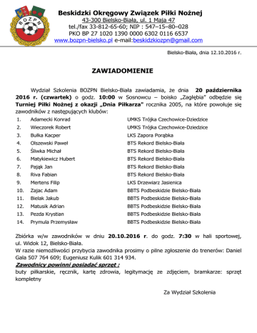Beskidzki Okręgowy Związek Piłki Nożnej 43-300 Bielsko-Biała, ul. 1 Maja 47 tel./fax 33-812-65-60; NIP : 547–15–80–028 PKO BP 27 1020 1390 0000 6302 0116 6537 www.bozpn-bielsko.pl e-mail:[email protected] Bielsko-Biała, dnia 12.10.2016 r. ZAWIADOMIENIE Wydział Szkolenia BOZPN Bielsko-Biała zawiadamia, że dnia 20 października 2016 r. (czwartek) o godz. 10:00 w Sosnowcu – boisko „Zagłębia” odbędzie się Turniej Piłki Nożnej z okazji „Dnia Piłkarza" rocznika 2005, na które powołuje się zawodników z następujących klubów: 1. Adamecki Konrad UMKS Trójka Czechowice-Dziedzice 2. Wieczorek Robert UMKS Trójka Czechowice-Dziedzice 3. Bułka Kacper LKS Zapora Porąbka 4. Olszewski Paweł BTS Rekord Bielsko-Biała 5. Śliwka Michał BTS Rekord Bielsko-Biała 6. Matykiewicz Hubert BTS Rekord Bielsko-Biała 7. Pająk Jan BTS Rekord Bielsko-Biała 8. Riva Fabian BTS Rekord Bielsko-Biała 9. Mertens Filip LKS Drzewiarz Jasienica 10. Zajac Adam BBTS Podbeskidzie Bielsko-Biała 11. Bielak Jakub BBTS Podbeskidzie Bielsko-Biała 12. Matusik Adrian BBTS Podbeskidzie Bielsko-Biała 13. Pezda Krystian BBTS Podbeskidzie Bielsko-Biała 14. Prymula Przemysław BBTS Podbeskidzie Bielsko-Biała Zbiórka w/w zawodników w dniu 20.10.2016 r. do godz. 7:30 w hali sportowej, ul. Widok 12, Bielsko-Biała. W razie niemożliwości przybycia zawodnika prosimy o pilne zgłoszenie do trenerów: Daniel Gala 507 764 609; Eugeniusz Kulik 601 314 934. Zawodnicy powinni posiadać sprzęt : buty piłkarskie, ręcznik, kartę zdrowia, legitymację ze zdjęciem, bramkarze: sprzęt kompletny Za Wydział Szkolenia