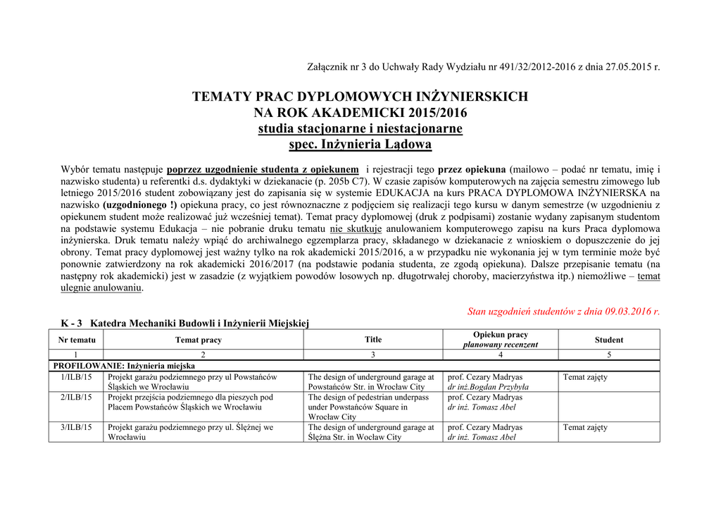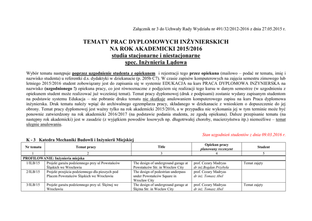 Załącznik nr 3 do Uchwały Rady Wydziału nr 491/32/2012-2016 z dnia 27.05.2015 r. TEMATY PRAC DYPLOMOWYCH INŻYNIERSKICH NA ROK AKADEMICKI 2015/2016 studia stacjonarne i niestacjonarne spec. Inżynieria Lądowa Wybór tematu następuje poprzez uzgodnienie studenta z opiekunem i rejestracji tego przez opiekuna (mailowo – podać nr tematu, imię i nazwisko studenta) u referentki d.s. dydaktyki w dziekanacie (p. 205b C7). W czasie zapisów komputerowych na zajęcia semestru zimowego lub letniego 2015/2016 student zobowiązany jest do zapisania się w systemie EDUKACJA na kurs PRACA DYPLOMOWA INŻYNIERSKA na nazwisko (uzgodnionego !) opiekuna pracy, co jest równoznaczne z podjęciem się realizacji tego kursu w danym semestrze (w uzgodnieniu z opiekunem student może realizować już wcześniej temat). Temat pracy dyplomowej (druk z podpisami) zostanie wydany zapisanym studentom na podstawie systemu Edukacja – nie pobranie druku tematu nie skutkuje anulowaniem komputerowego zapisu na kurs Praca dyplomowa inżynierska. Druk tematu należy wpiąć do archiwalnego egzemplarza pracy, składanego w dziekanacie z wnioskiem o dopuszczenie do jej obrony. Temat pracy dyplomowej jest ważny tylko na rok akademicki 2015/2016, a w przypadku nie wykonania jej w tym terminie może być ponownie zatwierdzony na rok akademicki 2016/2017 (na podstawie podania studenta, ze zgodą opiekuna). Dalsze przepisanie tematu (na następny rok akademicki) jest w zasadzie (z wyjątkiem powodów losowych np. długotrwałej choroby, macierzyństwa itp.) niemożliwe – temat ulegnie anulowaniu. Stan uzgodnień studentów z dnia 09.03.2016 r. K - 3 Katedra Mechaniki Budowli i Inżynierii Miejskiej Nr tematu Temat pracy 1 2 PROFILOWANIE: Inżynieria miejska 1/ILB/15 Projekt garażu podziemnego przy ul Powstańców Śląskich we Wrocławiu 2/ILB/15 Projekt przejścia podziemnego dla pieszych pod Placem Powstańców Śląskich we Wrocławiu 3/ILB/15 Projekt garażu podziemnego przy ul. Ślężnej we Wrocławiu Title 3 The design of underground garage at Powstańców Str. in Wrocław City The design of pedestrian underpass under Powstańców Square in Wrocław City The design of underground garage at Ślężna Str. in Wocław City Opiekun pracy planowany recenzent 4 Student 5 prof. Cezary Madryas dr inż.Bogdan Przybyła prof. Cezary Madryas dr inż. Tomasz Abel Temat zajęty prof. Cezary Madryas dr inż. Tomasz Abel Temat zajęty 4/ILB/15 Projekt garażu podziemnego przy ul. Komandorskiej we Wrocławiu Projekt przejścia podziemnego dla pieszych pod ul. Swobodną we Wrocławiu prof. Cezary Madryas dr inż.Bogdan Przybyła prof. Cezary Madryas dr inż. Andrzej Kolonko Temat zajęty prof. Cezary Madryas dr inż. Andrzej Kolonko dr inż. Bogdan Przybyła dr inż. Arkadiusz Szot Temat zajęty 8/ILB/15 Projekt kolektora kanalizacyjnego zlokalizowanego w ulicy Bierutowskiej we Wrocławiu The design of underground garage at Komandorska Str. in Wrocław City The design of pedestrian underpass under Swobodna Str. in Wrocław City The design of pedestrian underpass under Kamienna Str. in Wocław City Design of single-storey underground car park on Na Grobli Str. in Wrocław Design of trunk sewer allocated under Bierutowska Str. in Wroclaw 9/ILB/15 Projekt kolektora kanalizacyjnego zlokalizowanego w ulicy Francuskiej we Wrocławiu Design of trunk sewer allocated under Francuska Str. in Wroclaw dr inż. Bogdan Przybyła dr inż. Arkadiusz Szot 10/ILB/15 Projekt jednokondygnacyjnego garażu podziemnego w rejonie Centrum Handlowego Park Bielany we Wrocławiu Design of single-storey underground car park localized in shopping center Park Bielany in Wroclaw dr inż. Bogdan Przybyła dr inż. Leszek Temat zajęty 11/ILB/15 Projekt przejścia podziemnego w rejonie skrzyżowania ulic Wybrzeże S. Wyspiańskiego i Plac Grunwaldzki we Wrocławiu dr inż. Bogdan Przybyła dr inż. Leszek Wysocki Temat zajęty 12/ILB/15 Projekt jednokondygnacyjnego garażu podziemnego w rejonie ul. Hoyene-Wrońskiego we Wrocławiu Design of underground pass in vicinity of streets intersection Wybrzeże S. Wyspiańskiego and Plac Grunwaldzki Str. in Wroclaw Design of single-storey underground car park localized in the vicinity of Hoyene-Wrońskiego in Wroclaw dr inż. Bogdan Przybyła dr inż. Leszek Wysocki Temat zajęty Projekt wielkogabarytowego przewodu kanalizacyjnego we Wrocławiu Design documentation for large-scale sewer in Wrocław dr inż. Arkadiusz Szot dr inż. Leszek Wysocki Temat zajęty 15/ILB/15 Projekt przejścia podziemnego pod skrzyżowaniem ul. Krakowskiej, Traugutta i Kościuszki we Wrocławiu Design documentation for underpass under the junction of ul. Krakowska, Kościuszki and Traugutta in Wrocław dr inż. Arkadiusz Szot dr inż. Leszek Wysocki Temat zajęty 16/ILB/15 17/ILB/15 Projekt przejścia podziemnego pod pl. Wróblewskiego Design documentation for underpass dr inż. Arkadiusz Szot Temat zajęty 5/ILB/15 6/ILB/15 7/ILB/15 13/ILB/15 14/ILB/15 Projekt przejścia podziemnego dla pieszych pod ul. Kamienną we Wrocławiu Projekt jednokondygnacyjnego garażu podziemnego zlokalizowanego przy ul. Na Grobli we Wrocławiu Temat zajęty Temat zajęty dr inż. Bogdan Przybyła dr inż. Arkadiusz Szot 18/ILB/15 we Wrocławiu Projekt garażu podziemnego zlokalizowanego przy ul. Wyszyńskiego we Wrocławiu 19/ILB/15 Projekt przejścia podziemnego pod skrzyżowaniem ulic Traugutta i Krakowskiej we Wrocławiu 20/ILB/15 21/ILB/15 Projekt przejścia podziemnego pod ul. Jana Pawła II w Jeleniej Górze Projekt przejścia podziemnego w wybranej lokalizacji 22/ILB/15 Projekt garażu podziemnego w wybranej lokalizacji 23/ILB/15 Projekt odcinka przewodu kanalizacyjnego z rur GRP realizowanego w technologii wykopowej 24/ILB/15 Projekt przejścia podziemnego pod przejazdem kolejowym obok Dworca Miasto w Wałbrzychu Projekt wielostanowiskowego garażu podziemnego przy ulicy Nowodworskiej we Wrocławiu 25/ILB/15 26/ILB/15 Projekt przejścia podziemnego na