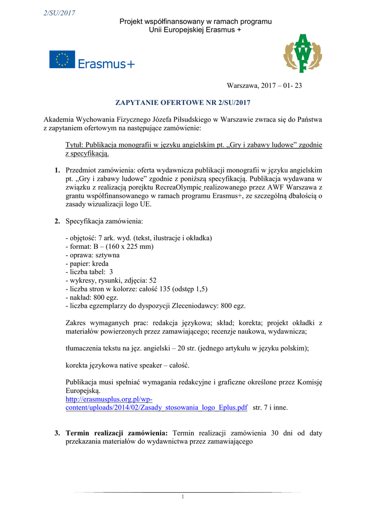 2/SU/2017 Projekt współfinansowany w ramach programu Unii Europejskiej Erasmus + Warszawa, 2017 – 01- 23 ZAPYTANIE OFERTOWE NR 2/SU/2017 Akademia Wychowania Fizycznego Józefa Piłsudskiego w Warszawie zwraca się do Państwa z zapytaniem ofertowym na następujące zamówienie: Tytuł: Publikacja monografii w języku angielskim pt. „Gry i zabawy ludowe” zgodnie z specyfikacją. 1. Przedmiot zamówienia: oferta wydawnicza publikacji monografii w języku angielskim pt. „Gry i zabawy ludowe” zgodnie z poniższą specyfikacją. Publikacja wydawana w związku z realizacją porejktu RecreaOlympic realizowanego przez AWF Warszawa z grantu współfinansowanego w ramach programu Erasmus+, ze szczególną dbałością o zasady wizualizacji logo UE. 2. Specyfikacja zamówienia: - objętość: 7 ark. wyd. (tekst, ilustracje i okładka) - format: B – (160 x 225 mm) - oprawa: sztywna - papier: kreda - liczba tabel: 3 - wykresy, rysunki, zdjęcia: 52 - liczba stron w kolorze: całość 135 (odstęp 1,5) - nakład: 800 egz. - liczba egzemplarzy do dyspozycji Zleceniodawcy: 800 egz. Zakres wymaganych prac: redakcja językowa; skład; korekta; projekt okładki z materiałów powierzonych przez zamawiającego; recenzje naukowa, wydawnicza; tłumaczenia tekstu na jęz. angielski – 20 str. (jednego artykułu w języku polskim); korekta językowa native speaker – całość. Publikacja musi spełniać wymagania redakcyjne i graficzne określone przez Komisję Europejską. http://erasmusplus.org.pl/wpcontent/uploads/2014/02/Zasady_stosowania_logo_Eplus.pdf str. 7 i inne. 3. Termin realizacji zamówienia: Termin realizacji zamówienia 30 dni od daty przekazania materiałów do wydawnictwa przez zamawiającego 1 2/SU/2017 Projekt współfinansowany w ramach programu Unii Europejskiej Erasmus + 4. Istotne warunki zamówienia: Płatność przelewem, 14 dni od wystawienia faktury WARUNKI UDZIAŁU W POSTĘPOWANIU Wykonawca składając ofertę, oświadcza, że: 1. posiada odpowiednią formę prawną, która obejmuje realizację przedmiotu zamówienia; 2. posiada odpowiednie kwalifikacje zawodowe, umiejętności oraz doświadczenie do wykonania przedmiotu zamówienia; 3. posiada udokumentowane doświadczenie w publikowaniu prac naukowych w językach obcych; 4. posiada odpowiednie zaplecze techniczne umożliwiające zrealizowanie usługi. Do oferty wykonawca dołączy: dokumenty potwierdzające doświadczenie w publikowaniu prac naukowych w języku angielskim Aktualny odpis z właściwego rejestru lub z centrali ewidencji i informacji o działalności gospodarczej, jeżeli odrębne przepisy wymagają wpisu do rejestru lub ewidencji wystawionego nie wcześniej niż 6 miesięcy przed upływem terminu składania ofert 5. Kryteria oceny ofert: Przy wyborze najkorzystniejszej oferty Zamawiający będzie się kierował następującymi kryteriami: - cena 80% - potwierdzone dokumentami doświadczenie w publikacji prac naukowych w języku angielskim – 20% CENA – 80% Ocena kryterium cena na postawie wzoru: cena oferowana minimalna brutto cena = ---------------------------------------------------- x 100 pkt x 80% cena badanej oferty brutto POTWIERDZONE dokumentami DOŚWIADCZENIE Potwierdzone dokumentami doświadczenie oferty wg wzoru: Liczba publikacji naukowych referencje = ---------------------------------------------------- x 100 pkt x 20% Oferta z największa liczbą publikacji naukowych 2 2/SU/2017 Projekt współfinansowany w ramach programu Unii Europejskiej Erasmus + *ZALICZKI - Nie przewiduje się udzielenia zaliczki na poczet wykonania zamówienia. *ZAMAWIAJĄCY MA PRAWO ODSTĄPIENIA OD ZAPYTANIA OFERTOWEGO NA KAŻDYM ETAPIE ZAPYTANIA BEZ PODANIA PRZYCZYNY. 6. Osoba wyznaczona do kontaktu z Wykonawcą: Aleksandra Bojarska, tel. 22 864-18-75 email: [email protected] Barbara Pendraszewska - Sołtys, tel. 883 249 888, e-mail: [email protected] 7. Sposób przygotowania oferty: Ofertę sporządzoną w języku polskim w formie pisemnej należy złożyć do dnia 3 lutego 2017 r. do godz. 09:00 w Samodzielnej Sekcji Zamówień Publicznych AWF Warszawa ul. Marymoncka 34 lub emailem: [email protected], Zamawiający w każdej chwili może anulować zapytanie. Wyniki wyboru oferty zostaną ogłoszone na stronie Zamawiającego www.awf.edu.pl 3 2/SU/2017 Projekt współfinansowany w ramach programu Unii Europejskiej Erasmus + OFERTA DO ZAPYTANIA OFERTOWEGO NR 2/SU/2017 Przedmiot zamówienia: : oferta wydawnicza publikacji w języku angielskim pt. „Gry i zabawy ludowe” zgodnie z poniższą specyfikacją. Publikacja wydawana w związku z realizacją porejktu RecreaOlympic realizowanego przez AWF Warszawa z grantu współfinansowanego w ramach programu Erasmus+, ze szczególną dbałością o zasady wizualizacji logo UE. Firma ........................................................................................................................................... adres ............................................................................................................................................ ............................................................................................................................................ telefon , fax e –mail ................................................................................................................... Wykonawca musi wycenić wszystkie pozycja oferty Lp. przedmiot zamówienia 1. 800 egz. zgodnych ze specyfikacją Wartość Netto Wartość Brutto Razem: Zapoznałem się z warunkami określonymi w zapytaniu ofertowym i nie wnoszę do nich zastrzeżeń. …………………........................................ podpis osoby uprawnionej 4