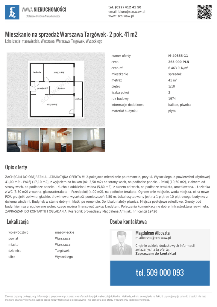 tel. (022) 412 41 50 email: [email protected] www: scn.waw.pl Mieszkanie na sprzedaż Warszawa Targówek - 2 pok. 41 m2 Lokalizacja: mazowieckie, Warszawa, Warszawa, Targówek, Wysockiego numer oferty M-40855-11 cena 265 000 PLN cena m 6 463 PLN/m2 mieszkanie sprzedaż, metraż 41 m2 piętro 1/10 liczba pokoi 2 rok budowy 1974 informacje dodatkowe balkon, piwnica materiał budynku płyta 2 Opis oferty ZACHĘCAM DO OBEJRZENIA - ATRAKCYJNA OFERTA !!! 2-pokojowe mieszkanie po remoncie, przy ul. Wysockiego, o powierzchni użytkowej 41,00 m2: - Pokój (17,10 m2), z wyjściem na balkon (ok. 3,50 m2) od strony wsch, na podłodze panele. - Pokój (10,60 m2), z oknem od strony wsch, na podłodze panele. - Kuchnia oddzielna i widna (5,80 m2), z oknem od wsch, na podłodze terakota, umeblowana. - Łazienka z WC (3,50 m2) z wanną, glazura/terakota. - Przedpokój (4,00 m2), na podłodze terakota. Ogrzewanie miejskie, woda miejska, okna nowe PCV, grzejniki żeliwne, gładzie, drzwi nowe, wysokość pomieszczeń 2,50 m. Lokal usytuowany jest na 1 piętrze 10-piętrowego budynku z dwiema windami. Budynek w stanie dobrym, klatki po remoncie. Do lokalu należy piwnica. Miejsca postojowe osiedlowe. Grunty pod budynkiem są uregulowane wobec czego można finansować zakup kredytem. Połączenia komunikacyjne dobre. Infrastruktura rozwinięta. ZAPRASZAM DO KONTAKTU I OGLĄDANIA. Pośrednik prowadzący Magdalena Armijak, nr licencji 19420 Lokalizacja Osoba kontaktowa Magdalena Alboszta województwo mazowieckie powiat Warszawa [email protected] miasto Warszawa dzielnica Targówek ulica Wysockiego Chętnie udzielę dodatkowych informacji związanych z tą ofertą. Zapraszam do kontaktu! tel. 509 000 093 Zawsze dążymy do tego, aby informacje o proponowanych przez nas ofertach były jak najbardziej dokładne. Niekiedy jednak, ze względu na fakt, iż uzyskujemy je od osób trzecich nie jest możliwe ich zweryfikowanie, wobec czego należy traktować je orientacyjnie i nie stanowią one oferty w rozumieniu kodeksu cywilnego.