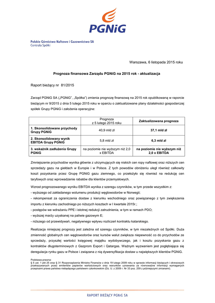 Warszawa, 6 listopada 2015 roku Prognoza finansowa Zarządu PGNiG na 2015 rok - aktualizacja Raport bieżący nr 81/2015 Zarząd PGNiG SA („PGNiG”, „Spółka”) zmienia prognozę finansową na 2015 rok opublikowaną w raporcie bieżącym nr 9/2015 z dnia 5 lutego 2015 roku w oparciu o zaktualizowane plany działalności gospodarczej spółek Grupy PGNiG i założenia operacyjne: Prognoza z 5 lutego 2015 roku Zaktualizowana prognoza 1. Skonsolidowane przychody Grupy PGNiG 40,9 mld zł 37,1 mld zł 2. Skonsolidowany wynik EBITDA Grupy PGNiG 5,8 mld zł 6,3 mld zł na poziomie nie wyższym niż 2,0 x EBITDA na poziomie nie wyższym niż 2,0 x EBITDA 3. wskaźnik zadłużenia Grupy PGNiG Zmniejszenie przychodów wynika głównie z utrzymujących się niskich cen ropy naftowej oraz niższych cen sprzedaży gazu na giełdach w Europie i w Polsce. Z tych powodów obniżeniu uległ również całkowity koszt pozyskania przez Grupę PGNiG gazu ziemnego, co przełożyło się również na redukcję cen taryfowych oraz wprowadzenie rabatów dla klientów przemysłowych. Wzrost prognozowanego wyniku EBITDA wynika z szeregu czynników, w tym przede wszystkim z: - wyższego od zakładanego wolumenu produkcji węglowodorów w Norwegii; - rekompensat za ograniczenia dostaw z kierunku wschodniego oraz powiązanego z tym zwiększenia importu z kierunku zachodniego po niższych kosztach w I kwartale 2015r.; - postępów we wdrażaniu PPE i istotnej redukcji zatrudnienia, w tym w ramach PDO; - wyższej marży uzyskanej na paliwie gazowym E; - niższego od przewidywań, negatywnego wpływu rozliczeń kontraktu katarskiego. Realizacja niniejszej prognozy jest zależna od szeregu czynników, w tym niezależnych od Spółki. Duża zmienność globalnych cen węglowodorów oraz kursów walut zwiększa niepewność co do przychodów ze sprzedaży, przyszłej wartości księgowej majątku wydobywczego, jak i kosztu pozyskania gazu z kontraktów długoterminowych z Gazprom Export i Qatargas. Ważnym wyzwaniem jest pogłębiająca się deregulacja rynku gazu w Polsce i związana z nią dywersyfikacja dostaw u największych klientów PGNiG. Podstawa prawna: § 5 ust. 1 pkt 25 oraz § 31 Rozporządzenia Ministra Finansów z dnia 19 lutego 2009 roku w sprawie informacji bieżących i okresowych przekazywanych przez emitentów papierów wartościowych oraz warunków uznawania za równoważne informacji wymaganych przepisami prawa państwa niebędącego państwem członkowskim (Dz. U. z 2009 r. Nr 33 poz. 259 z późniejszymi zmianami).