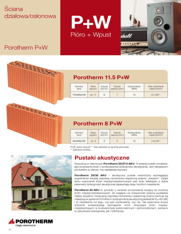 Ściana dziatowa/ostonowa Pióro + Wpust datę Porotherm P+W Porotherm 11.5 P+W Wymiary (mm) Masa (kg/szt.) Zużycie (szt./m2) Zużycie zaprawy (l/m2) Wytrzymałość (MPa) Wsp. przenikania ciepła (W/m2K) 115x498x238 ok. 11 8 7 10 U=1,83" Porotherm 8 P+W Wymiary (mm) Masa (kg/szt.) Zużycie (szt./m2) Zużycie zaprawy (l/m2) Wytrzymałość (MPa) Wsp. przenikania ciepła (W/m2K) 80x498x238 ok. 9 8 5 10 U=2,33" P+W „pióro+wpust” - bez zaprawy w spoinie pionowej. ** Zaprawa zwykła. Pustaki akustyczne Nowością w ofercie jest Porotherm 25/37.5 AKU. To kolejny pustak umożliwia jący budowanie ścian o podwyższonej izolacyjności akustycznej. Jest najcięższym produktem w ofercie i ma największe wymiary. Porotherm 25/30 AKU - akustyczny pustak ceramiczny wymagający wypełnienia zwykłą zaprawą cementowo-wapienną jedynie „kieszeni”. Dzięki temu wykonanie ścian międzymieszkaniowych jest dużo łatwiejsze, a dobre parametry izolacyjności akustycznej zapewniają ciszę i komfort mieszkania. Porotherm 25 AKU to produkt z ceramiki poryzowanej służący do budowy ścian międzymieszkaniowych. Ze względu na masywność (otwory pustaków należy wypełnić tradycyjną zaprawą cementowo-wapienną) ściana cechuje się najlepszą w systemie Porotherm izolacyjnością akustyczną (wskaźnik Rw=60 dB), i to niezależnie od tego, czy jest otynkowana, czy nie. Tak wykonane ściany znacznie przewyższają wymagania norm dotyczące ścian między mieszkaniowych w budownictwie wielorodzinnym i jednorodzinnym, zarówno w zabudowie szeregowej, jak i bliźniaczej. 4f POROTHERM Cegły ceramiczne 20