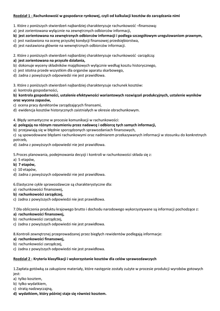 Rozdział 1 - Rachunkowość w gospodarce rynkowej, czyli od kalkulacji kosztów do zarządzania nimi 1. Które z poniższych stwierdzeń najbardziej charakteryzuje rachunkowość ¬finansową: a) jest zorientowana wyłącznie na zewnętrznych odbiorców informacji, b) jest zorientowana na zewnętrznych odbiorców informacji i podlega szczegółowym uregulowaniom prawnym, c) jest nastawiona na ocenę przyszłej kondycji finansowej przedsiębiorstwa, d) jest nastawiona głównie na wewnętrznych odbiorców informacji. 2. Które z poniższych stwierdzeń najbardziej charakteryzuje rachunkowość zarządczą: a) jest zorientowana na przyszłe działania, b) dokonuje wyceny składników majątkowych wyłącznie według kosztu historycznego, c) jest istotna przede wszystkim dla organów aparatu skarbowego, d) żadna z powyższych odpowiedzi nie jest prawidłowa. 3. Które z poniższych stwierdzeń najbardziej charakteryzuje rachunek kosztów: a) kontrola gospodarności, b) kontrola gospodarności, ustalenie efektywności wariantowych rozwiązań produkcyjnych, ustalenie wyników oraz wycena zapasów, c) ocena pracy dyrektorów zarządzających finansami, d) ewidencja kosztów historycznych zaistniałych w okresie obrachunkowym. 4. Błędy semantyczne w procesie komunikacji w rachunkowości: a) polegają na różnym rozumieniu przez nadawcę i odbiorcę tych samych informacji, b) przejawiają się w błędnie sporządzonych sprawozdaniach finansowych, c) są spowodowane błędami rachunkowymi oraz nadmiarem przekazywanych informacji w stosunku do konkretnych potrzeb, d) żadna z powyższych odpowiedzi nie jest prawidłowa. 5.Proces planowania, podejmowania decyzji i kontroli w rachunkowości składa się z: a) 5 etapów, b) 7 etapów, c) 10 etapów, d) żadna z powyższych odpowiedzi nie jest prawidłowa. 6.Elastyczne cykle sprawozdawcze są charakterystyczne dla: a) rachunkowości finansowej, b) rachunkowości zarządczej, c) żadna z powyższych odpowiedzi nie jest prawidłowa. 7.Dla obliczenia produktu krajowego brutto i dochodu narodowego wykorzystywane są informacji pochodzące z: a) rachunkowości finansowej, b) rachunkowości zarządczej, c) żadna z powyższych odpowiedzi nie jest prawidłowa. 8.Kontroli zewnętrznej przeprowadzanej przez biegłych rewidentów podlegają informacje: a) rachunkowości finansowej, b) rachunkowości zarządczej, c) żadna z powyższych odpowiedzi nie jest prawidłowa. Rozdział 2 - Kryteria klasyfikacji i wykorzystanie kosztów dla celów sprawozdawczych 1.Zapłata gotówką za zakupione materiały, które następnie zostały zużyte w procesie produkcji wyrobów gotowych jest: a) tylko kosztem, b) tylko wydatkiem, c) stratą nadzwyczajną, d) wydatkiem, który później staje się również kosztem. 2. Układ rodzajowy kosztów obejmuje: a) wszystkie koszty poniesione w danym okresie sprawozdawczym bez wskazania komórek organizacyjnych, w których je poniesiono, ani też produktów na które zostały one poniesione, b) tylko pozostałe koszty operacyjne, c) podatek dochodowy od osób prawnych, d) koszty związane z płatnością odsetek od przeterminowanych zobowiązań. 3. W ramach funkcjonalnego układu kosztów wyróżnia się m. in.: a) koszty zakupu, b) koszty zakupu, koszty produkcji, koszty ogólnego zarządu, koszty sprzedaży, c) koszty finansowe, d) straty nadzwyczajne. 4.Techniczny koszt wytworzenia wyrobów gotowych obejmuje: a) koszty bezpośrednie, b) koszty sprzedaży, c) koszty wydziałowe, d) koszty bezpośrednie i koszty wydziałowe, e) żadna z powyższych odpowiedzi nie jest prawidłowa. 5.Zmiana stanu produktów występuje w rachunku zysków i strat w wersji: a) kalkulacyjnej, b) porównawczej, c) porównawczej i kalkulacyjnej, d) żadna z powyższych odpowiedzi nie jest prawidłowa. 6.Koszty wytworzenia produktów sprzedanych ustalamy według formuły: a) zapas początkowy produktów plus koszty wytworzenia produktów minus zapas końcowy produktów, b) zapas początkowy produktów plus koszty wytworzenia produktów minus koszty produkcji w toku, c) materiały bezpośrednie plus koszty produkcji w toku plus koszty wydziałowe, d) żadna z powyższych odpowiedzi nie jest prawidłowa. 7.Jaka jest wartość zapasu początkowego produktów, jeżeli wiadomo, że zapas końcowy wyceniono na 20 000 zł, koszty produkcji wynoszą 80 000 zł, a koszty produkcji sprzedanej 90 000 zł? a) 30 000 zł, b) 10 000 zł, c) 100 000 zł, d) żadna z powyższych odpowiedzi nie jest prawidłowa. 8.Cena nabycia materiałów obejmuje: a) cenę zakupu, b) cenę zakupu i koszty zakupu, c) cenę zakupu, koszty zakupu i podatek VAT, d) żadna z powyższych odpowiedzi nie jest prawidłowa. 9.Metoda FIFO zakłada że: a) materiały zakupione najwcześniej są zużywane w pierwszej kolejności, b) najpierw zużywamy materiały, które zostały zakupione najpóźniej, c) w pierwszej kolejności są zużywane materiały zakupione po najwyższej cenie, d) wycena jest dokonywana według średniej ceny, e) żadna z powyższych odpowiedzi nie jest prawidłowa. 10.Polskie prawo bilansowe zezwala na wycenę zużycia materiałów przy zastosowaniu metody: a) LIFO, HOFO, HIFO, b) LIFO, FIFO, ceny średnioważone, c) LIFO, ceny średnioważone, HIFO, d) ceny średnioważone, e) żadna z powyższych odpowiedzi nie jest prawidłowa. 11. Przy normatywnym okresie użytkowania środka trwałego wynoszącym 8 lat stopa amortyzacji wynosi: a) 8%, b) 12,5%, c) 12%, d) żadna z powyższych odpowiedzi nie jest prawidłowa. 12.Przy normatywnym okresie użytkowania środka trwałego wynoszącym 8 lat, wartości początkowej 250 000,00 zł i liniowej stopie amortyzacji, wartość netto środka trwałego po 42 miesiącach użytkowania będzie wynosiła: a) 187 500,00 zł, b) 140 625,00 zł, c) 109 375,00 zł, d) żadna z powyższych odpowiedzi nie jest prawidłowa. 13.Maszyna A amortyzowana jest według stopy 10% metodą liniową. Wartość brutto wynosi 20 000,00 zł, a kwota roczne