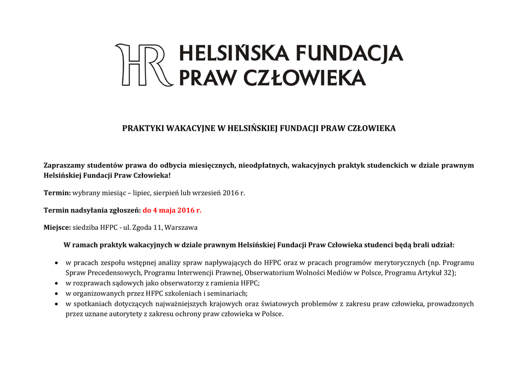 PRAKTYKI WAKACYJNE W HELSIŃSKIEJ FUNDACJI PRAW CZŁOWIEKA Zapraszamy studentów prawa do odbycia miesięcznych, nieodpłatnych, wakacyjnych praktyk studenckich w dziale prawnym Helsińskiej Fundacji Praw Człowieka! Termin: wybrany miesiąc – lipiec, sierpień lub wrzesień 2016 r. Termin nadsyłania zgłoszeń: do 4 maja 2016 r. Miejsce: siedziba HFPC - ul. Zgoda 11, Warszawa W ramach praktyk wakacyjnych w dziale prawnym Helsińskiej Fundacji Praw Człowieka studenci będą brali udział: w pracach zespołu wstępnej analizy spraw napływających do HFPC oraz w pracach programów merytorycznych (np. Programu Spraw Precedensowych, Programu Interwencji Prawnej, Obserwatorium Wolności Mediów w Polsce, Programu Artykuł 32); w rozprawach sądowych jako obserwatorzy z ramienia HFPC; w organizowanych przez HFPC szkoleniach i seminariach; w spotkaniach dotyczących najważniejszych krajowych oraz światowych problemów z zakresu praw człowieka, prowadzonych przez uznane autorytety z zakresu ochrony praw człowieka w Polsce. Z przyjemnością pragniemy również poinformować, że od wakacyjnych praktyk studenckich w 2016 r. studenci będą mieli możliwość uczestnictwa w cyklach warsztatów szkoleniowych, m.in. w 10-godzinnym cyklu warsztatów w zakresie sporządzania skargi do Europejskiego Trybunału Praw Człowieka. Warsztaty szkoleniowe będą prowadzone przez uznanych ekspertów, zaś za ich pomyślne ukończenie studenci otrzymają certyfikaty. W ramach odbywanych praktyk, studenci prawa będą objęci merytoryczną opieką pracowników działu prawnego HFPC. Praktyki wakacyjne w HFPC są podstawą do zaliczenia obowiązkowych praktyk studenckich. Dzięki praktykom w Helsińskiej Fundacji Praw Człowieka studenci prawa mogą: pomagać ofiarom naruszeń praw człowieka oraz dowiedzieć się na czym polegają aktywne działania na rzecz ochrony praw człowieka w Polsce; zetknąć się z precedensowymi sprawami sądowymi i administracyjnymi; zrozumieć jak prawa człowieka przenikają różne dziedziny prawa; poznać jednych z najlepszych ekspertów z zakresu praw człowieka w Polsce; zdobyć umiejętności praktyczne i wiedzę, które mogą być przydatne przy wykonywaniu różnych zawodów prawniczych oraz pracy w urzędach lub kancelariach. Zgłoszenia wraz z CV oraz krótkim opisem, dlaczego chcieliby Państwo odbywać praktyki w HFPC prosimy wysyłać na adres mailowy: [email protected]. Do wybranych kandydatów zwrócimy się z prośbą o przygotowanie odpowiedzi na kazus, a następnie przeprowadzimy rozmowę kwalifikacyjną.