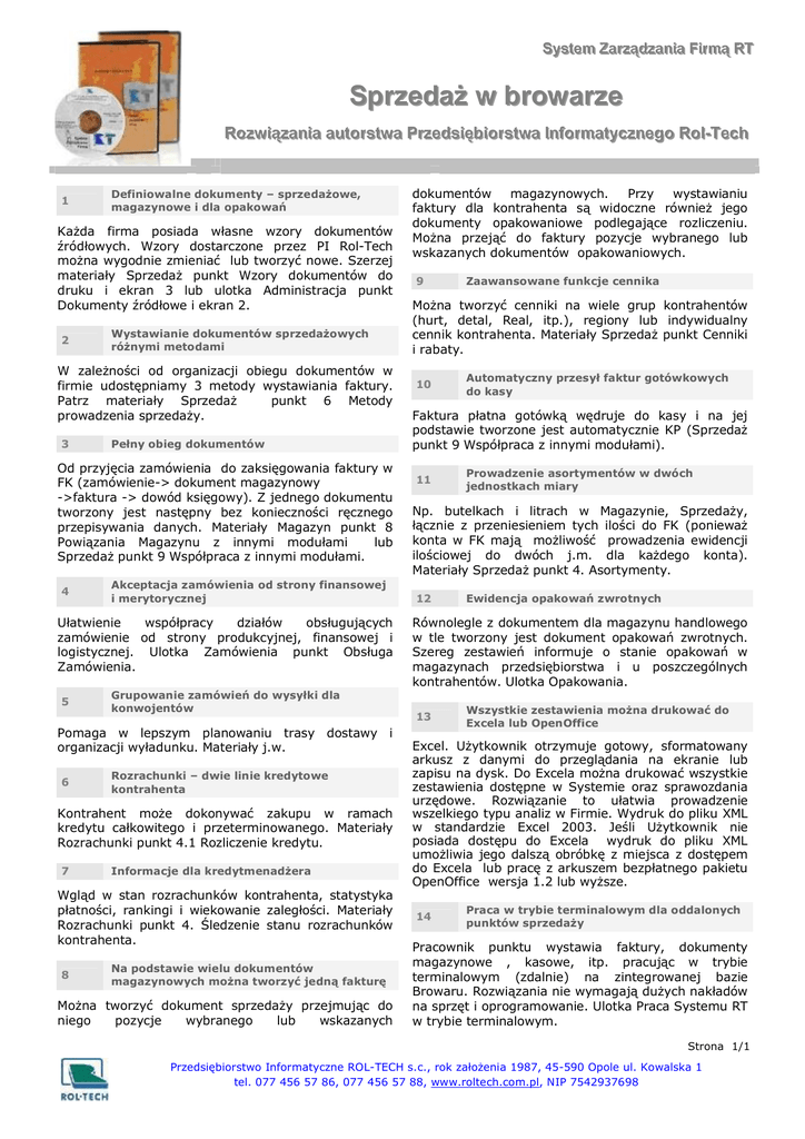 SSyysstteem m ZZaarrzząąddzzaanniiaa FFiirrm mąą R RTT Sprzedaż w browarze R Roozzw wiiąązzaanniiaa aauuttoorrssttw waa P Prrzzeeddssiięębbiioorrssttw waa IInnffoorrm maattyycczznneeggoo R Rooll--TTeecchh 1 Definiowalne dokumenty – sprzedażowe, magazynowe i dla opakowań Każda firma posiada własne wzory dokumentów źródłowych. Wzory dostarczone przez PI Rol-Tech można wygodnie zmieniać lub tworzyć nowe. Szerzej materiały Sprzedaż punkt Wzory dokumentów do druku i ekran 3 lub ulotka Administracja punkt Dokumenty źródłowe i ekran 2. 2 Wystawianie dokumentów sprzedażowych różnymi metodami W zależności od organizacji obiegu dokumentów w firmie udostępniamy 3 metody wystawiania faktury. Patrz materiały Sprzedaż punkt 6 Metody prowadzenia sprzedaży. 3 Pełny obieg dokumentów Od przyjęcia zamówienia do zaksięgowania faktury w FK (zamówienie-> dokument magazynowy ->faktura -> dowód księgowy). Z jednego dokumentu tworzony jest następny bez konieczności ręcznego przepisywania danych. Materiały Magazyn punkt 8 Powiązania Magazynu z innymi modułami lub Sprzedaż punkt 9 Współpraca z innymi modułami. 4 Akceptacja zamówienia od strony finansowej i merytorycznej Ułatwienie współpracy działów obsługujących zamówienie od strony produkcyjnej, finansowej i logistycznej. Ulotka Zamówienia punkt Obsługa Zamówienia. 5 Grupowanie zamówień do wysyłki dla konwojentów Pomaga w lepszym planowaniu trasy dostawy i organizacji wyładunku. Materiały j.w. 6 Rozrachunki – dwie linie kredytowe kontrahenta Kontrahent może dokonywać zakupu w ramach kredytu całkowitego i przeterminowanego. Materiały Rozrachunki punkt 4.1 Rozliczenie kredytu. 7 Informacje dla kredytmenadżera Wgląd w stan rozrachunków kontrahenta, statystyka płatności, rankingi i wiekowanie zaległości. Materiały Rozrachunki punkt 4. Śledzenie stanu rozrachunków kontrahenta. 8 Na podstawie wielu dokumentów magazynowych można tworzyć jedną fakturę Można tworzyć dokument sprzedaży przejmując do niego pozycje wybranego lub wskazanych dokumentów magazynowych. Przy wystawianiu faktury dla kontrahenta są widoczne również jego dokumenty opakowaniowe podlegające rozliczeniu. Można przejąć do faktury pozycje wybranego lub wskazanych dokumentów opakowaniowych. 9 Zaawansowane funkcje cennika Można tworzyć cenniki na wiele grup kontrahentów (hurt, detal, Real, itp.), regiony lub indywidualny cennik kontrahenta. Materiały Sprzedaż punkt Cenniki i rabaty. 10 Automatyczny przesył faktur gotówkowych do kasy Faktura płatna gotówką wędruje do kasy i na jej podstawie tworzone jest automatycznie KP (Sprzedaż punkt 9 Współpraca z innymi modułami). 11 Prowadzenie asortymentów w dwóch jednostkach miary Np. butelkach i litrach w Magazynie, Sprzedaży, łącznie z przeniesieniem tych ilości do FK (ponieważ konta w FK mają możliwość prowadzenia ewidencji ilościowej do dwóch j.m. dla każdego konta). Materiały Sprzedaż punkt 4. Asortymenty. 12 Ewidencja opakowań zwrotnych Równolegle z dokumentem dla magazynu handlowego w tle tworzony jest dokument opakowań zwrotnych. Szereg zestawień informuje o stanie opakowań w magazynach przedsiębiorstwa i u poszczególnych kontrahentów. Ulotka Opakowania. 13 Wszystkie zestawienia można drukować do Excela lub OpenOffice Excel. Użytkownik otrzymuje gotowy, sformatowany arkusz z danymi do przeglądania na ekranie lub zapisu na dysk. Do Excela można drukować wszystkie zestawienia dostępne w Systemie oraz sprawozdania urzędowe. Rozwiązanie to ułatwia prowadzenie wszelkiego typu analiz w Firmie. Wydruk do pliku XML w standardzie Excel 2003. Jeśli Użytkownik nie posiada dostępu do Excela wydruk do pliku XML umożliwia jego dalszą obróbkę z miejsca z dostępem do Excela lub pracę z arkuszem bezpłatnego pakietu OpenOffice wersja 1.2 lub wyższe. 14 Praca w trybie terminalowym dla oddalonych punktów sprzedaży Pracownik punktu wystawia faktury, dokumenty magazynowe , kasowe, itp. pracując w trybie terminalowym (zdalnie) na zintegrowanej bazie Browaru. Rozwiązania nie wymagają dużych nakładów na sprzęt i oprogramowanie. Ulotka Praca Systemu RT w trybie terminalowym. Strona 1/1 Przedsiębiorstwo Informatyczne ROL-TECH s.c., rok założenia 1987, 45-590 Opole ul. Kowalska 1 tel. 077 456 57 86, 077 456 57 88, www.roltech.com.pl, NIP 7542937698
